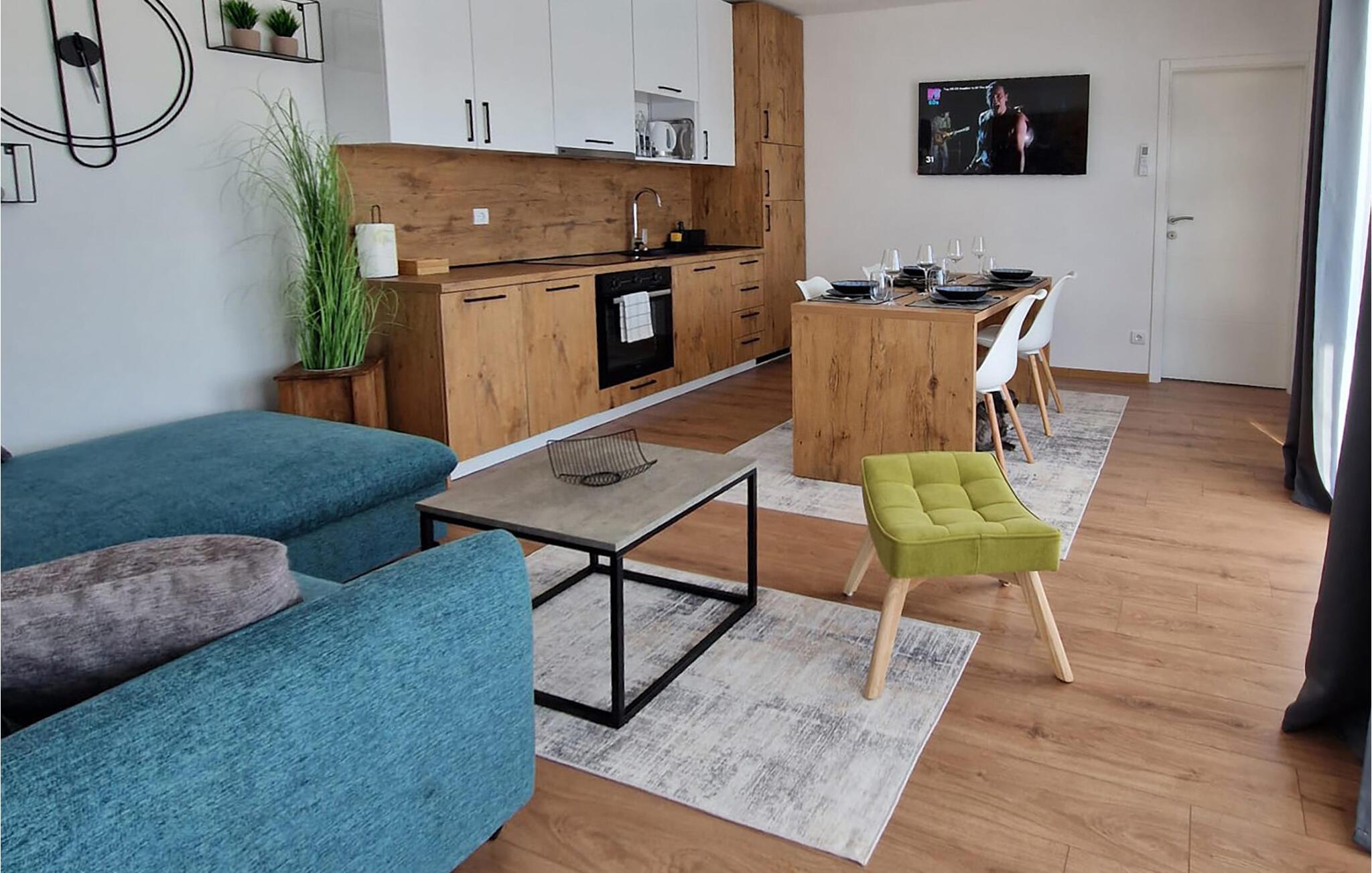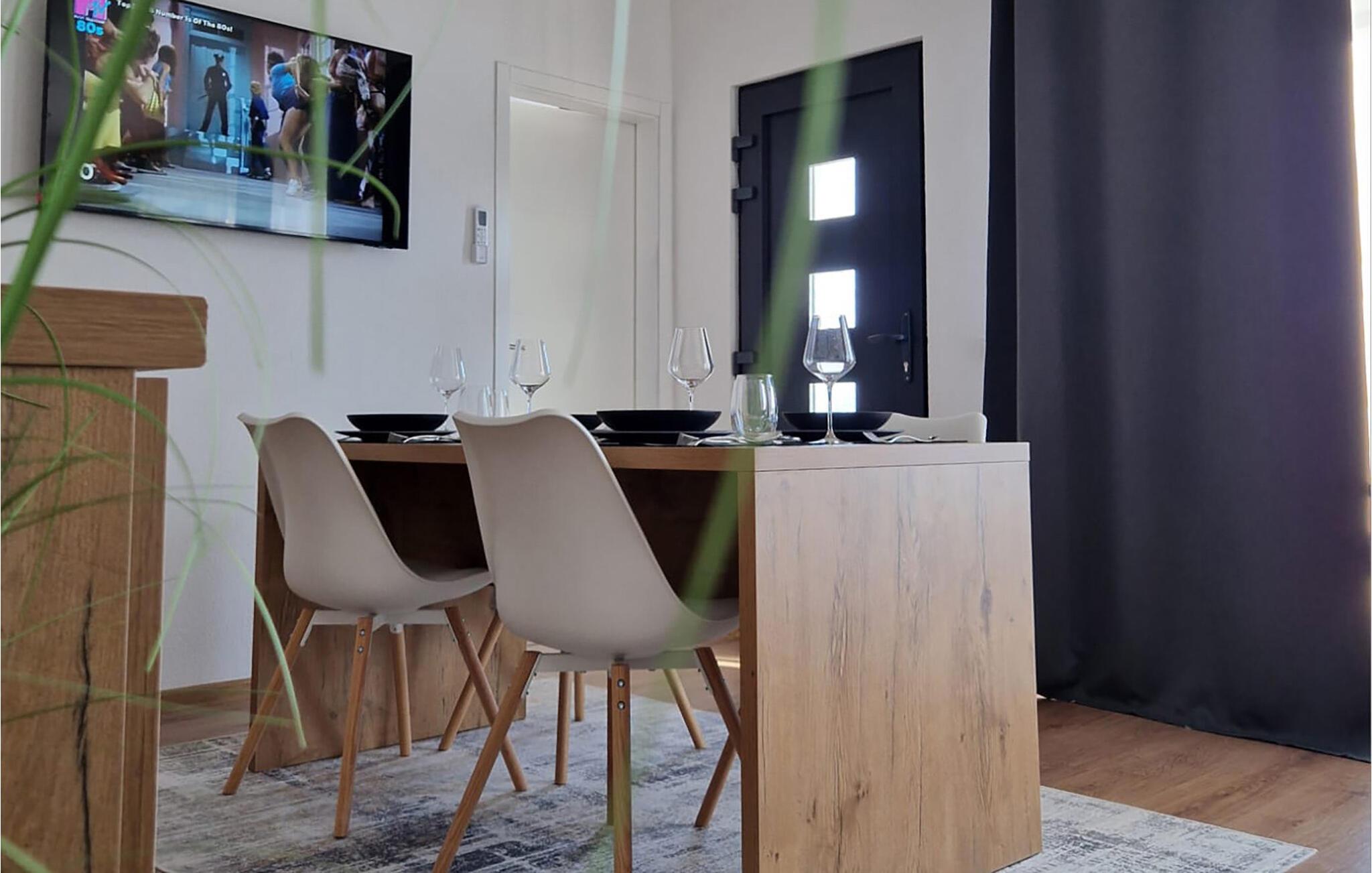 Kun en kort gåtur fra den smukke stenstrand kan I finde jer selv til rette i dette smagfuldt indrettede feriehus. Glæd jer til hyggelige madlavningsaftener i det åbne køkken, spis jeres måltider ved det indbydende spisebord, og om aftenen kan I streame en god serie eller slappe af med en bog i den hyggelige stue.