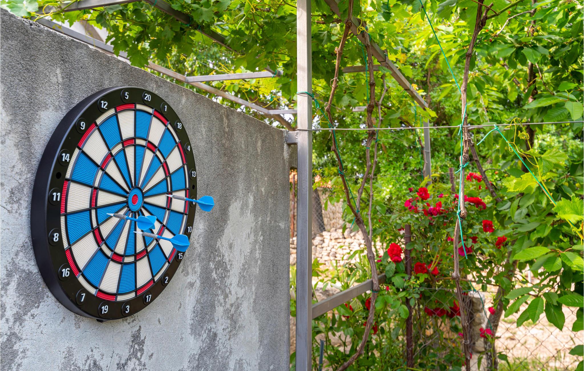 I husets udendørsområde kan I tilbringe hele dage udendørs. Solbadning i haven, mens børnene leger glade, en omgang dart udendørs eller med kolde drinks på terrassen, afslapning lader ikke vente på sig.