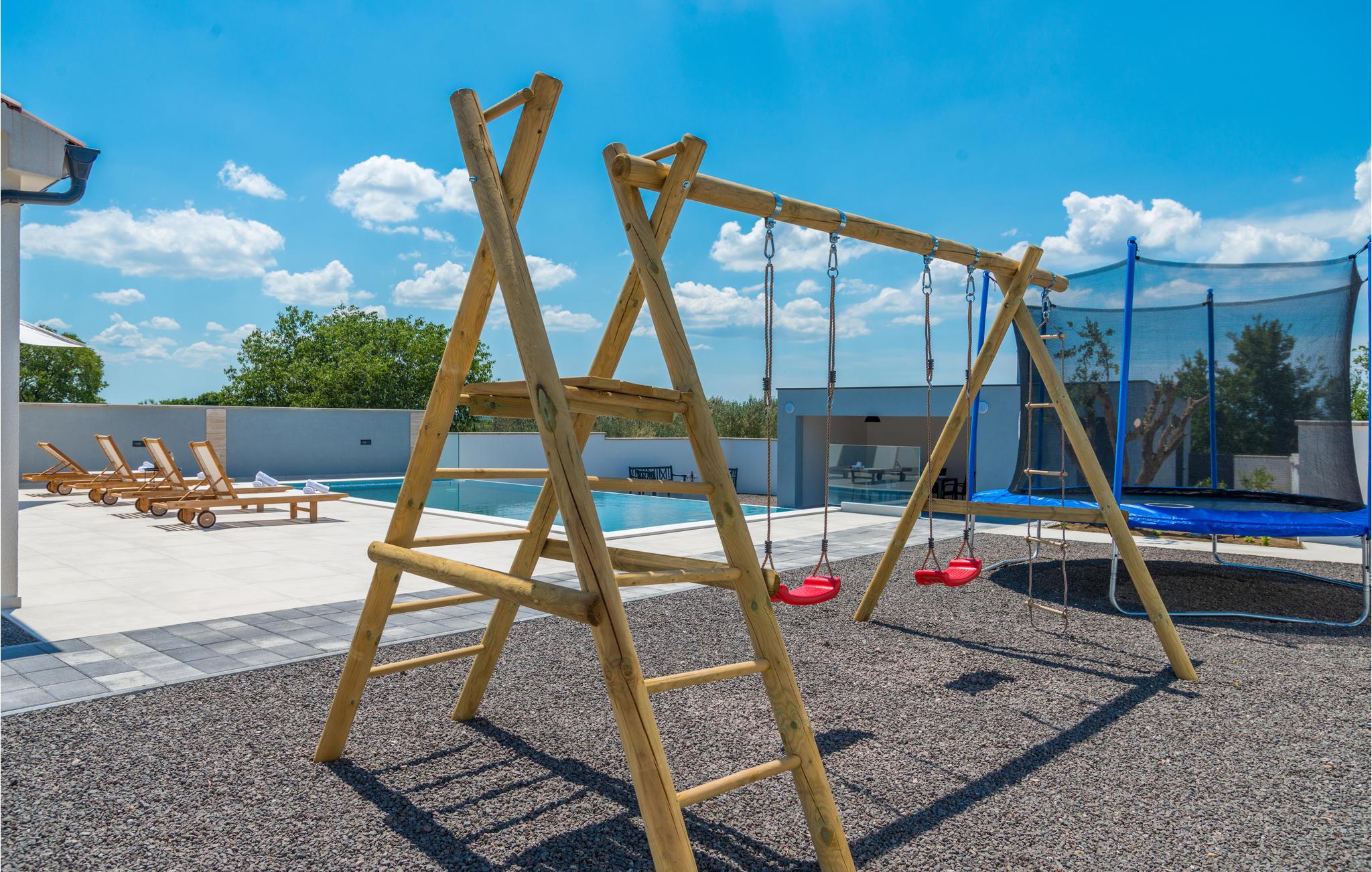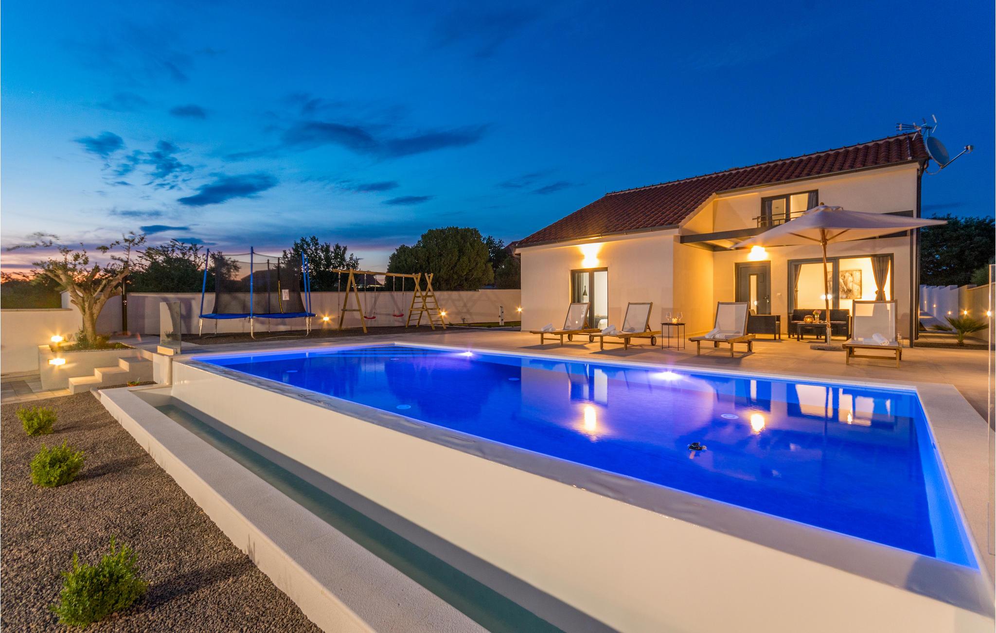 Fantastisk feriehus med infinity swimmingpool og farvevekslende lys, der skaber et harmonisk lysspil om aftenen. Huset ligger på en 930 m² naturgrund. Alle soveværelser har franske vinduer og en flot udsigt over området. Nyd ferien sammen med familien i opholdsrummet med pejs, borde, stole og tilhørende badeværelse. Udendørs kan I hygge jer foran bålstedet eller lave lækre grillretter.