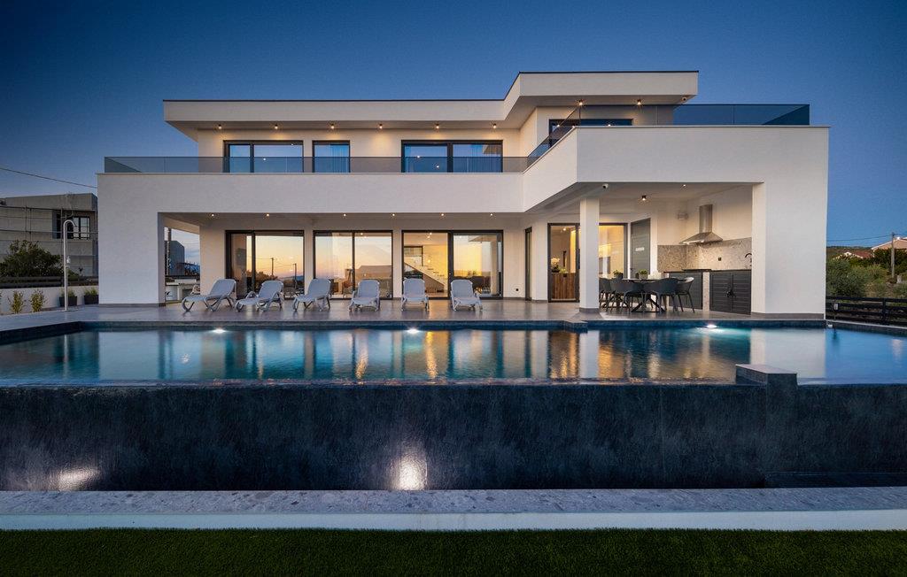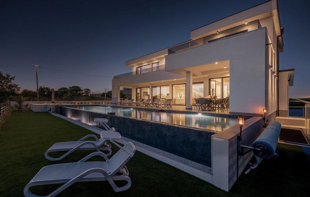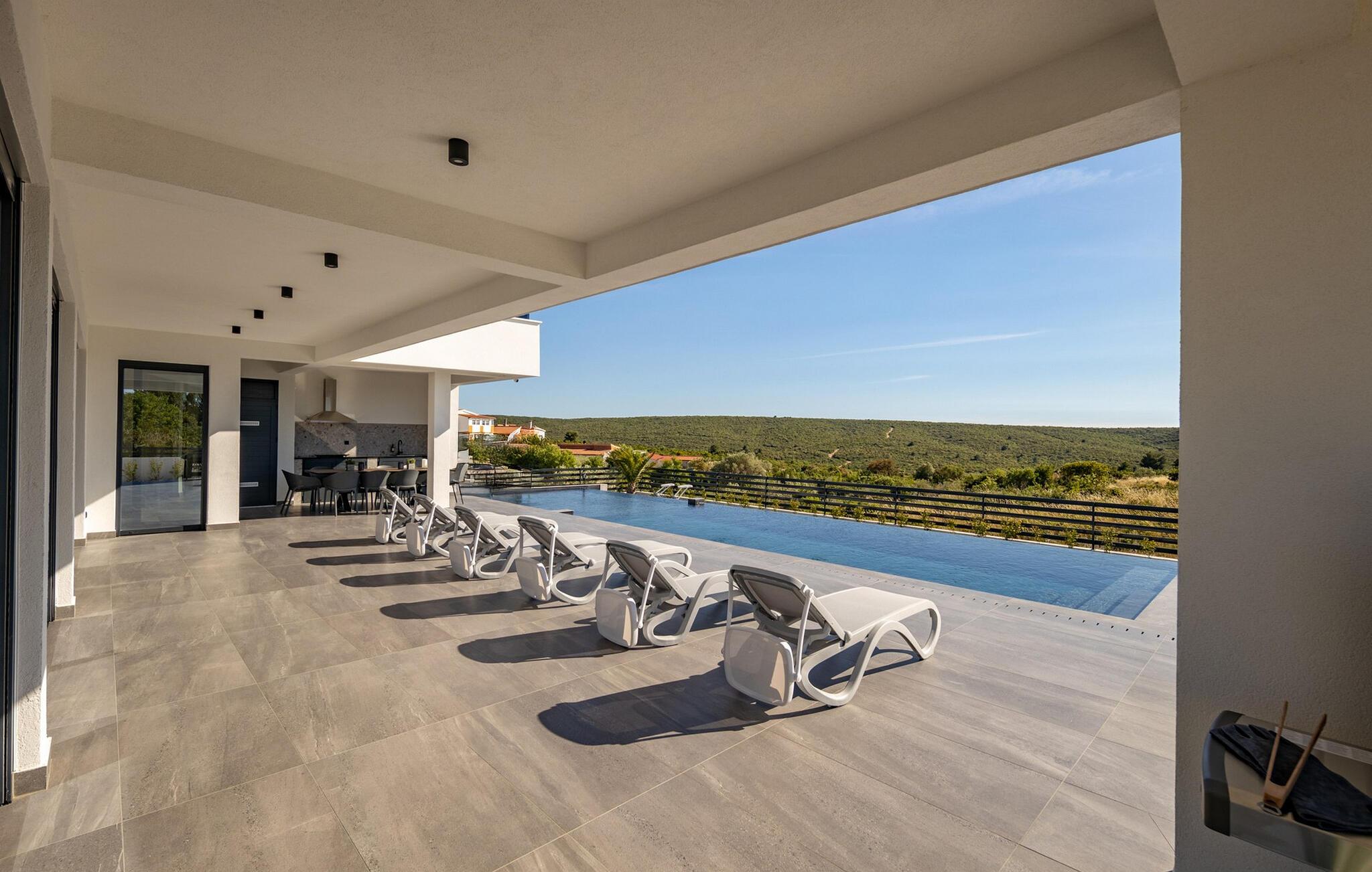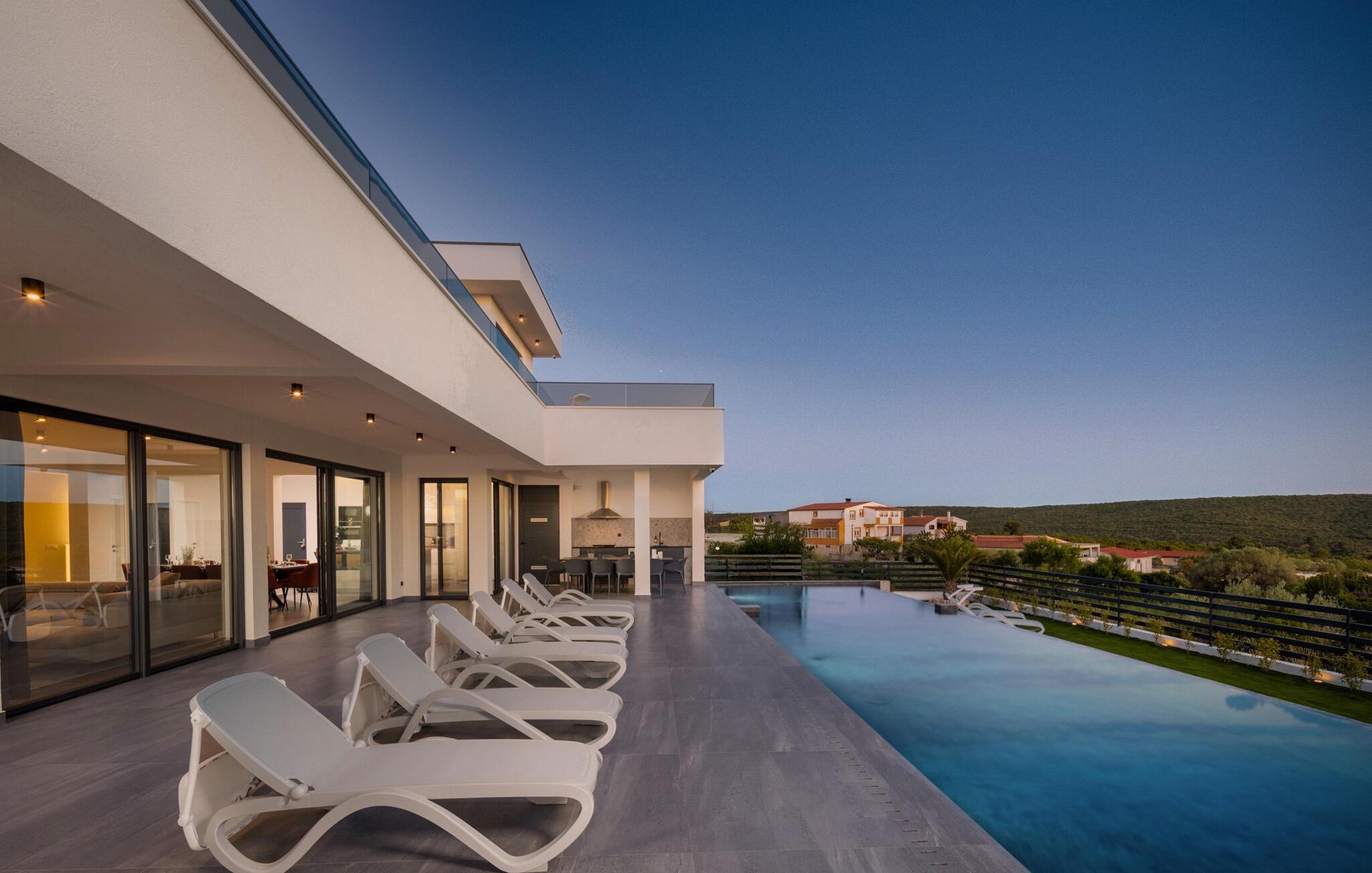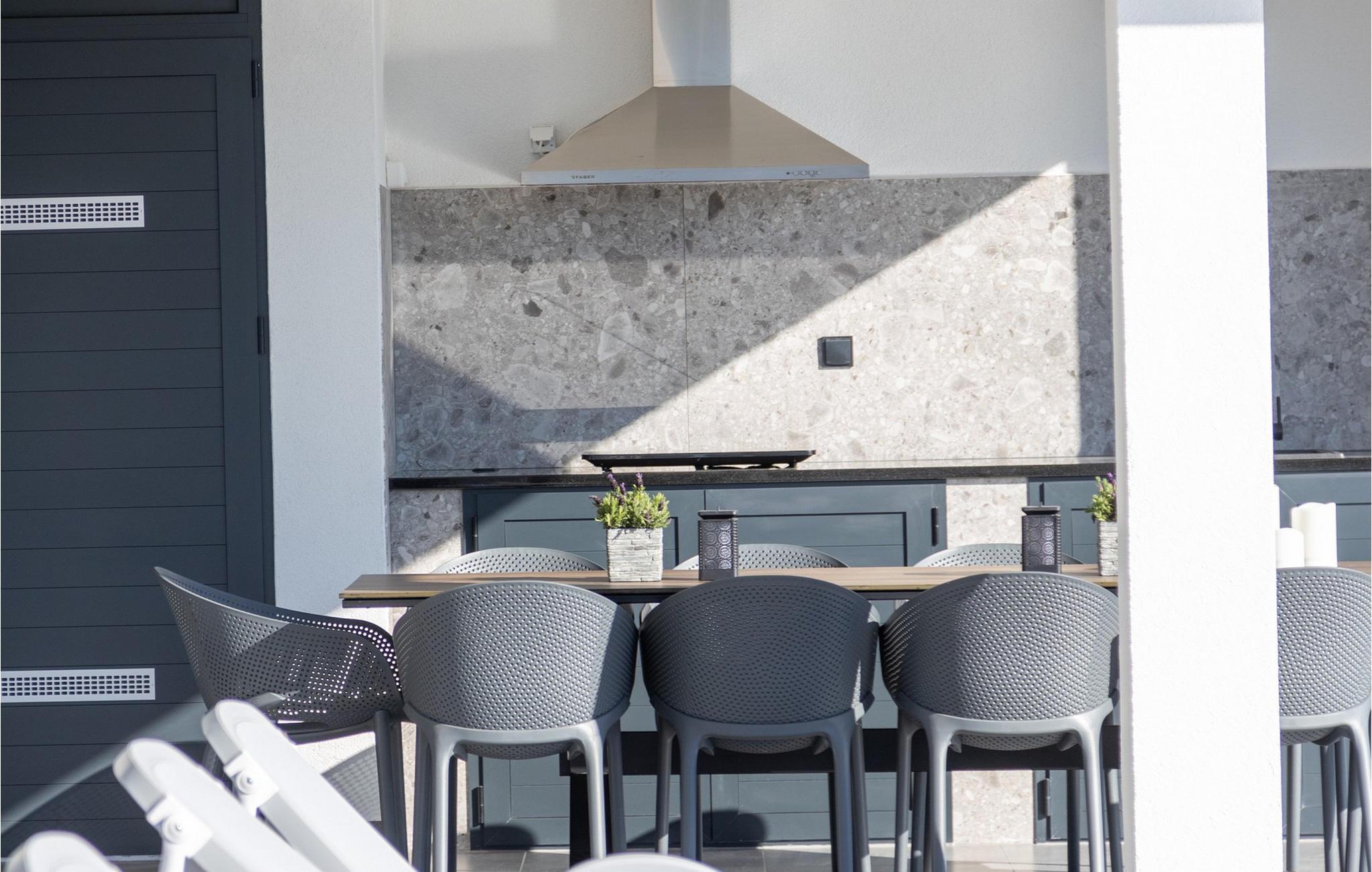Det elegante udendørsområde er perfekt til at nyde Kroatiens vidunderlige klima på alle tider af dagen. Svøm afslappende baner i den store pool, som er stemningsfuldt oplyst om aftenen og har et integreret lavvandet område. Nyd den fredelige atmosfære med morgenmad på terrassen og slap af på liggestolene, mens de små nyder det engagerende legeområde. Nyd en drink på den rummelige tagterrasse ved solnedgang med panoramaudsigt, der strækker sig helt til havet, og tilbered lækre tilbehør til grillmaden i sommerkøkkenet.