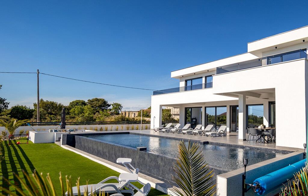 Nyd en hyggelig luksusferie i dette moderne feriehus med pool og havudsigt.