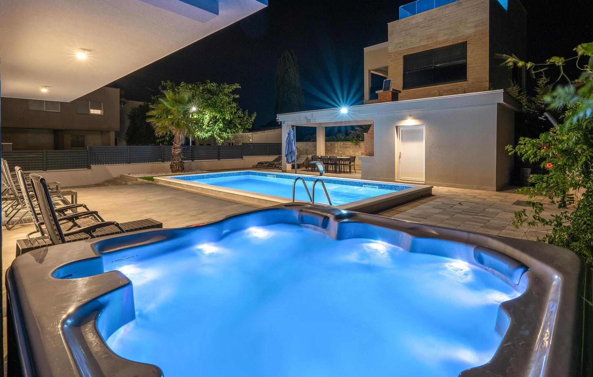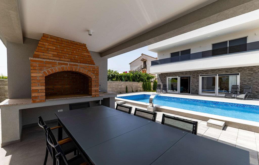 Nyd en forfriskende dukkert i poolen, og slap derefter af på liggestolene ved vandet. Brug den store indbyggede grill til at tilberede lækre dalmatiske specialiteter under åben himmel. Tilbring hyggelige stunder ved det overdækkede spisebord og nyd den varme middelhavsatmosfære udendørs.