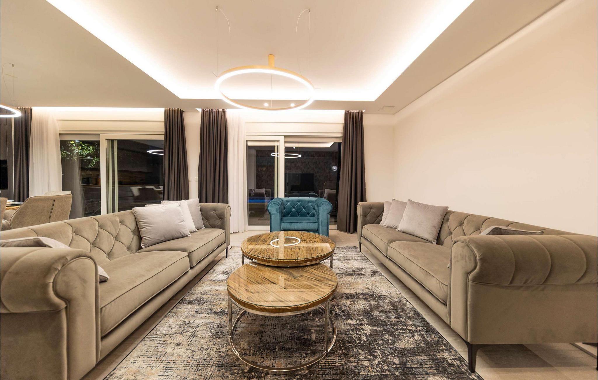 Villa Gina har en moderne atmosfære, hvor store vinduer, rene linjer og materialer af høj kvalitet skaber en elegant opholdsoplevelse. Nyd afslappende timer i den rummelige opholdsstue og nyd de rolige, lyse omgivelser med et glas vin. Del måltider ved det stilfulde spisebord eller tilbring hyggelige aftener med at spille bræt- og kortspil. find jer til rette i et af de komfortable sidde- eller loungeområder for at læse, lytte til musik eller blot slappe af.