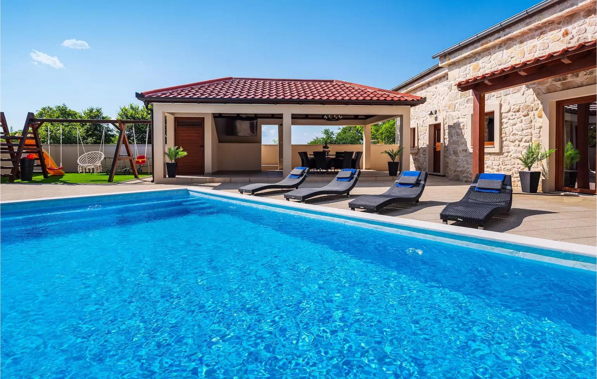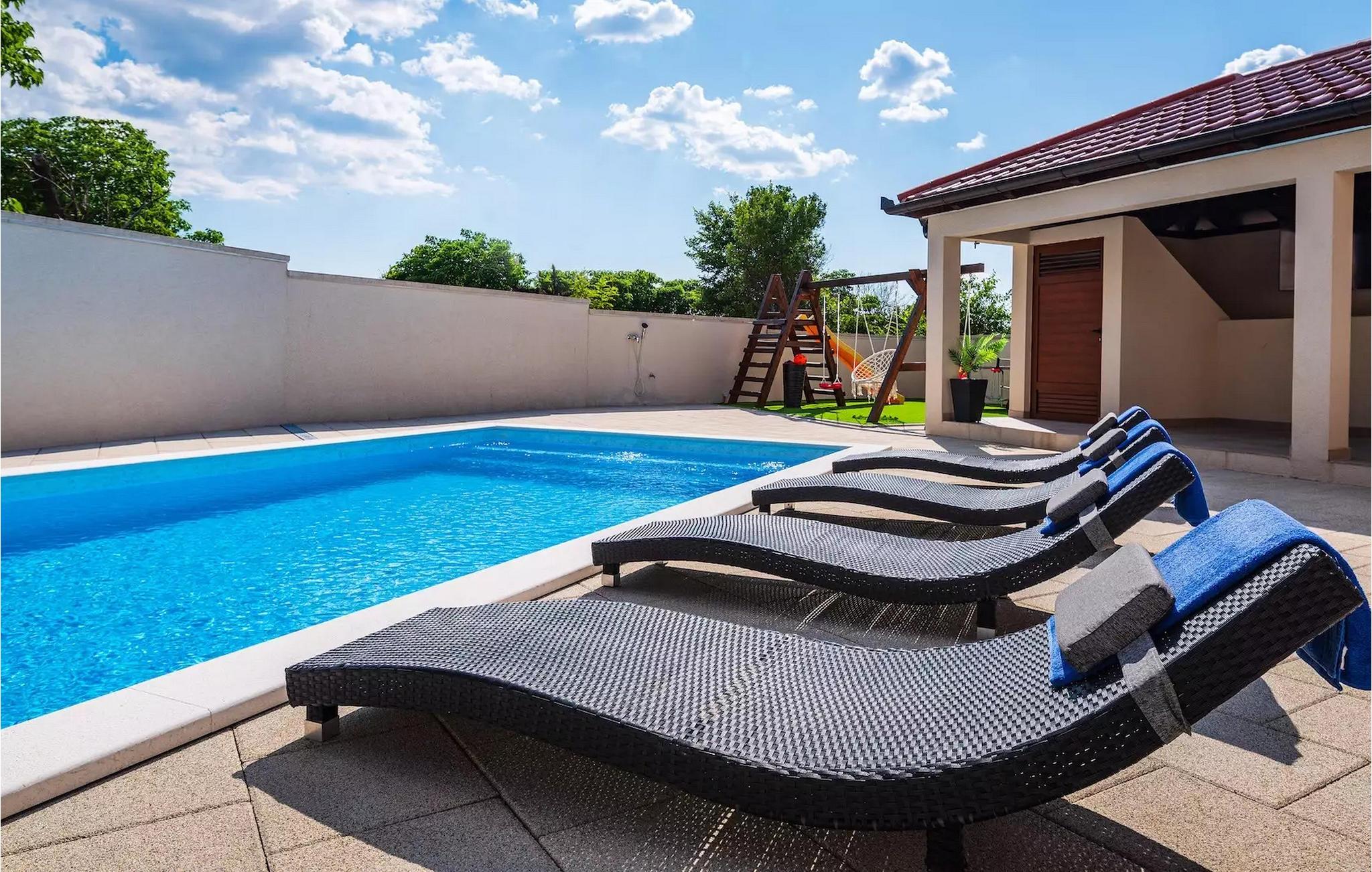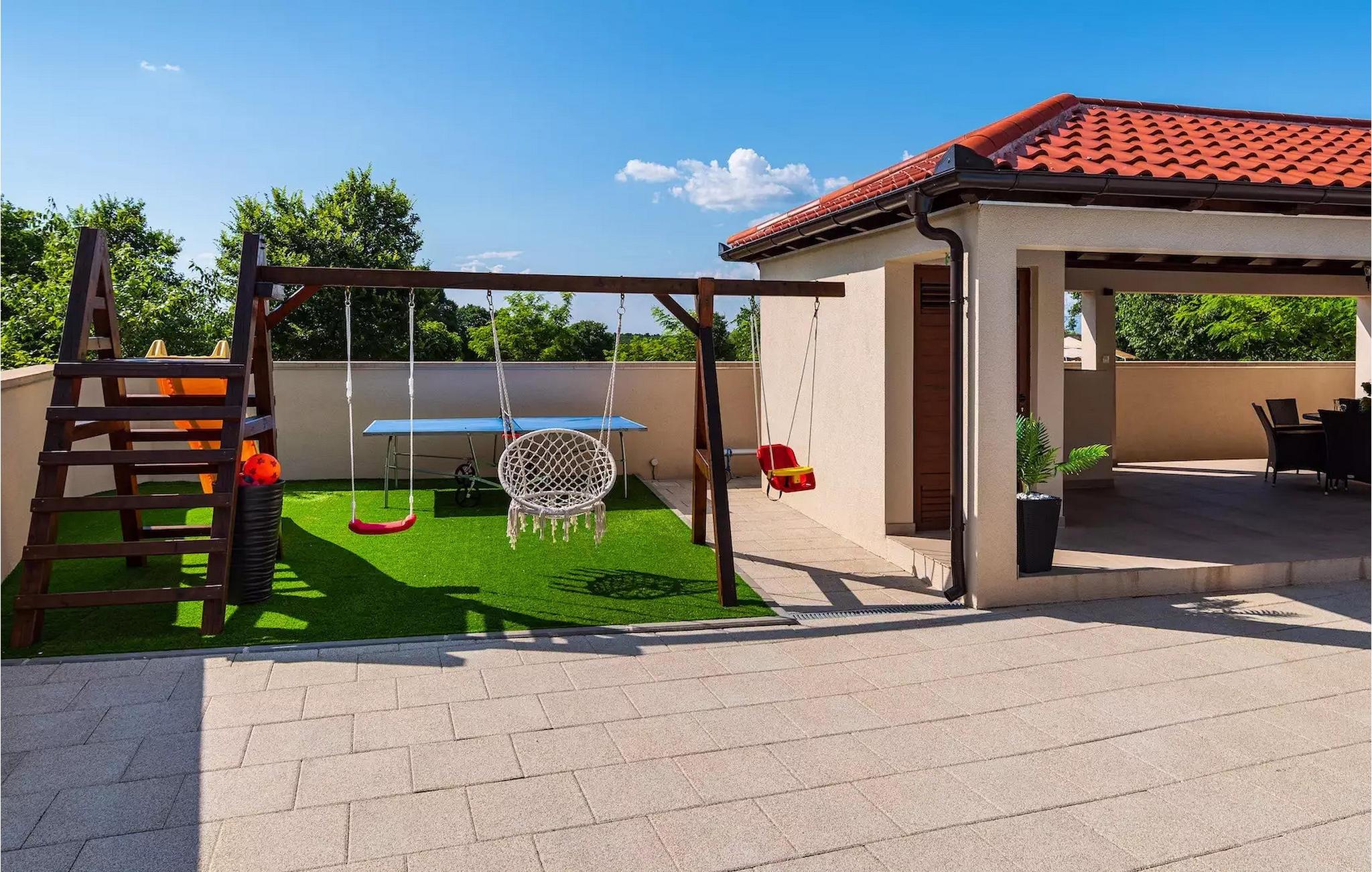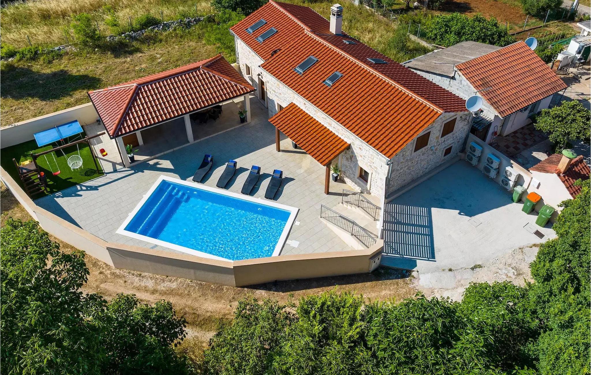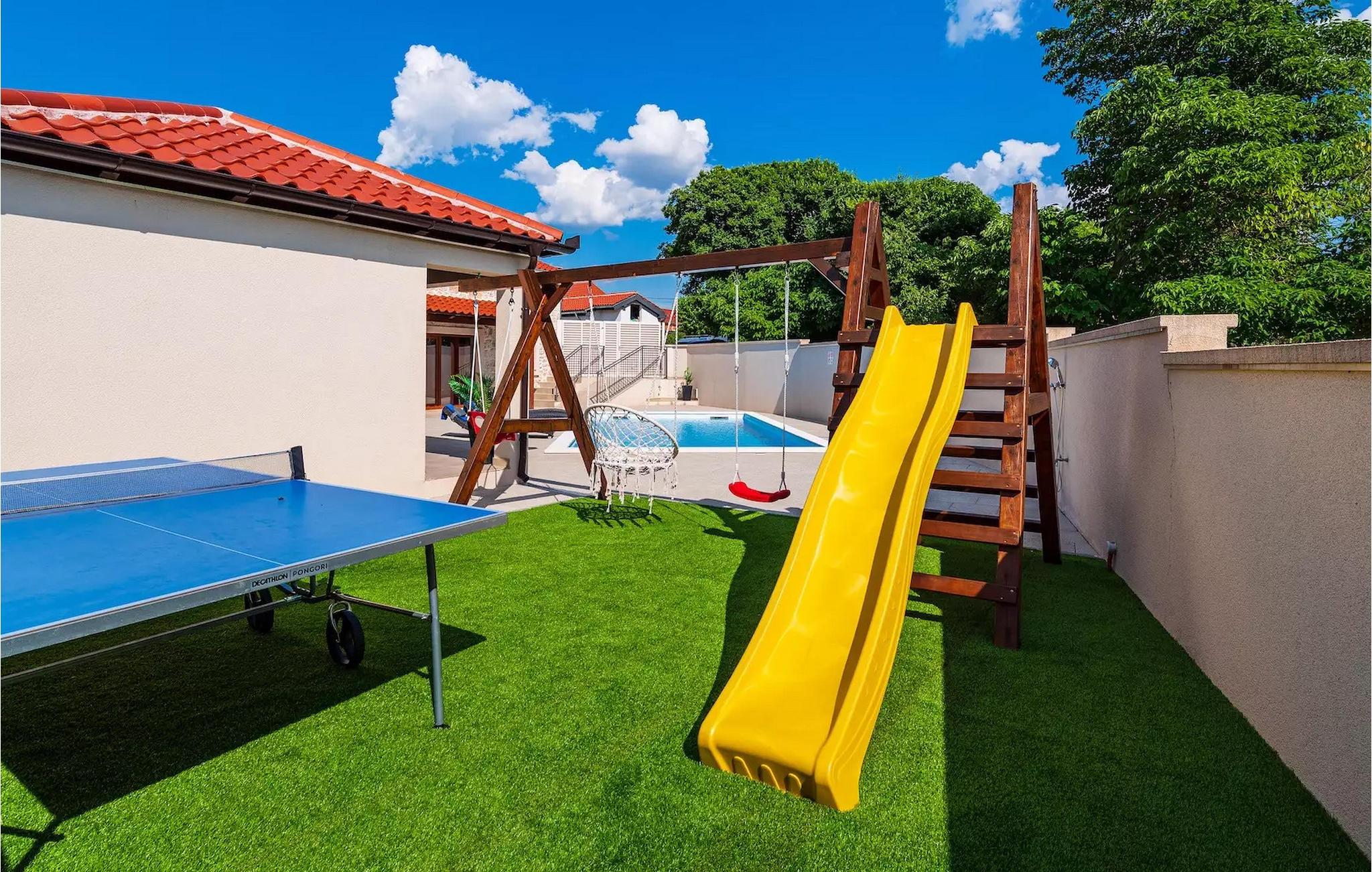 Haven har en privat pool, liggestole og en overdækket spiseplads, hvor du kan nyde dine dage med vennerne, mens dine børn leger på legepladsen. Fra haven har du også adgang til en charmerende lille værtshus med pejs og køkken, hvor du kan lave mad, træbænke til spisning samt tv og stereoanlæg, når du bare vil slappe af. Værtshuset har også et separat toilet.