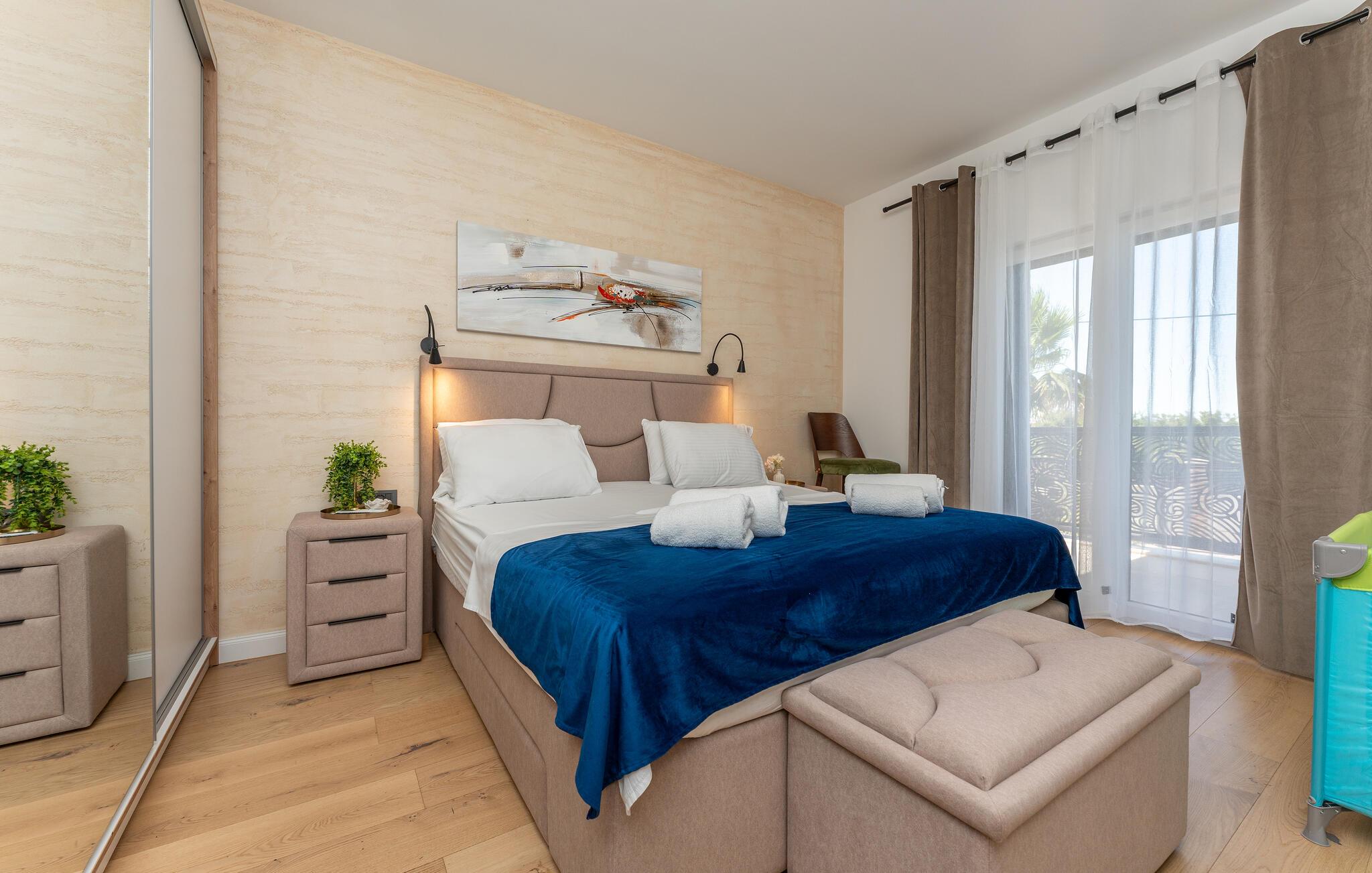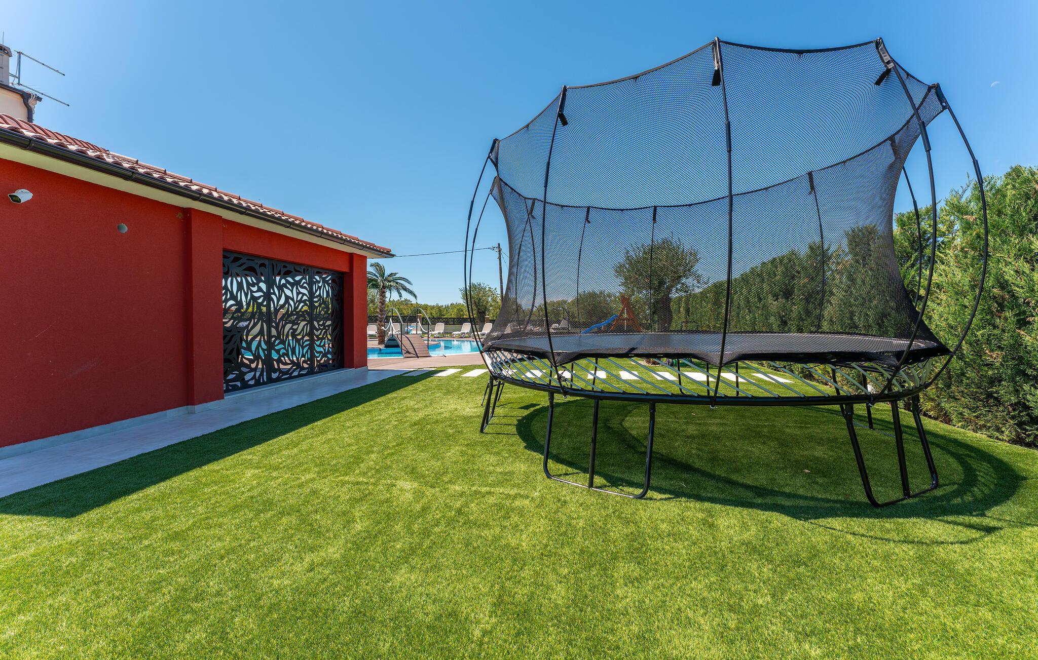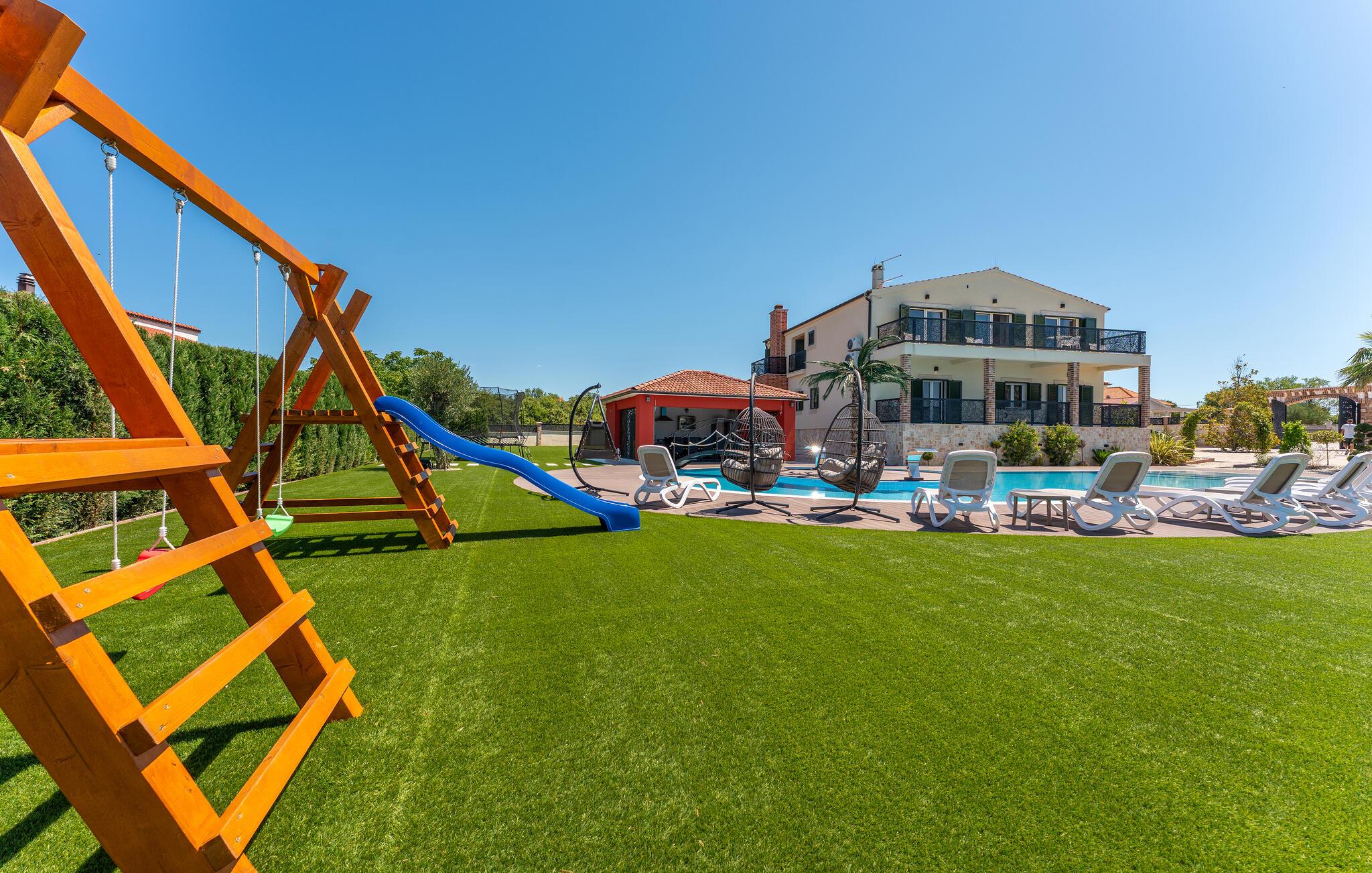 Oplev uforglemmelige ferier i dette stilfulde feriehus med pool nær havet. Dette elegant møblerede hus imponerer med et livligt farveskema, lyse værelser og en smuk træfinish. Hyg jer sammen i den indbydende sofagruppe, nyd afslappende timer med musik, eller tilbring en hyggelig filmaften sammen. Hvis I leder efter motion, kan I opbygge jeres udholdenhed og styrke i fitnessrummet. Start dagen med et par baner i den store pool eller en omgang vandpolo. Lad eftermiddagen passere i fred på en liggestol eller med en god bog, mens jeres børn morer sig på legeplads udenfor. Om aftenen kan I samles under den overdækkede terrasse til et lækkert måltid og nyde et glas fin kroatisk vin. Tag en tur til en af regionens smukke strande, hvor I kan nyde sol, hav og ren afslapning. Oplev de rolige omgivelser i Visocane på gåture eller cykelture gennem det dalmatiske landskab. Udforsk den historiske by Zadar med dens romerske monumenter, det unikke havorgel og den livlige atmosfære i den gamle bydel. Afslut dagen på en afslappet måde med en hyggelig middag og regionale specialiteter.