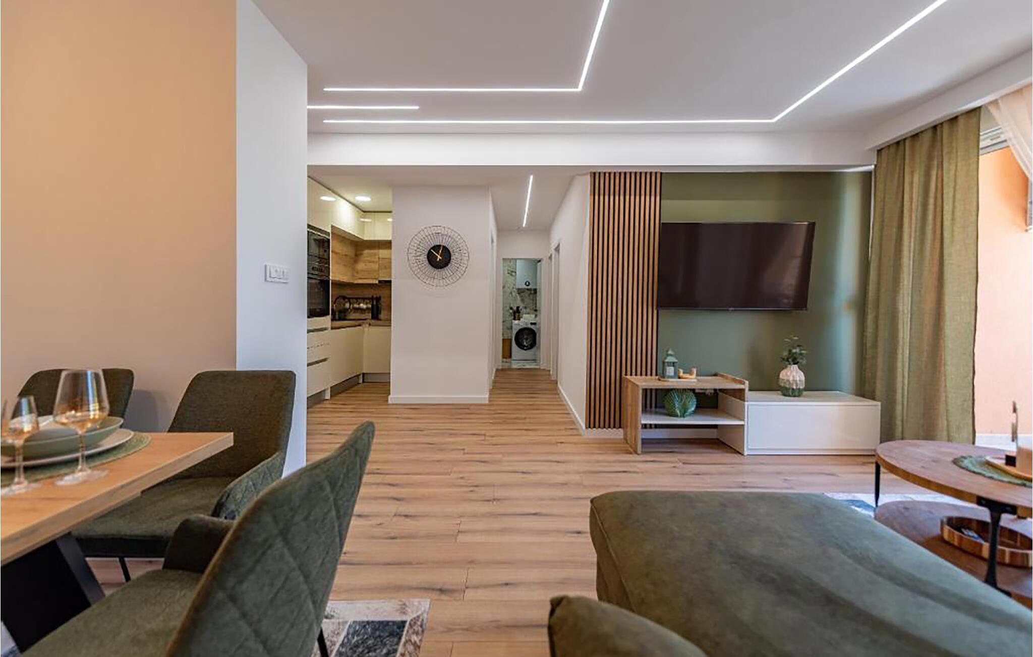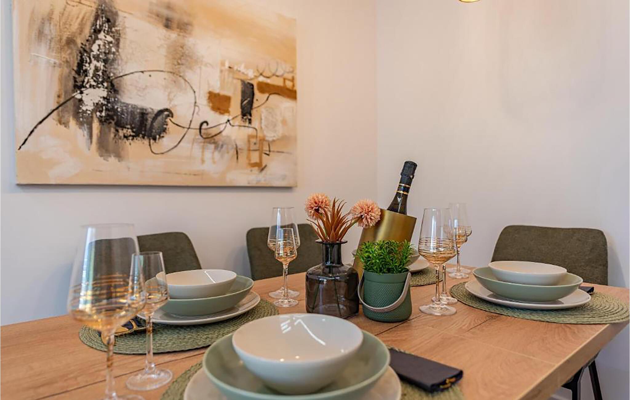Velkommen til denne luksuriøse og smagfuldt indrettede ferielejlighed, som byder velkommen med en harmonisk atmosfære. Glæd jer til at tilberede lækre retter sammen i det hyggelige køkken og tag plads ved det stilrene spisebord. Føl jer godt tilpas i den komfortable sofa, nyd en filmaften eller afslut dagen med en god bog.
