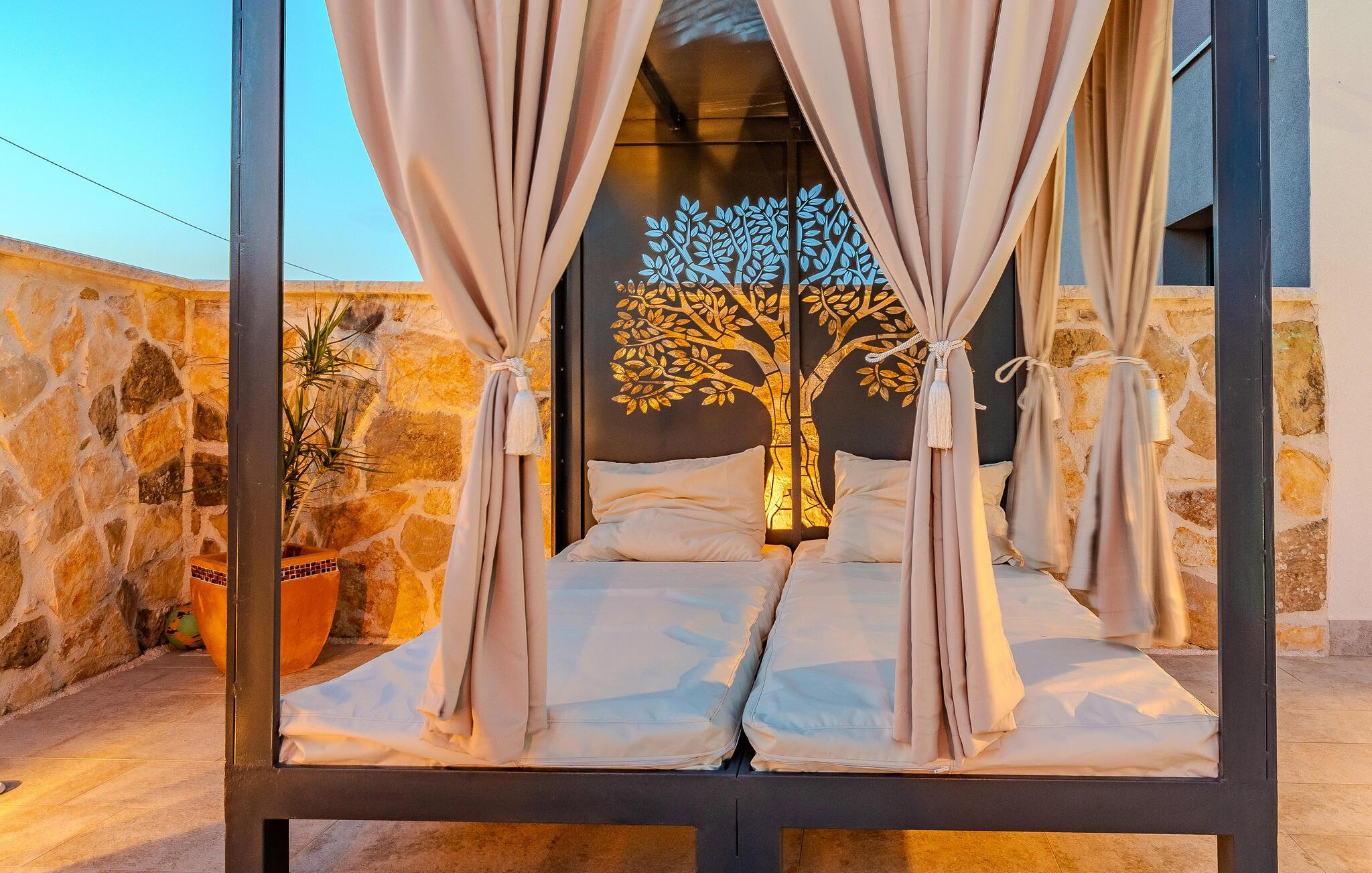 Slap af i dette stemningsfulde feriehus med pool. Dette feriehus kan prale af et stilfuldt interiør med masser af træ, varme farver og hyggelige detaljer. Hyg jer sammen på sofaen i den rummelige stue og nyd afslappende filmaftener. Det moderne køkken med et stort spisebord inviterer jer til at lave mad og spise sammen i hyggeligt selskab. Et sandt højdepunkt er den rustikke taverna - ideel til lange aftener med god mad og et glas vin. Om morgenen kan I tage en forfriskende dukkert i poolen og spille vandpolo. Nyd afslappende timer med at læse eller lytte til musik på den skyggefulde dagseng. Mellem duften af lavendel, gamle stenmure og middelhavsgrønt finder I mange stille hjørner i haven til at snakke eller blot slappe af. Dette er også det ideelle sted for et glas vin eller en hyggelig middag under stjernerne. Besøg Zadars gamle bydel med dens unikke blanding af historie, kultur og havudsigt. Gå en tur langs havnepromenaden, lyt til lyden af Havorglet, og oplev solnedgangen under "Hilsen til Solen". Strandene omkring Zadar inviterer jer til at svømme, snorkle eller blot slappe af. Udflugter til nationalparkerne Kornati, Paklenica eller Krka er også mulige.