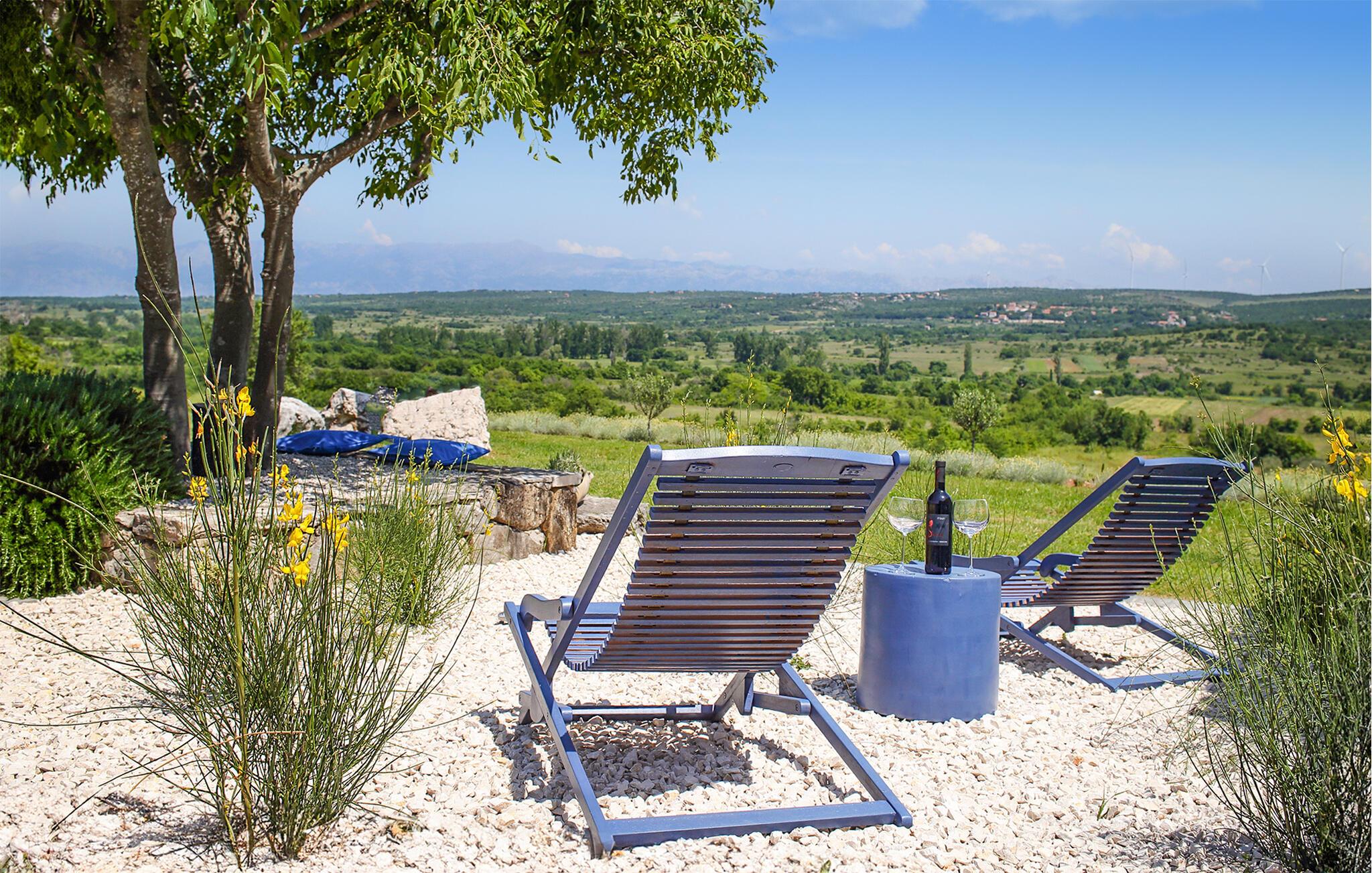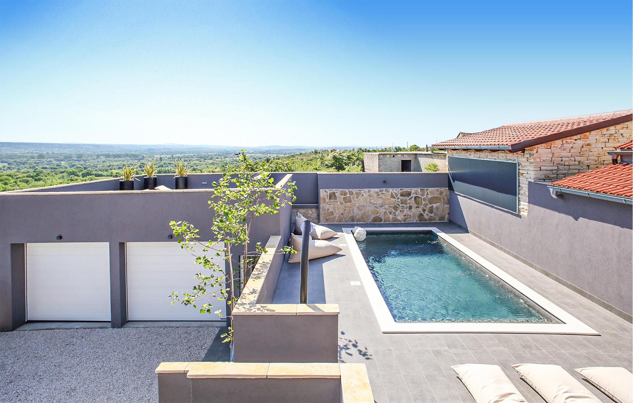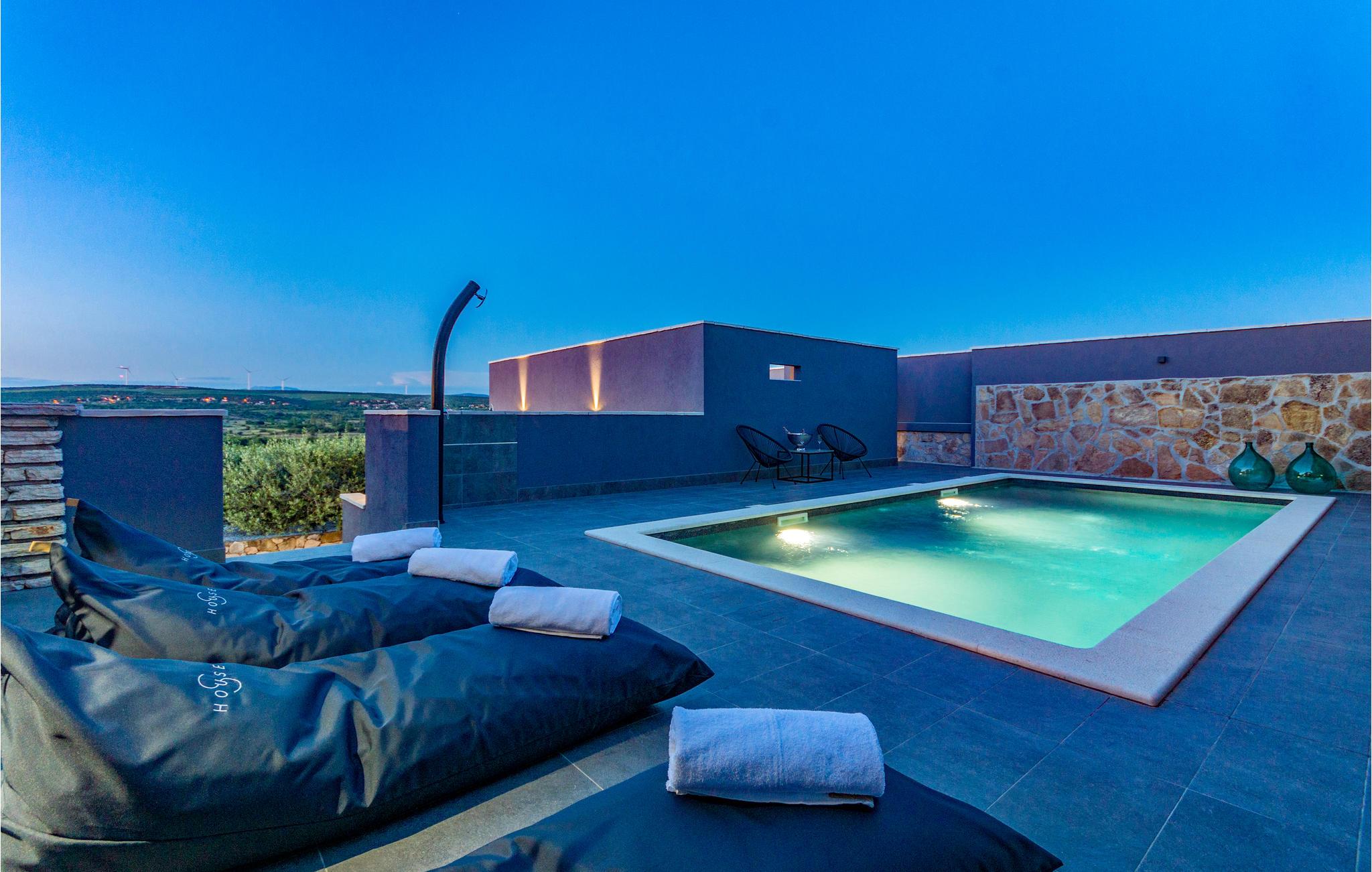Dette skønne feriehus ligger i Nadin ikke langt fra Zadar. Huset er helt specielt og moderne indrettet, med sølv som den gennemgående farve. Poolen ligger højt, så I kan svømme og tage solbad helt ugenert – og hygge jer sammen med snak og gode bøger. Fra den rummelige åbne terrasse er der smuk udsigt over landskaberne. Der hører to cykler med til huset, som kan bruges til ture ud i landskabet. Vi anbefaler jer, at smage regionens skønne vine og glem heller ikke at stifte bekendtskab med de fremragende olivenolier, der har modtaget store priser. Under opholdet er det oplagt at besøge Zadar, med utallige former for kultur og historiske seværdigheder, talrige former for underholdning om sommeren og gode restauranter hvor I kan smage landets vine og fremragende gastronomi. Her kan I også se verdens smukkeste solnedgange.