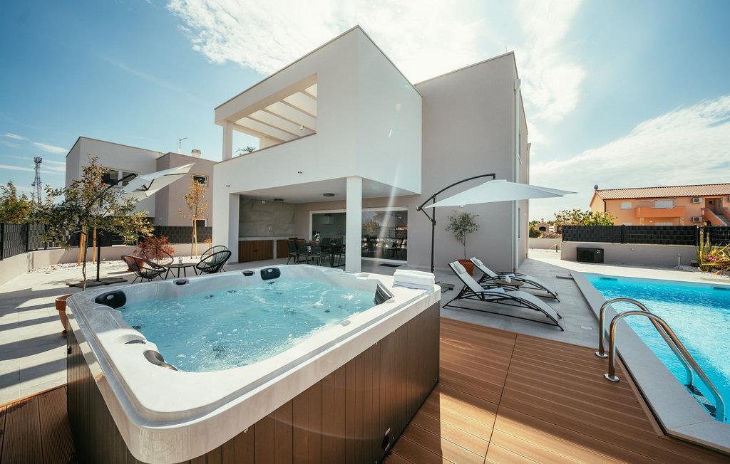 Slap af i denne lyse og stilfulde villa med swimmingpool og spabad. Den stilfulde Villa South venter på jer i Zaton, kun en kort gåtur fra sandstranden. Rene linjer og moderne minimalisme karakteriserer designet af denne luksuriøse indkvartering, der tilbyder et afslappende tilflugtssted. I stueetagen inviterer den åbne stue med et fuldt udstyret køkken og hyggelig spiseplads jer til hyggestunder. De luftige soveværelser ovenpå sikrer afslappende nætter. Den opvarmede pool og spabadet i haven lover forfriskning og ren afslapning, mens den overdækkede terrasse med grill sørger for hyggelige aftener. Zaton er den perfekte base for at opdage Dalmatiens skønhed. Udforsk den nærliggende by Nin med dens historiske seværdigheder og unikke lagune, ideel til vandsport som windsurfing og kitesurfing. De imponerende nationalparker Krka, Kornati og Plitvicesøerne er let tilgængelige og tilbyder uforglemmelige naturoplevelser. Den historiske by Zadar med sin rige kulturarv og mange restauranter ligger også kun en kort køretur væk. Bemærk venligst: Ejendommen accepterer kun ungdomsgrupper under 30 år og polterabender med et refunderbart depositum. Depositummet skal betales ved ankomst, og eventuelle skader vil blive fratrukket det.