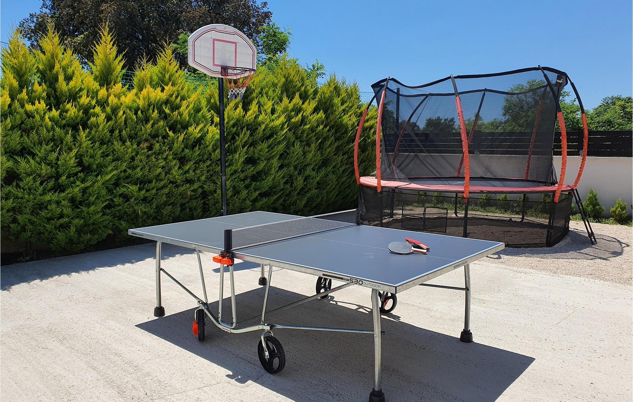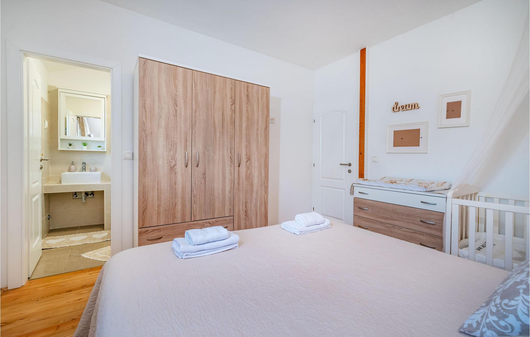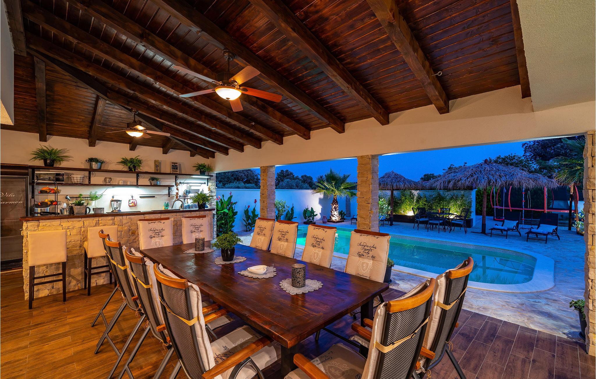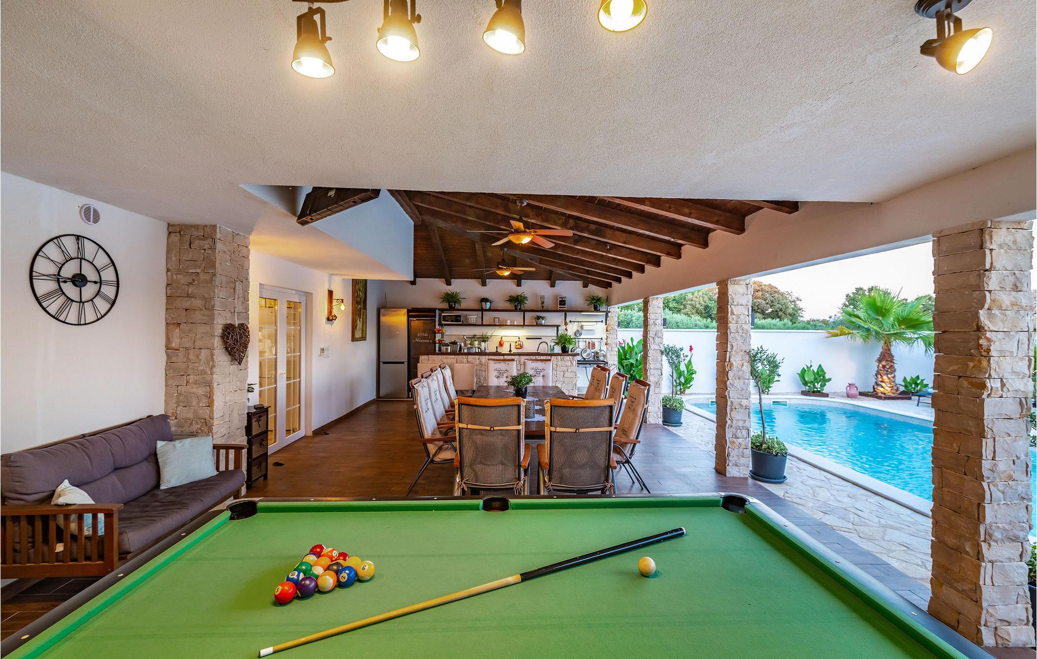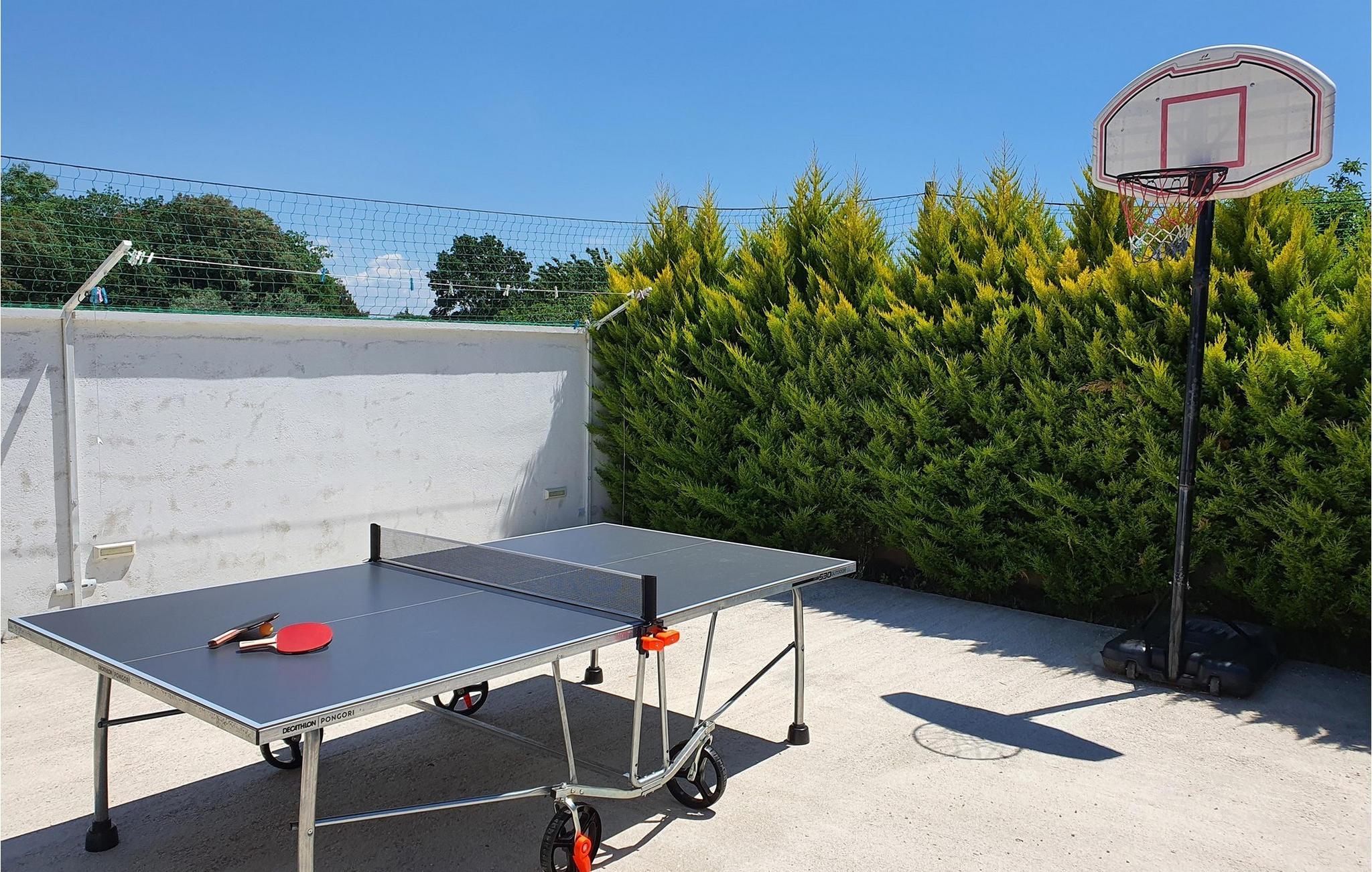 Glæd jer til jeres ferie i denne pragtfulde villa med swimmingpool og et stort udendørsområde. Denne stilfulde Villa Karmen i Zaton lægger op til en afslappende ferie ved havet. Denne moderne ferievilla kombinerer elegant design med traditionel dalmatisk stil og tilbyder alle faciliteter til et uforglemmeligt ophold. Det smagfuldt møblerede, fuldt udstyrede køkken flyder problemfrit over i den rummelige stue, der er dekoreret med sans for detaljer. Nyd jeres måltider på den overdækkede terrasse eller tag en forfriskende dukkert i poolen, mens børnene leger med trampolinen eller basketballkurven. Et poolbord og dart sikrer hyggelige timer, mens sommerkøkkenet med bar altid tilbyder snacks og kolde drikkevarer. Området omkring Zaton byder på talrige fritidsaktiviteter for hele familien. De blide sandstrande er ideelle til afslappende dage med svømning eller vandsport. Tag en tur til det nærliggende Nin, som vil imponere jer med sin historiske bymidte og den berømte Dronningestrand. Zadar med sin romerske historie, Havorglet og Solhilsenen er også let tilgængelig. For eventyrlystne anbefales klatre- og eventyrparken i Kozino. Bemærk venligst: Ejendommen accepterer ikke ungdomsgrupper under 30 år eller polterabender. Bookinger fra sådanne grupper vil blive afvist, selv ved ankomst eller under opholdet, uden refusion.