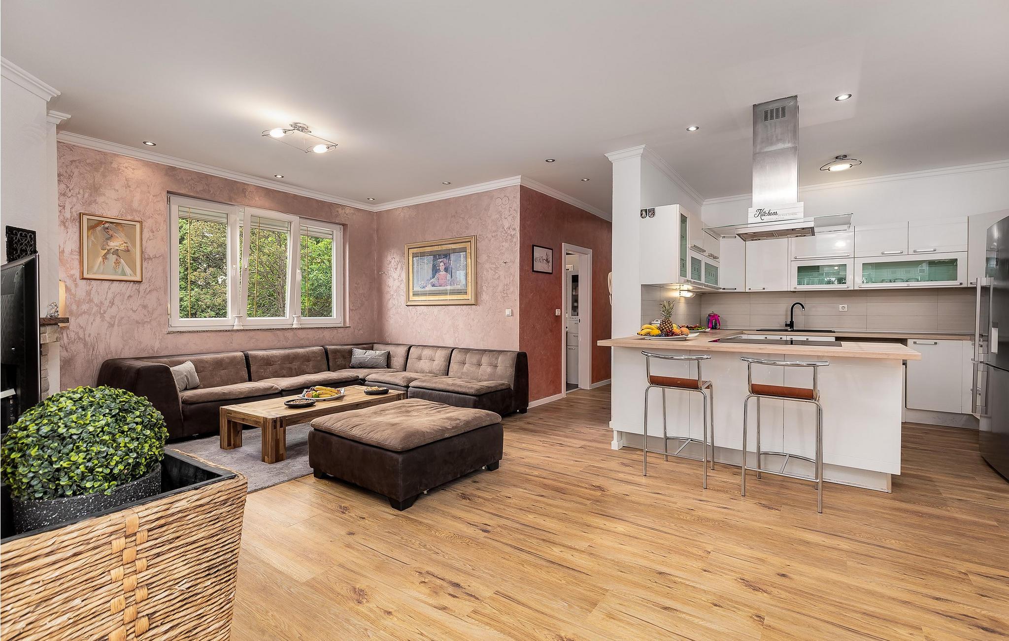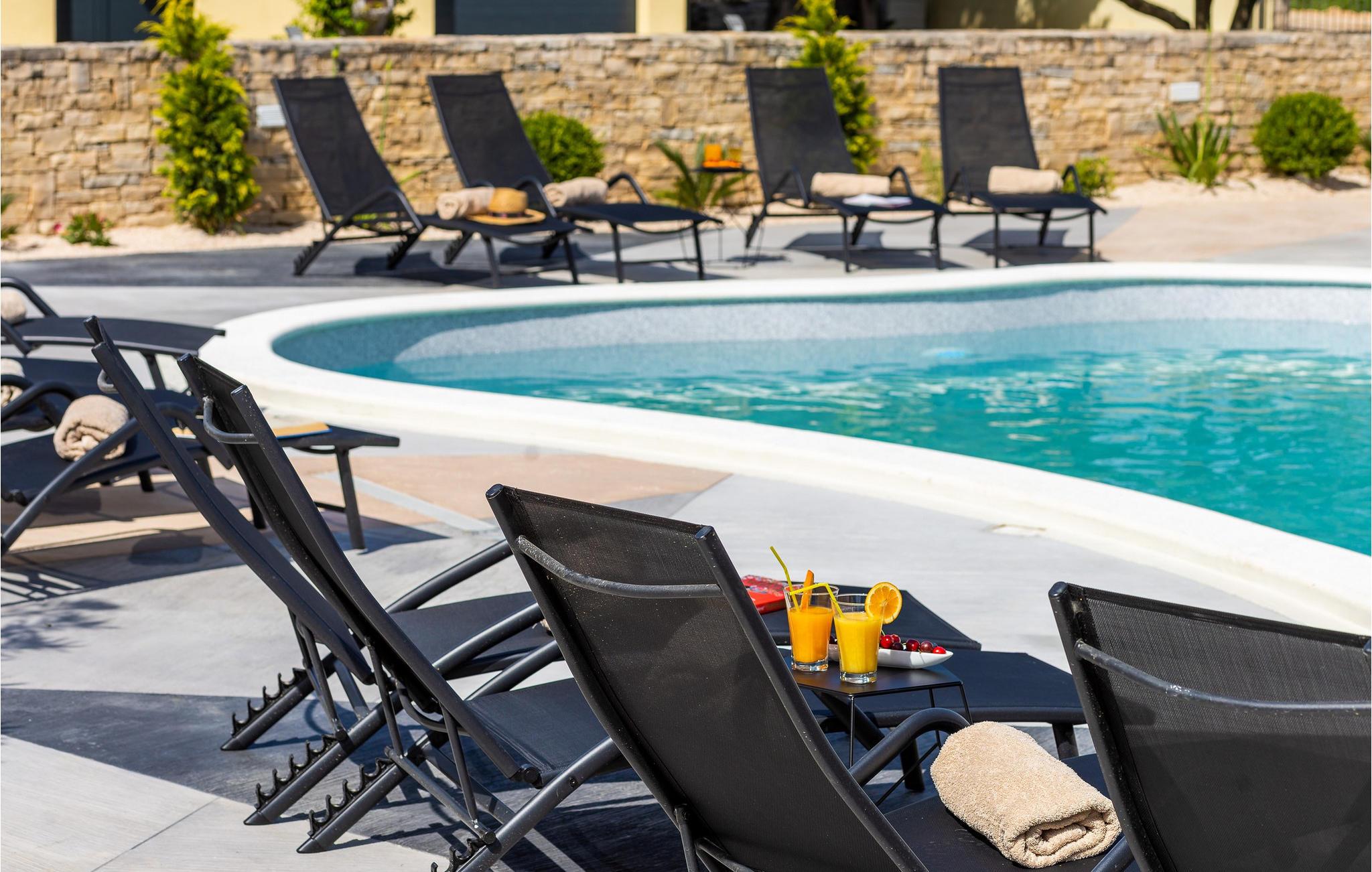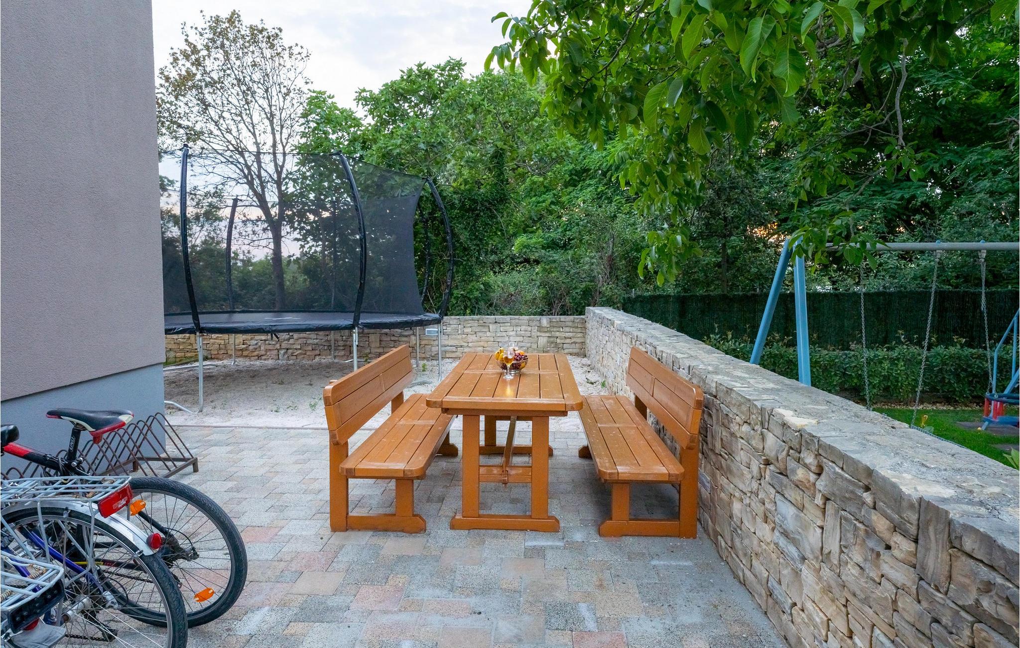 Udendørs venter en stor, opvarmet pool, hvor I kan nyde den kroatiske sol i timevis, mens børnene morer sig på trampolinen eller i den lukkede have. Tilbered lækre tilbehør til grillmad i sommerkøkkenet og nyd den autentiske atmosfære i den hyggelige taverna.
