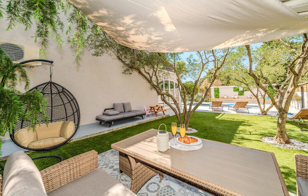 I kan slappe af ved poolen i haven eller på de smukke terrasseområder med loungehjørne. Nyd morgenkaffen i ro og mag i haven, mens I lægger en plan for de kommende dage. Om aftenen kan I tænde op i grillen, mens børnene leger rundt i haven. Ved siden af huset ligger der tennisbaner, som kan benyttes hvis I ønsker lidt sved på panden.