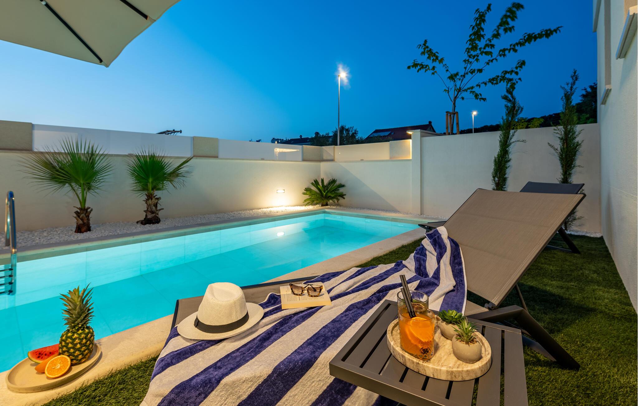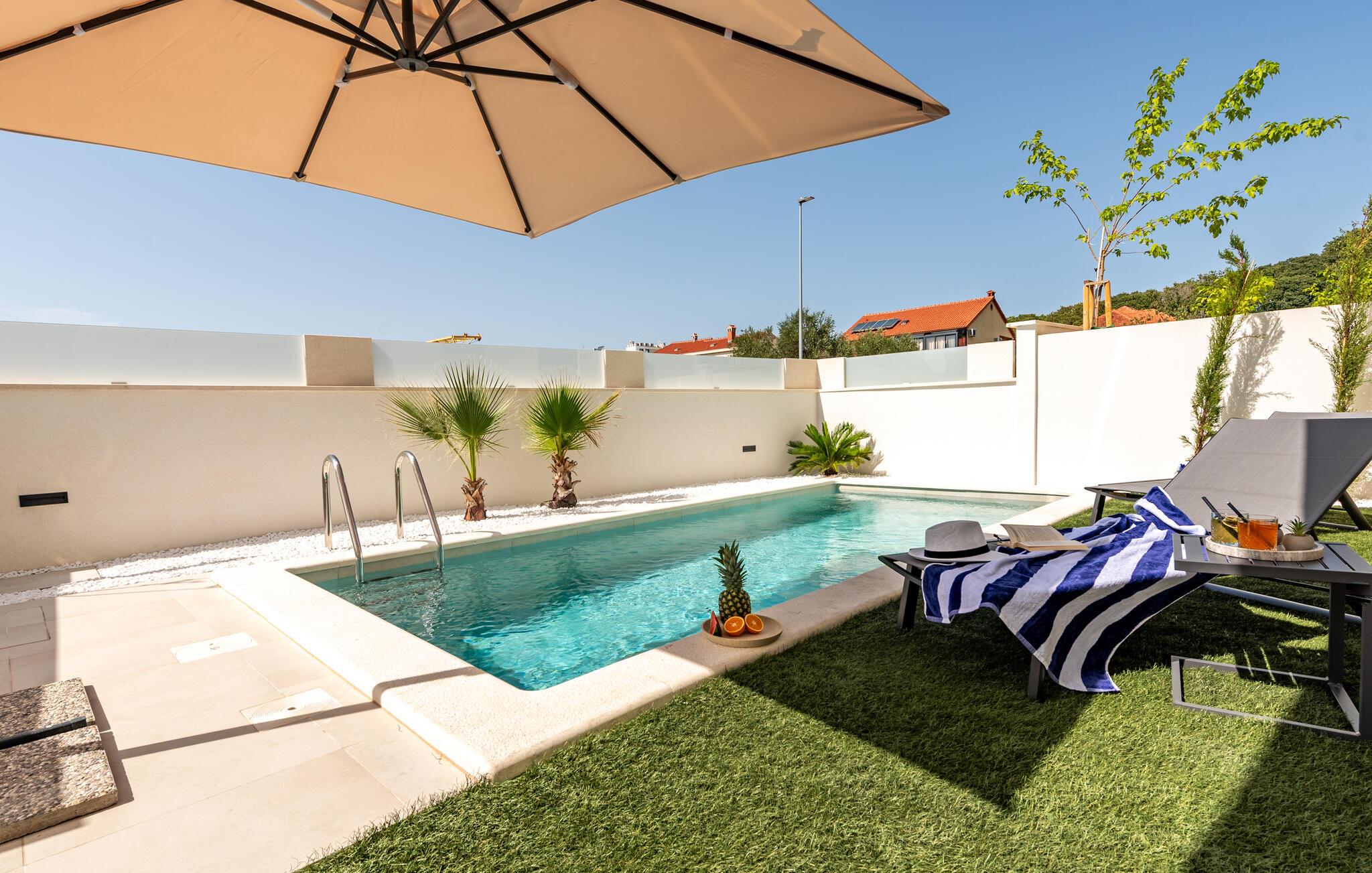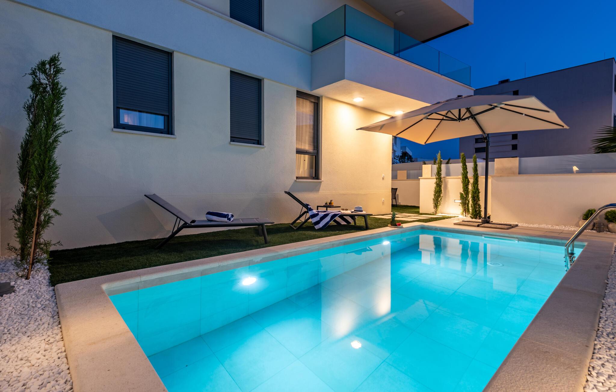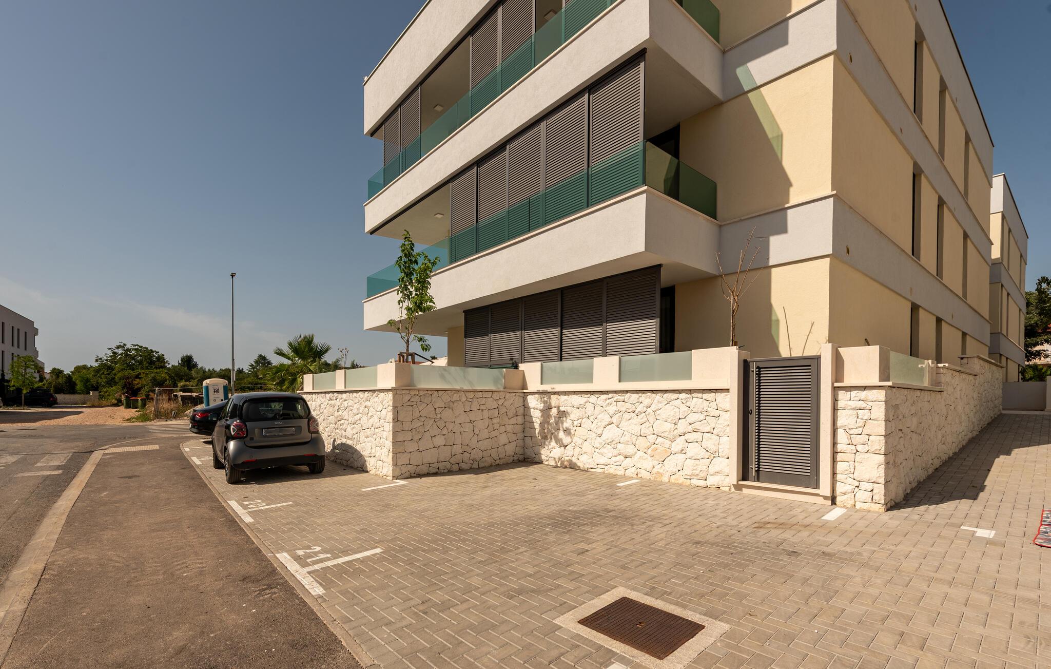 Oplev en dejlig ferie i denne komfortable ferielejlighed med pool og tæt på havet. Denne stilfuldt møblerede lejlighed garanterer en ferie af højeste kvalitet. Smagfuld indretning i afdæmpede farver, en komfortabel sofagruppe og et moderne udstyret køkken inviterer jer til at slappe af og genoplade batterierne. Hyg jer sammen med en kop kaffe, lav lækre måltider, eller tilbring en afslappende filmaften på sofaen. Forfrisk jer i poolen når som helst på dagen, og læn jer derefter tilbage på en af liggestolene med en kølig drink. Nyd blot middelhavsatmosfæren, eller planlæg jeres aktiviteter for den næste dag. Om aftenen inviterer terrassen jer til at afslutte aftenen i fred med en grillfest. Gå en afslappet tur til sandstranden, hvor I kan svømme eller bare nyde solen. Tag en tur til den nærliggende by Zadar, og oplev dens imponerende gamle bydel med romerske og venetianske spor. Om aftenen kan I nyde det unikke skue af Havorglet og "Hilsen til Solen" direkte på havnepromenaden. Udforsk Kožinos charmerende omgivelser med dens idylliske kyststier og maleriske udsigter.