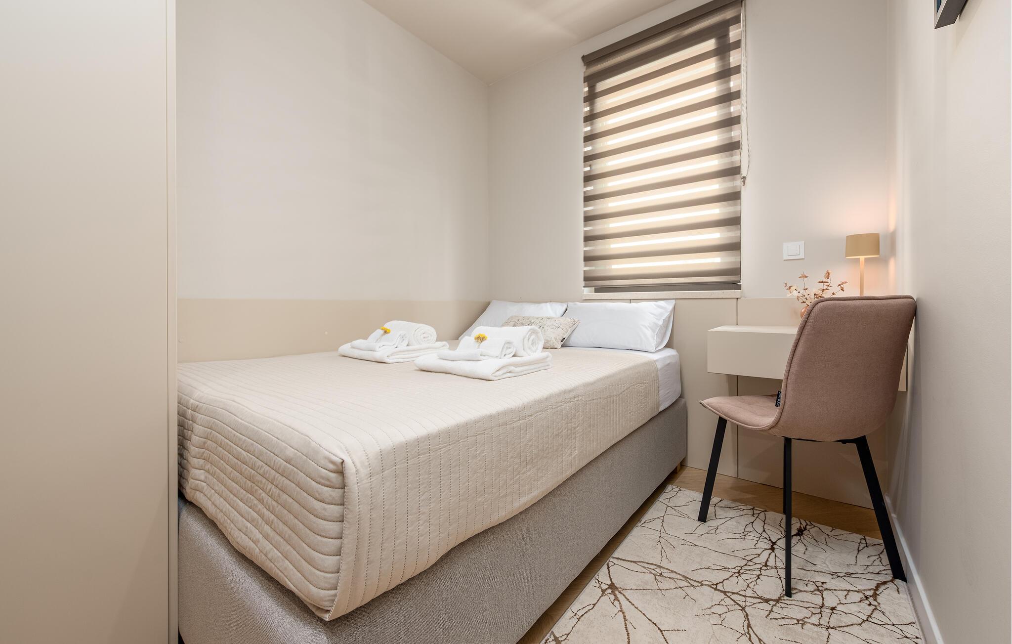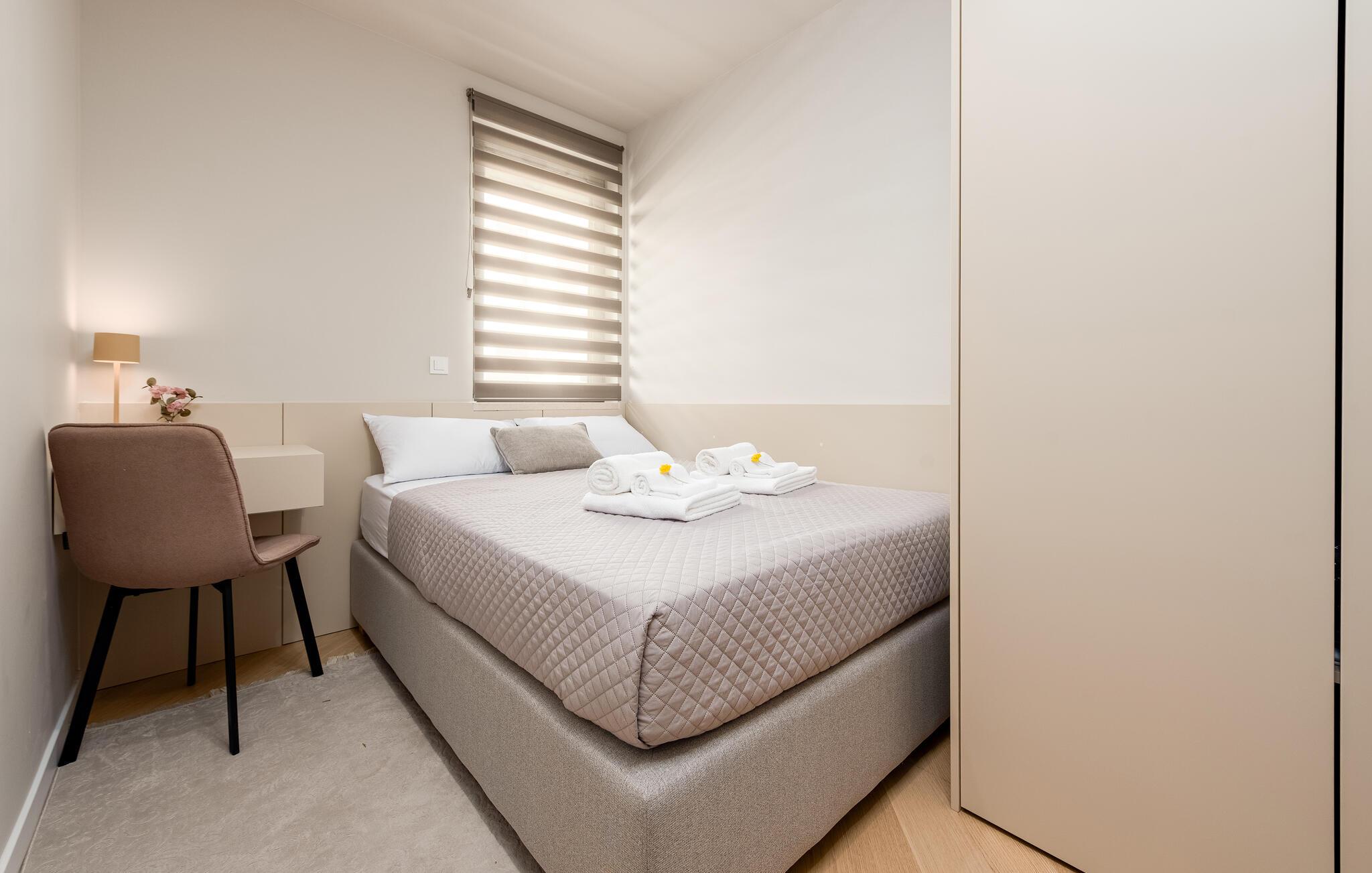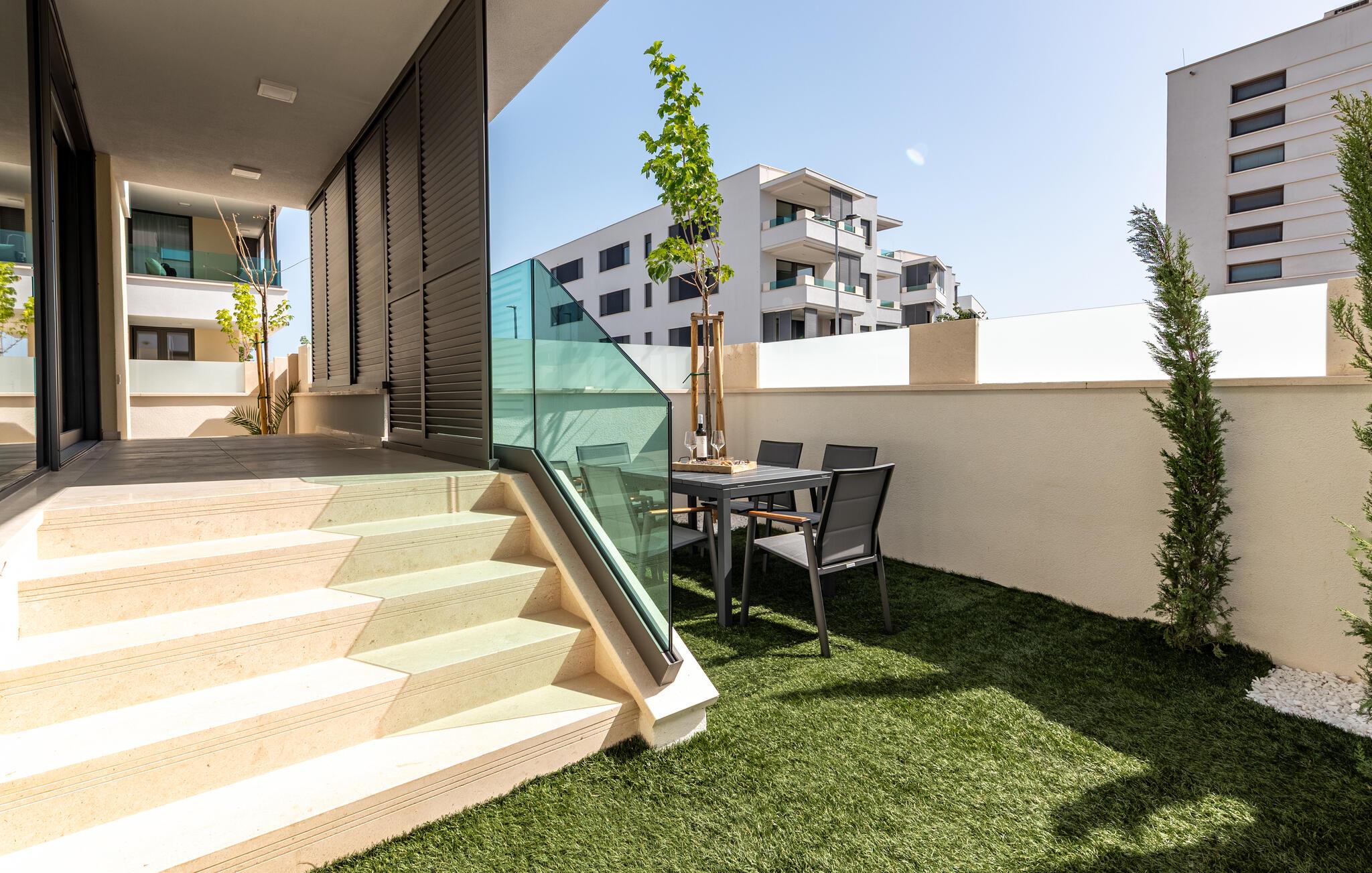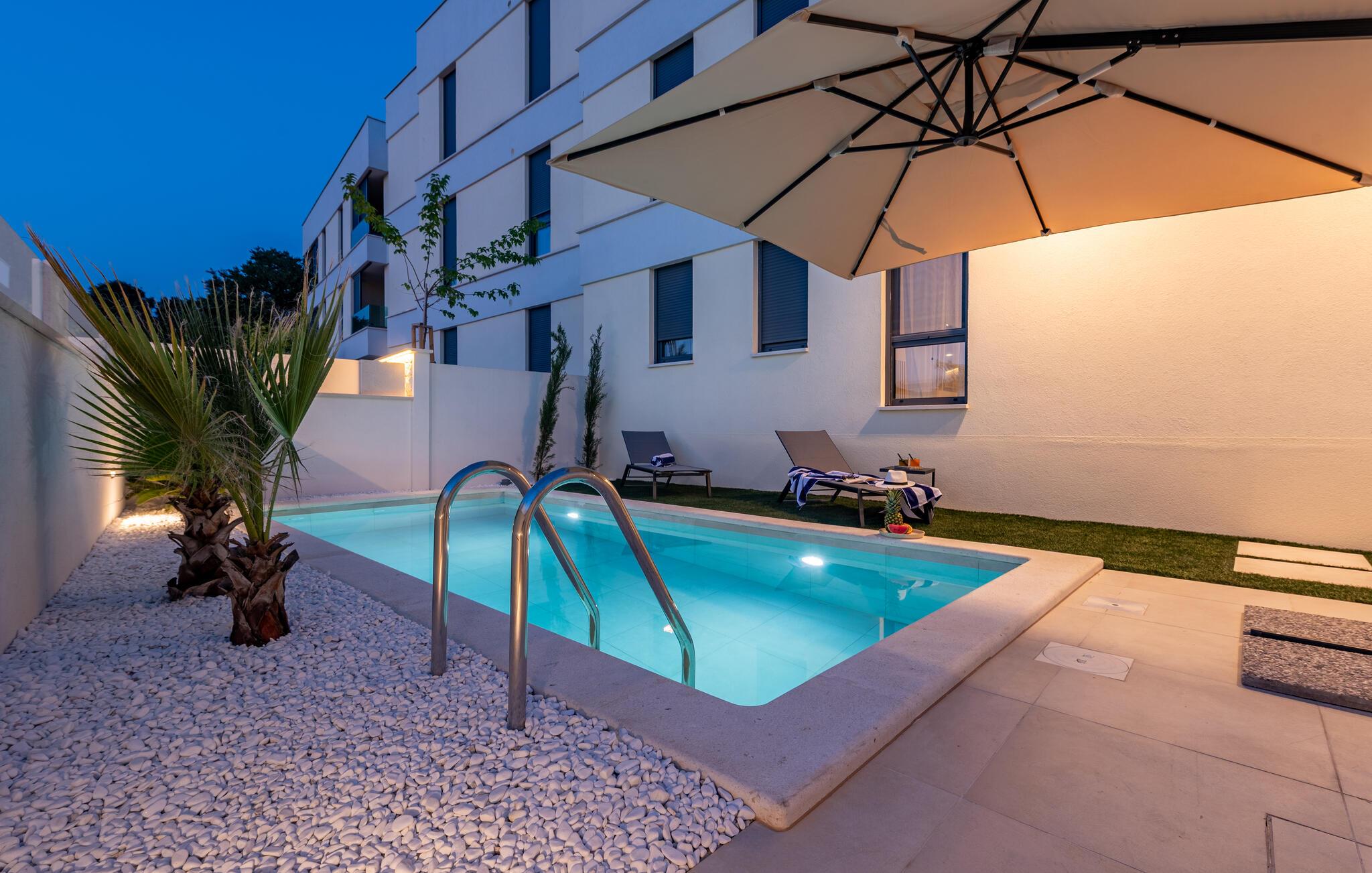 Oplev en dejlig ferie i denne komfortable ferielejlighed med pool og tæt på havet. Denne stilfuldt møblerede lejlighed garanterer en ferie af højeste kvalitet. Smagfuld indretning i afdæmpede farver, en komfortabel sofagruppe og et moderne udstyret køkken inviterer jer til at slappe af og genoplade batterierne. Hyg jer sammen med en kop kaffe, lav lækre måltider, eller tilbring en afslappende filmaften på sofaen. Forfrisk jer i poolen når som helst på dagen, og læn jer derefter tilbage på en af liggestolene med en kølig drink. Nyd blot middelhavsatmosfæren, eller planlæg jeres aktiviteter for den næste dag. Om aftenen inviterer terrassen jer til at afslutte aftenen i fred med en grillfest. Gå en afslappet tur til sandstranden, hvor I kan svømme eller bare nyde solen. Tag en tur til den nærliggende by Zadar, og oplev dens imponerende gamle bydel med romerske og venetianske spor. Om aftenen kan I nyde det unikke skue af Havorglet og "Hilsen til Solen" direkte på havnepromenaden. Udforsk Kožinos charmerende omgivelser med dens idylliske kyststier og maleriske udsigter.