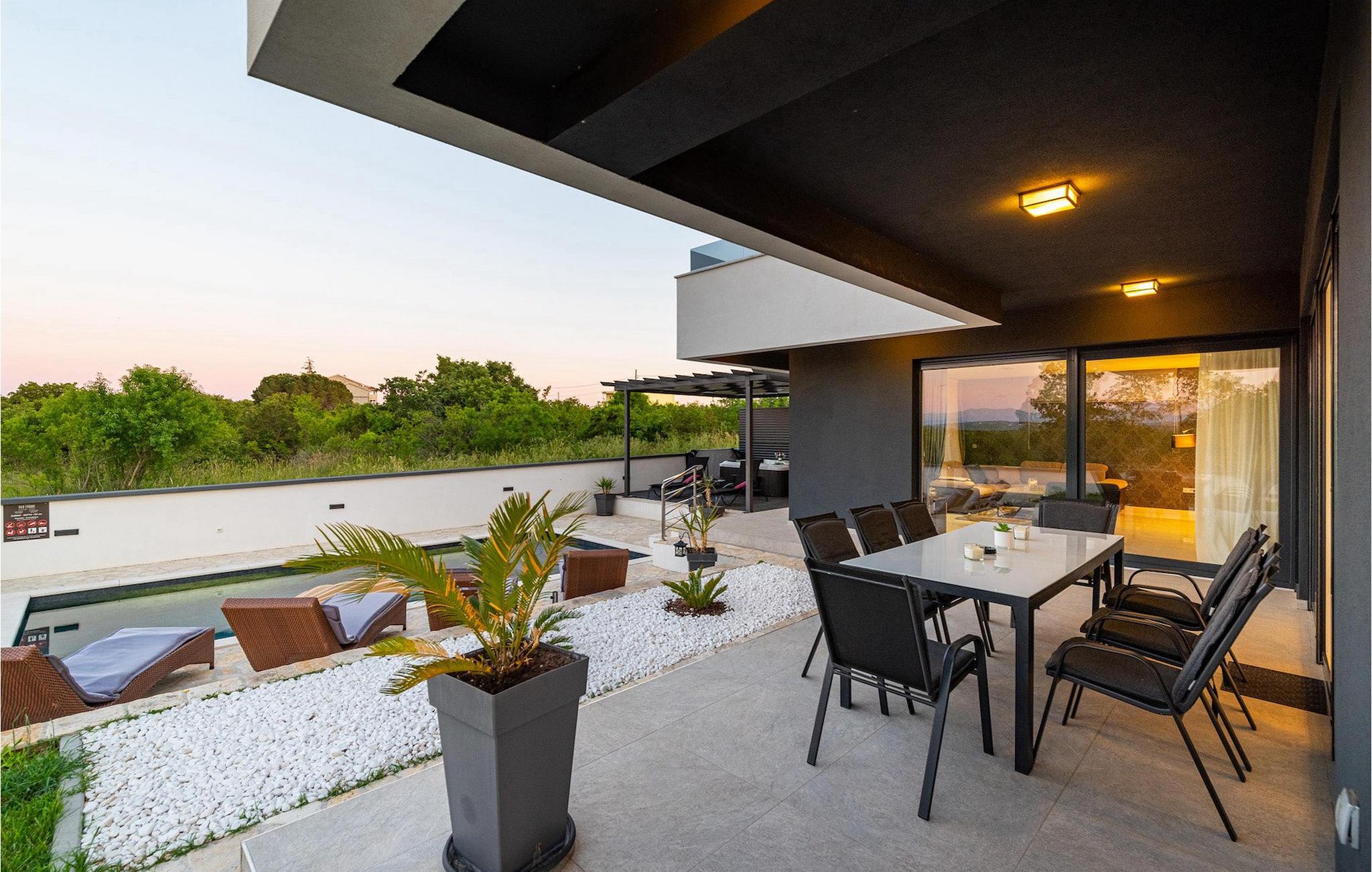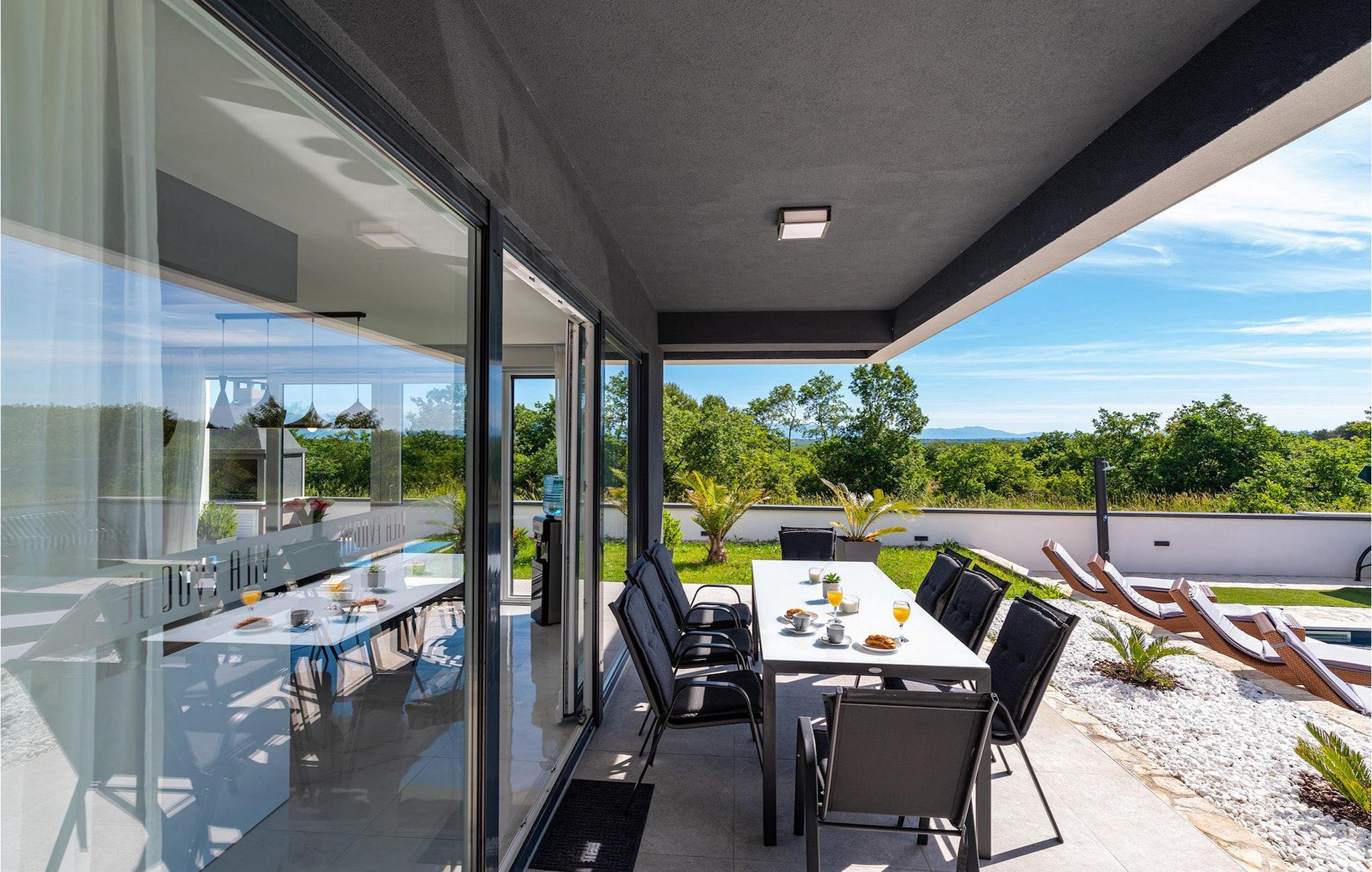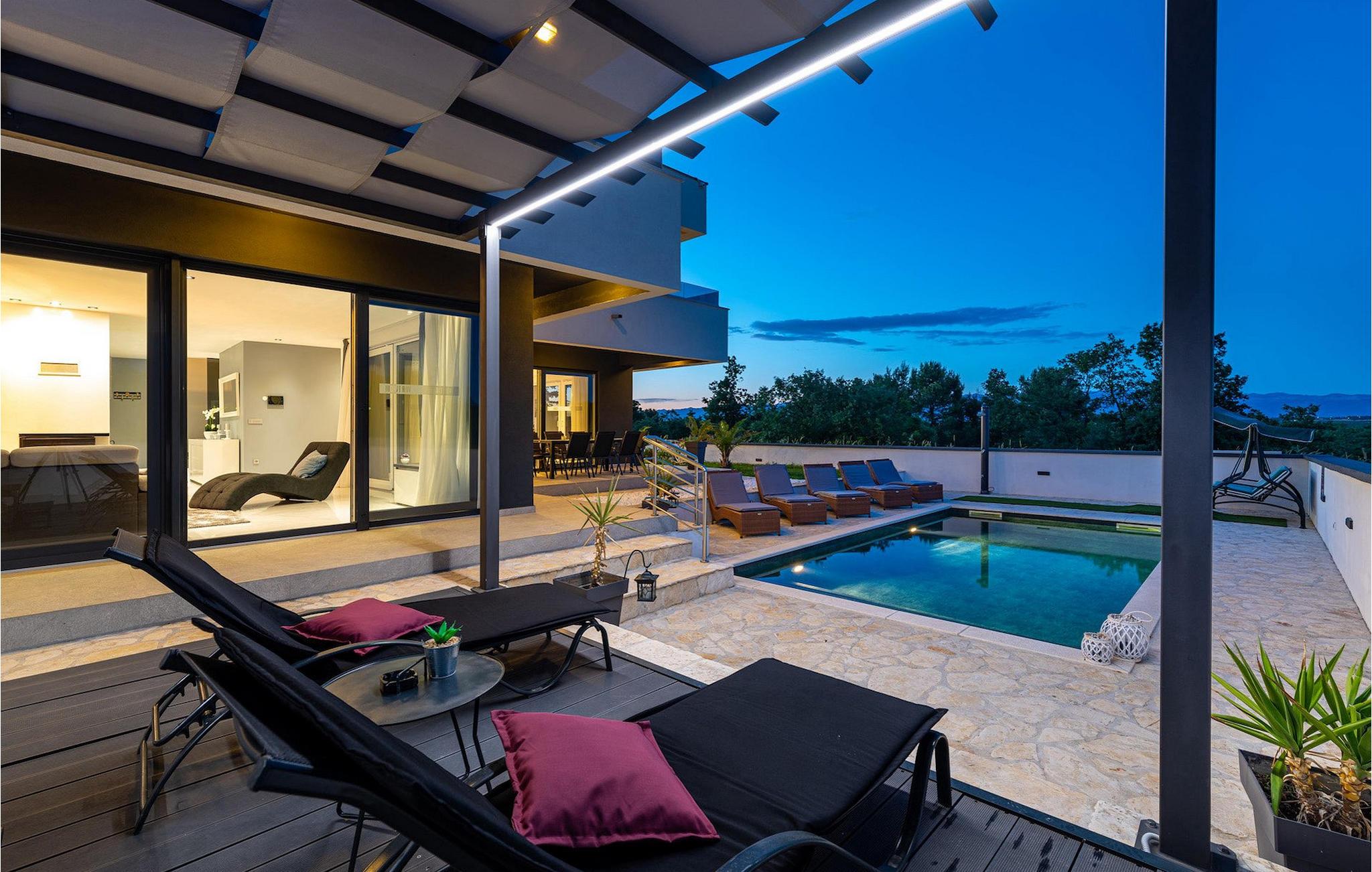 Luksusvillaen Evoque er beliggende nær byen Zadar, i en lille landsby Crno. Denne villa vil give dig et rigtigt stykke paradis og en afslappende og behagelig ferie. Villaens bekvemme beliggenhed tilbyder alle de luksuriøse og moderne bekvemmeligheder, du kan få brug for på din ferie. Denne moderne villa kan rumme i alt 6 personer i 3 komfortable soveværelser. I stueetagen af villaen er der en rummelig åben planløsning med udstyret køkken og spiseplads, og på første sal er der tre komfortable og rummelige soveværelser og to badeværelser, hvoraf det ene er en suite. Alle tre soveværelser har aircondition og har udgang til en terrasse, hvor du kan få din morgenkaffe med en smuk solopgang. Fra stuen kan du gå ud på den udendørs terrasse med pool og liggestole. Slap af i poolen og nyd solen på liggestolene, og om aftenen kan I samle familien til udendørs middage sammen. Denne villa betyder ægte afslapning i luksuriøs komfort, kom og prøv det selv.Den smukke villa Evoque er beliggende nær byen Zadar i landsbyen Crno. Kun få kilometer fra Zadars smukke strande tilbyder Villa Evoque en fantastisk beliggenhed til sine gæster. Stop ved den storslåede by Zadar og besøg restauranter og caféer. Lokale butikker ligger i bydelen 500 m fra villaen. Zadar er en gammel by med en værdifuld historisk og kulturel arv og storslåede solnedgange. Den gamle bydel er fuld af monumenter fra oldtiden, middelalderen og renæssancen, såsom den berømte romerske plads og kirken St. Donata. I dag er den bedst kendt for Havorgelsymfonien og installationen Hilsen til Solen. Nyd bølgesymfonien og smag på det dalmatiske køkken.