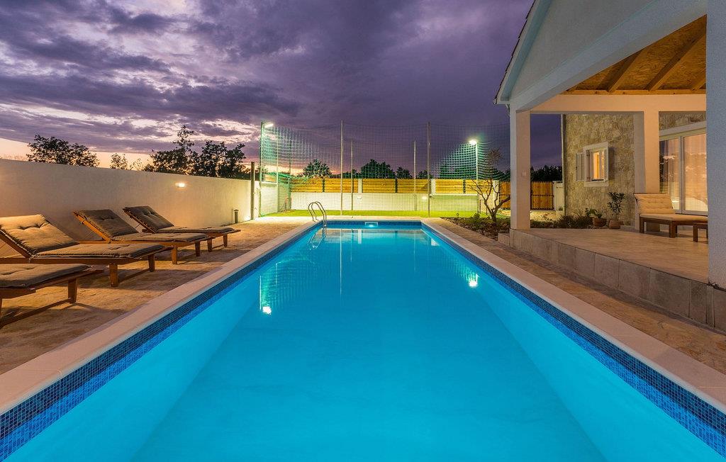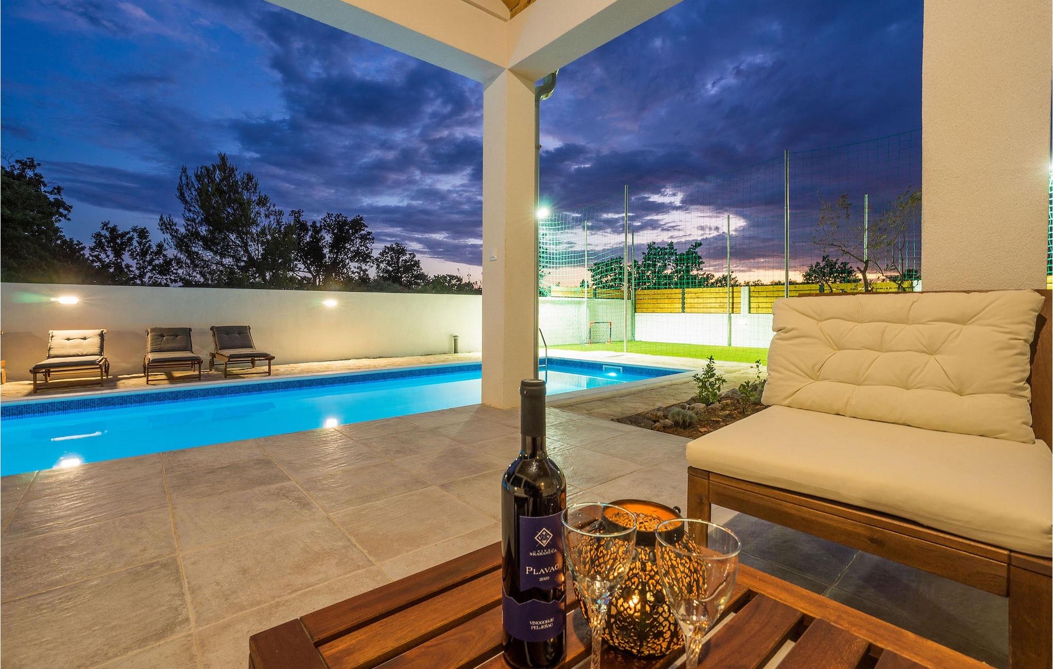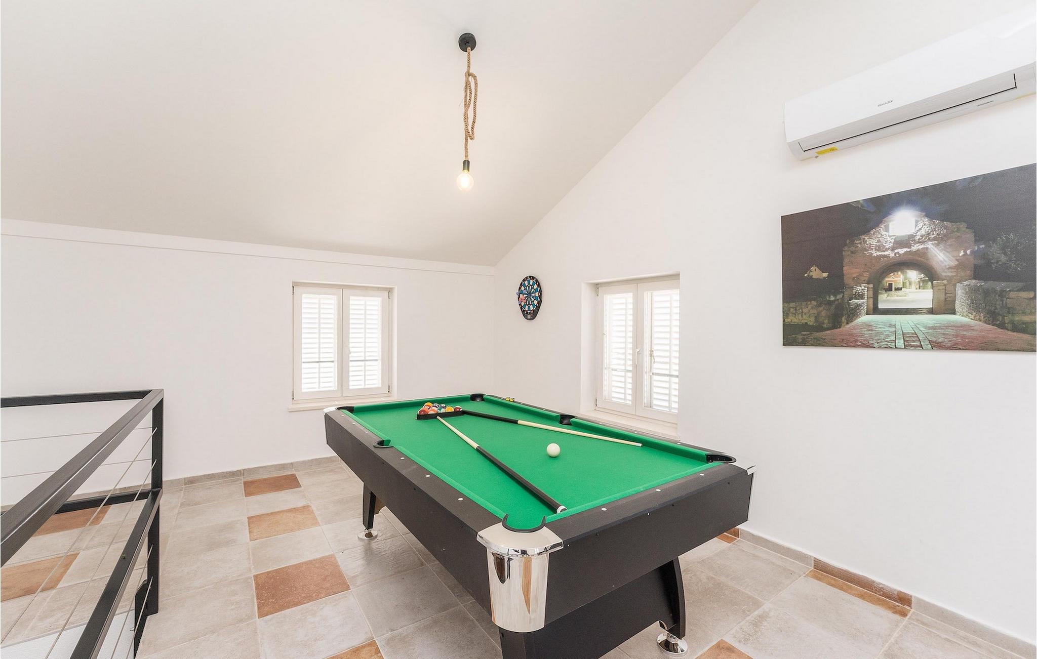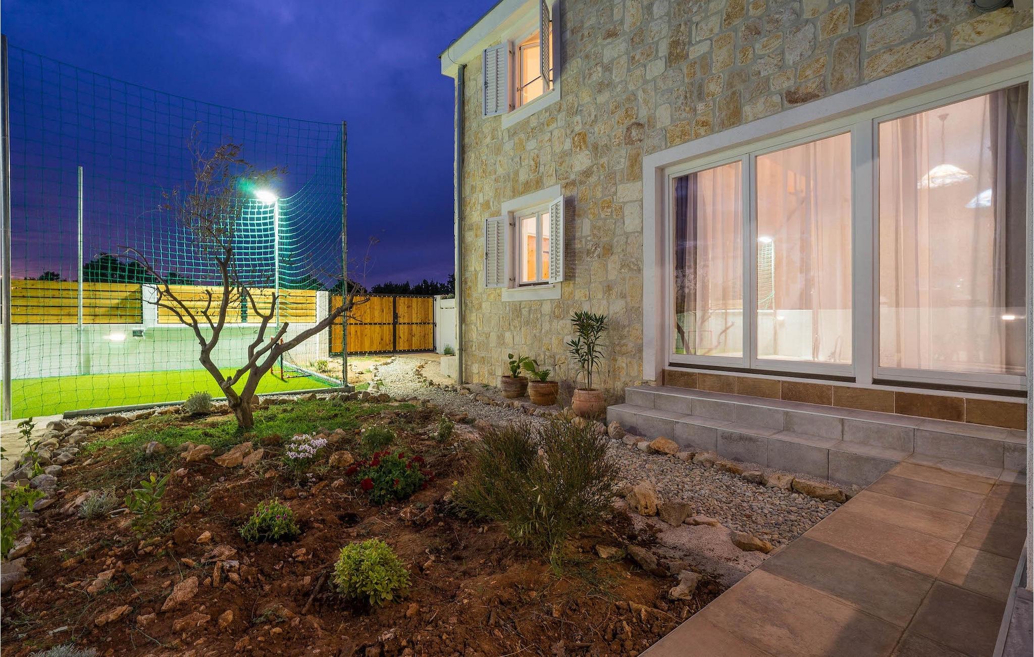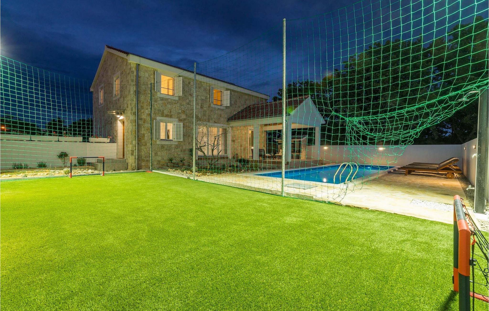 Hvad er det første, du tænker på, når du hører ferie? Er det stranden, eller er det afslapning, eller måske en aktiv ferie? Nå, Villa Aenona har alt, hvad du drømte om. Den charmerende Villa Aenona ligger i Dalmatien, nær byen Zadar. Villaen i to etager er perfekt til familier eller vennegrupper på udkig efter en afslappende, men også aktiv ferie. Stueetagen af villaen består af et fuldt udstyret køkken, en hyggelig stue med spiseplads, et vaskerum og et komfortabelt soveværelse med en dobbeltseng og et badeværelse. Ovenpå er der et legerum med et poolbord, bordfodbold, dart og en PlayStation 4, yderligere to soveværelser og to badeværelser. To badeværelser er udstyret med bruseniche, mens det ene badeværelse har badekar. Udenfor finder du et overdækket siddeområde, hvor du kan slappe af, mens din bedre halvdel tilbereder et lækkert måltid på kulgrillen til dig og din familie. Kun et skridt væk ligger den store private pool, som indbyder til en forfriskende dukkert på varme sommerdage. Villaens højdepunkt er den oplyste fodboldbane, hvor du kan hygge dig med dine børn, der spiller fodbold, badminton eller volleyball. Da villaen kun ligger få minutters gang fra sandstranden, er den også ideel for familier med små børn. Hvis du kan lide alt, hvad du har læst om denne villa indtil videre, er det tid til at booke den og opleve din næste ferie på Villa Aenona. Villa Aenona ligger i Zaton, ikke langt fra byen Nin, i gåafstand fra smukke sandstrande , og ideel til familier med små børn. Nin er kendt for sine smukke strande, men også for sin lange tradition for saltproduktion. Besøg Nin Salt Works and Museum, hvor du kan lære, hvordan salt udvindes naturligt, hvordan det opbevares og selvfølgelig smage de mange delikatesser lavet med salt såsom olivenolie, kiks og chokolade. Bortset fra sin naturlige skønhed er Nin en af de ældste byer på den østlige Adriaterhavskyst med en 3.000-årig historie. Den historiske gamle bydel i Nin ligger på en lille ø forbundet med fastlandet med to stenbroer. Gå en tur gennem byens smalle gader og opdag de skjulte hemmeligheder. Villa Aenona er også et ideelt udgangspunkt for adskillige udflugter. Gå ikke glip af at besøge byen Zadar, som vil glæde dig med sin kystpromenade, unikke havorgel og en af de smukkeste solnedgange i verden. Sørg for at du ikke går glip af et besøg på øen Pag, kendt for sin usædvanlige lettelse, lækre retter og talrige strande. Interessant nok er der 3 nationalparker i dette lille område, nemlig Paklenica National Park, Kornati National Park og Krka National Park. Alle disse parker har noget til fælles, nemlig uberørt natur, der ikke vil lade nogen uimponeret.