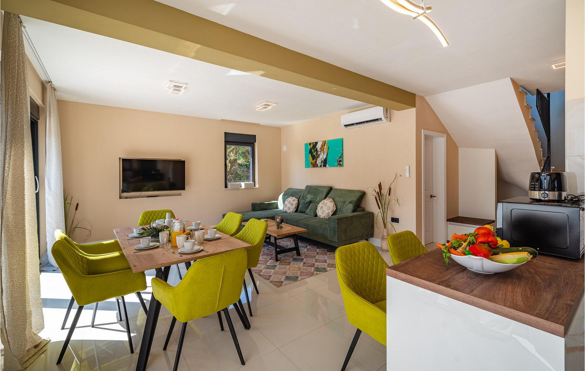 Villa Krstina byder dig velkommen i sin smukke have med en grøn græsplæne, perfekt for børn at løbe rundt, før de hopper i den forfriskende private pool. Omkring poolen kan du nyde solen på 6 liggestole. Flere træer tilbyder skyggefulde steder på græsplænen at slappe af på. Ved siden af villaen ligger et spisebord til op til 6 personer perfekt til en skøn udendørs frokost med udsigt til den flimrende pool. Inde i villaen er stuen med tv oversvømmet med naturligt lys, ligesom køkkenet og spisepladsen er i samme rum, takket være de store terrassedøre. Spisepladsen til op til 8 personer er placeret lige ved siden af en af de store glasdøre med udsigt til haven. Et af badeværelserne er også i stueetagen. På første sal er der 3 komfortable dobbeltværelser og yderligere 2 badeværelser. Altanen med eget opholdsområde er perfekt til at nyde morgenkaffen på, eller se solnedgangen sammen. Villa Krstina er et godt valg til en sjov familieferie i Dalmatien. Villa Krstina ligger i Vrana, 7 km fra stranden og kun inden for 1 km fra nærmeste butik, restaurant og café. I naturparken Vrana Lake kan du nyde at gå gennem smuk natur. Der er 95 arter beskyttet ved lov i parkens område. Den gamle bydel i Vrana blev bygget i umiddelbar nærhed af søen i middelalderen. Kun 8 km fra villaen kan du besøge et sjovt vandland for dig og dine børn. Omkring 45 minutter væk er byen Zadar en fantastisk destination for en dagstur med familien. Byen er kendt for sine romerske og venetianske ruiner. Der er flere venetianske porte i bymuren. Du kan besøge adskillige kirker fra flere forskellige århundreder for at beundre kunsten og arkitekturen. En uundgåelig unik attraktion, som Zadar er berømt for, er Havorgelet. Denne struktur består af trin langs kysten, som spiller en melodi baseret på, hvordan bølgerne rammer dem. En af byens nyeste attraktioner er Glasmuseet. Den indeholder en af de bedste samlinger af romersk glasvarer uden for Italien, herunder bægre, krukker og hætteglas hentet fra arkæologiske steder i hele Dalmatien.