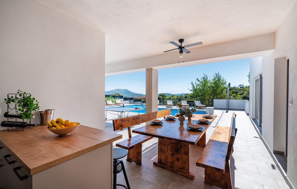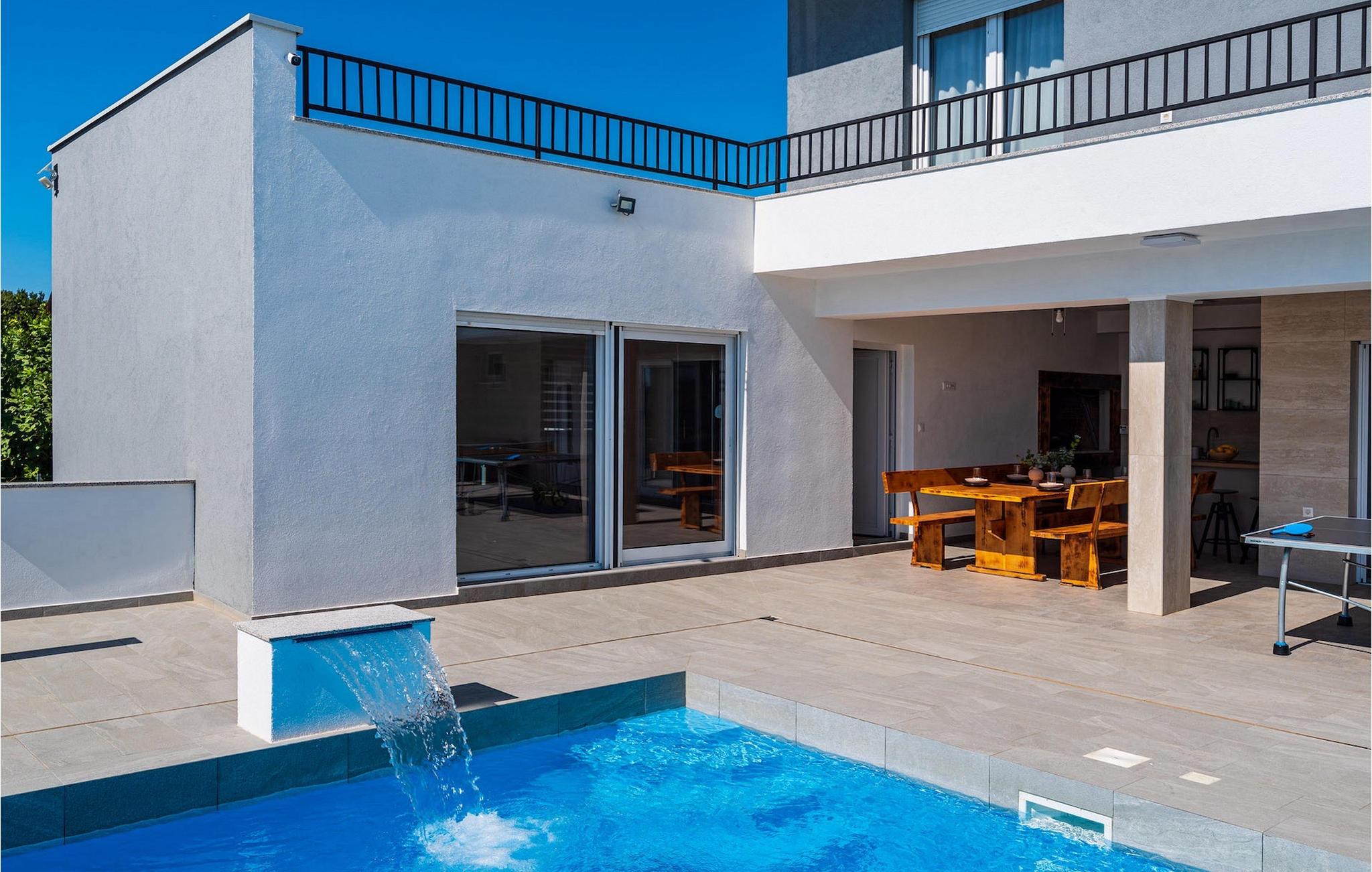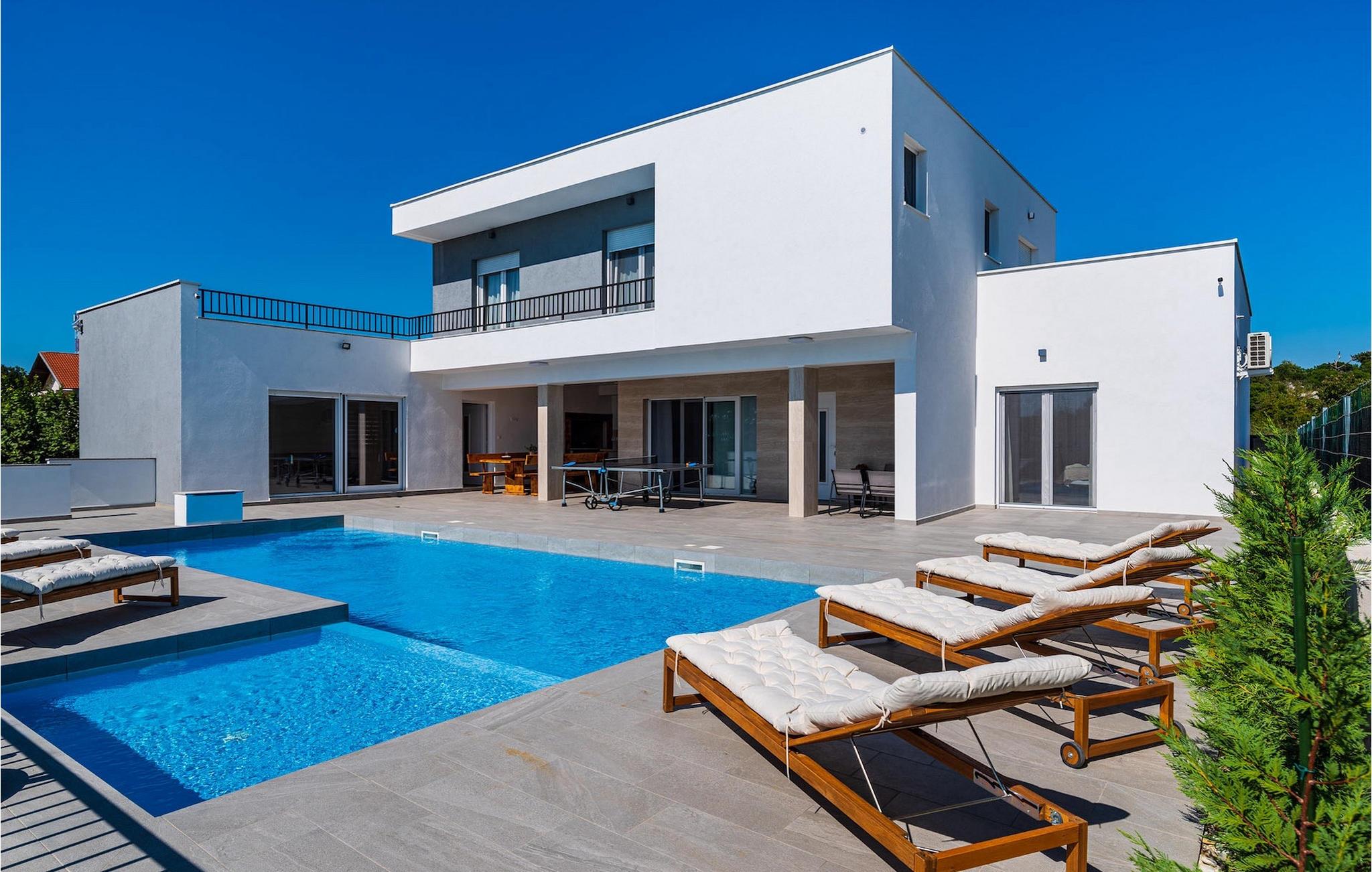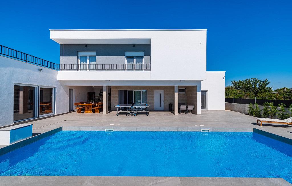 Ønsker du en afslappende ferie, ro og komfort langt væk fra hverdagen? Så er Villa Tea Polaca for op til 10 gæster nær Zadar det rigtige sted for dig! Dette elegante og moderne feriehus med 5 værelser tilbyder dig alt hvad du behøver til en uforglemmelig ferie i Dalmatien med familie og venner. Hjertet i Villa Tea Polaca er den 40m2 forfriskende swimmingpool, hvor du helt sikkert vil tilbringe det meste af din tid. Føl dig godt tilpas med en kølig drink på en af liggestolene, mens familiemåltidet tilberedes på kulgrillen i det åbne sommerkøkken. Du kan også holde øje med børnene, når de render rundt i haven, spiller bordtennis eller holder en turnering ved fodboldbordet. Tilbring varme sommeraftener med hele familien ved det store spisebord på den overdækkede terrasse. I naboejendommen sørger Orbitrek for din fitness, og saunaen giver afslapning. Et ekstra badeværelse med bruser er tilgængeligt her. Ind i det fuldt klimatiserede interiør af Villa Tea Polaca fra udendørsområdet kommer du ind i den lyse stue med TV. I tilknytning hertil ligger det fuldt udstyrede køkken og spiseplads, samt et gæstetoilet. På samme niveau er der også 2 komfortable dobbeltværelser, hver med sit eget ensuite badeværelse. Trappen fører dig til yderligere 3 smukke soveværelser, hver med en dobbeltseng. Disse soveværelser har også hver deres badeværelse med bruser. Hvert soveværelse har tv og aircondition. Her kommer du også ud til altanen, som byder på lidt privatliv, og hvorfra du kan nyde en vidunderlig udsigt over det omkringliggende område eller den klare stjernehimmel om aftenen. Forkæl dig selv og dine kære med kun det bedste, book nu og tilbring din drømmeferie i Dalmatien i den fantastiske Villa Tea Polaca! Den fantastiske Villa Tea Polaca ligger i den lille rolige landsby Polaca, kun 11 km fra Biograd na Moru og ikke så langt fra den berømte historiske by Zadar. Ud over havet, som kun ligger 11 km væk, byder området omkring Villa Tea Polaca på en bred vifte af naturlig skønhed og kulturelle attraktioner. Byerne Zadar og Sibenik, fulde af kultur og historie, er bestemt et besøg værd. Det berømte turiststed Biograd na Moru byder på tonsvis af aktiviteter, restauranter og strande, samt Fun Park Mirnovec, hvis du er i humør til lidt adrenalin. Der er flere nationalparker at vælge imellem i denne region: Kornati, Krka, Paklenica, North Velebit Nature Park og Vransko Lake. Naturelskere vil finde det svært at beslutte sig. Vælg lidt af hvert og nyd din ferie fuldt ud. Temperaturen i den opvarmede swimmingpool er afhængig af eksterne faktorer, herunder vejrforhold, og som sådan kan temperaturen på vandet ikke garanteres.