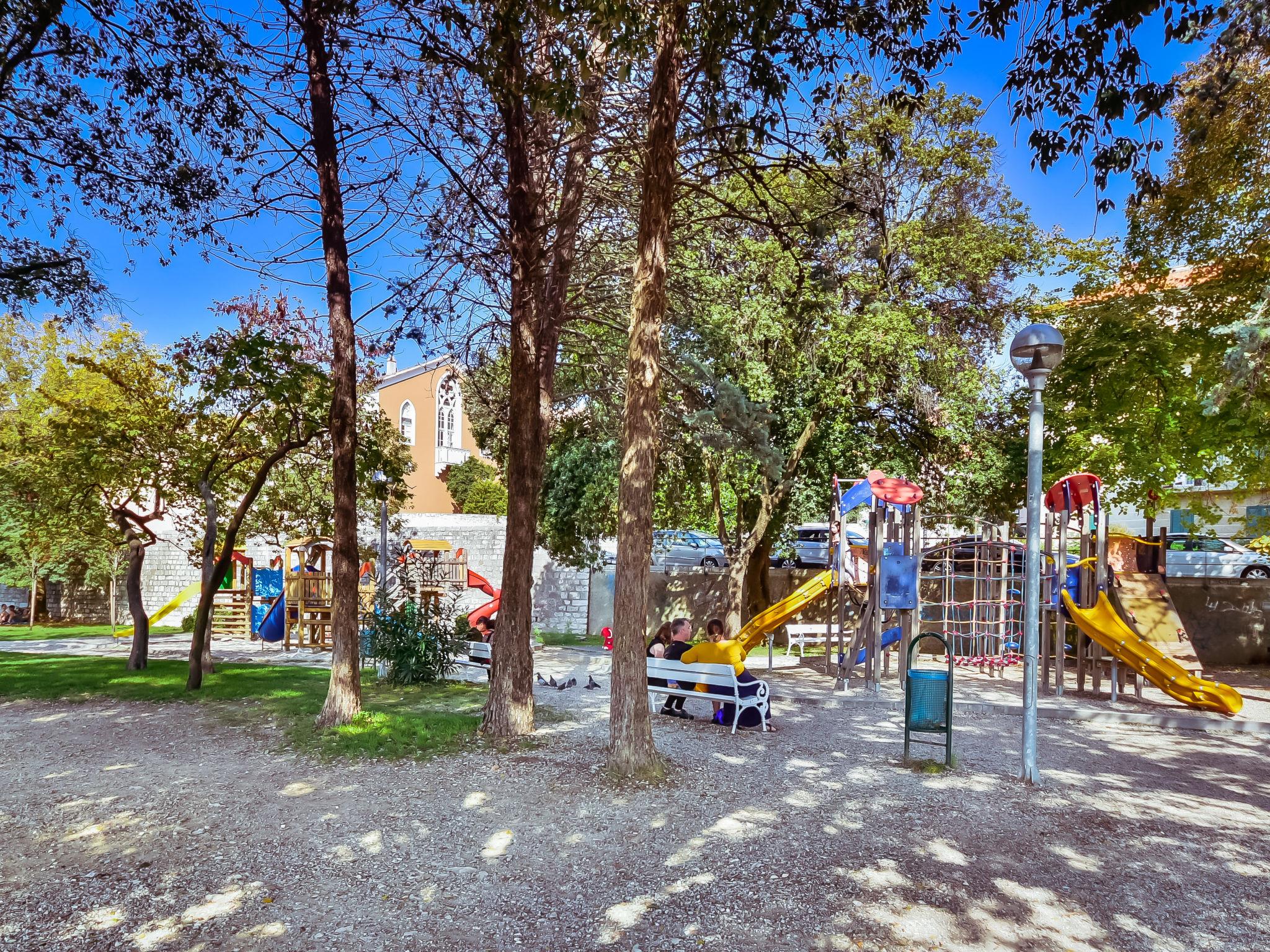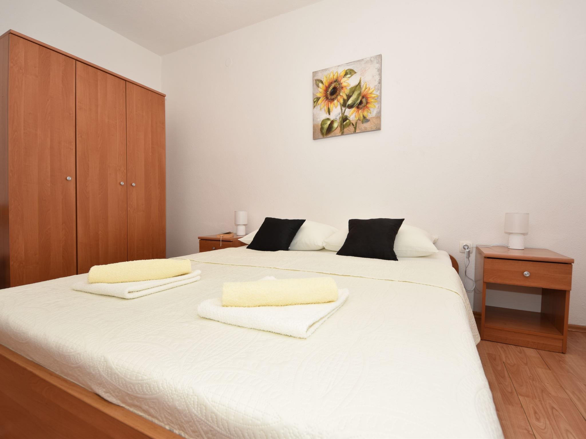 "Katarina", 3-room apartment 60 m2, on the ground floor, south facing position. Living/dining room 25 m2 with TV and air conditioning. Exit to the terrace. 1 room with 1 double bed (2 x 80 cm, length 200 cm). 1 room with 2 beds (90 cm, length 200 cm). Open kitchen (4 hot plates, oven, microwave, freezer, electric coffee machine). Shower/WC. Air-conditioning (extra). No heating option. Terrace 5 m2, roofed. Terrace furniture, barbecue (portable). Facilities: washing machine, iron, hair dryer. Internet (WiFi, free). Maximum 1 pet/ dog allowed.