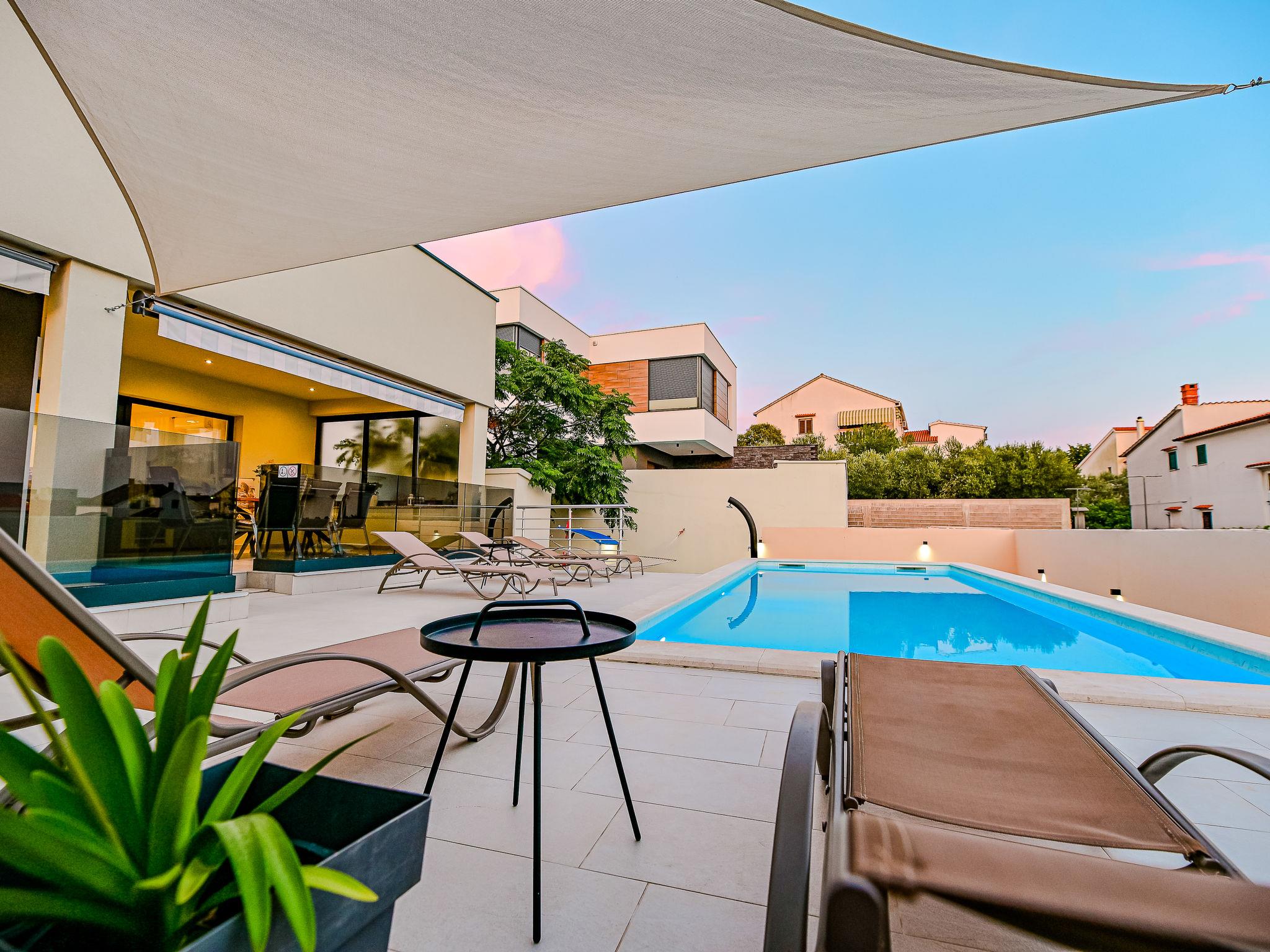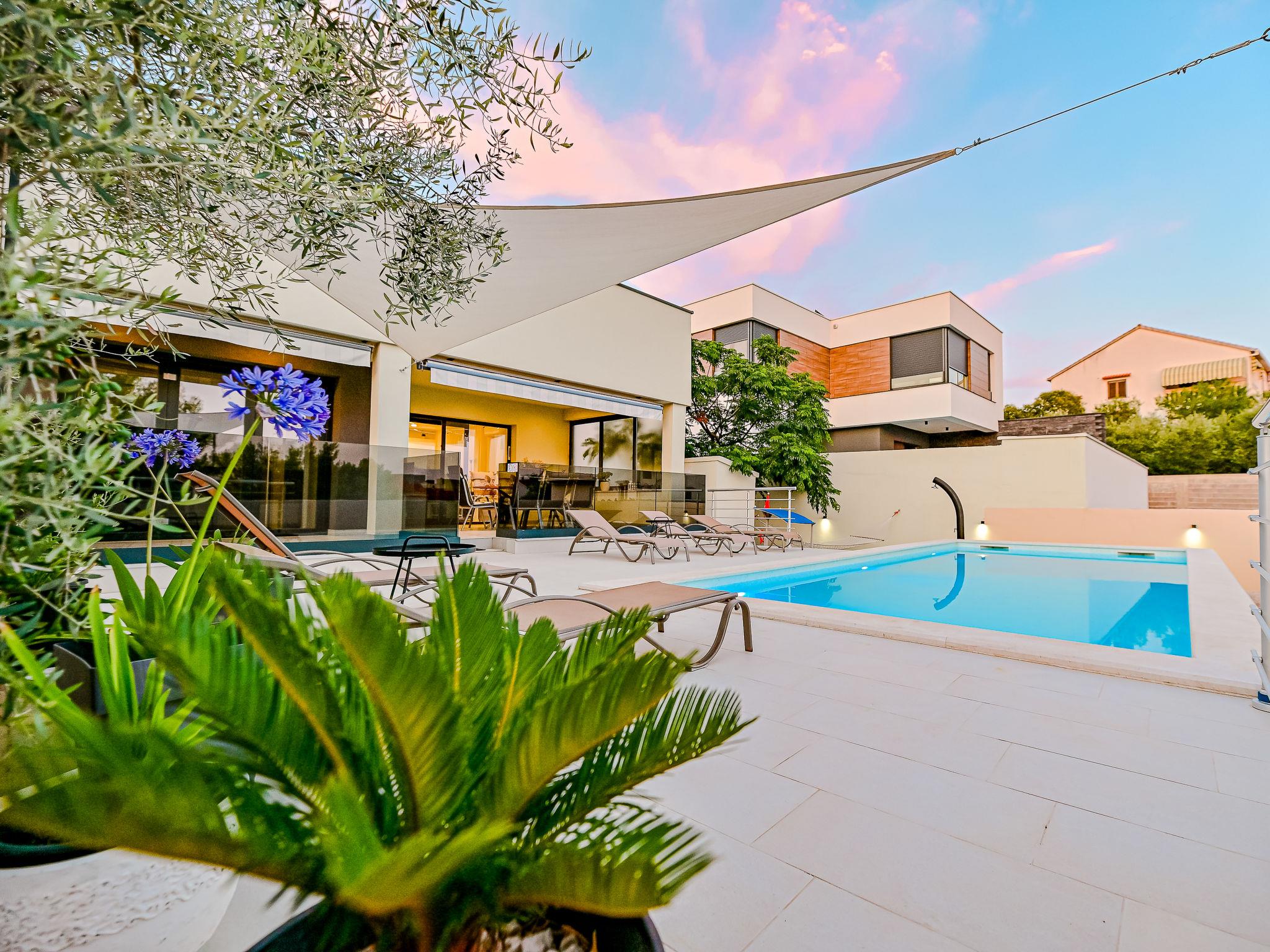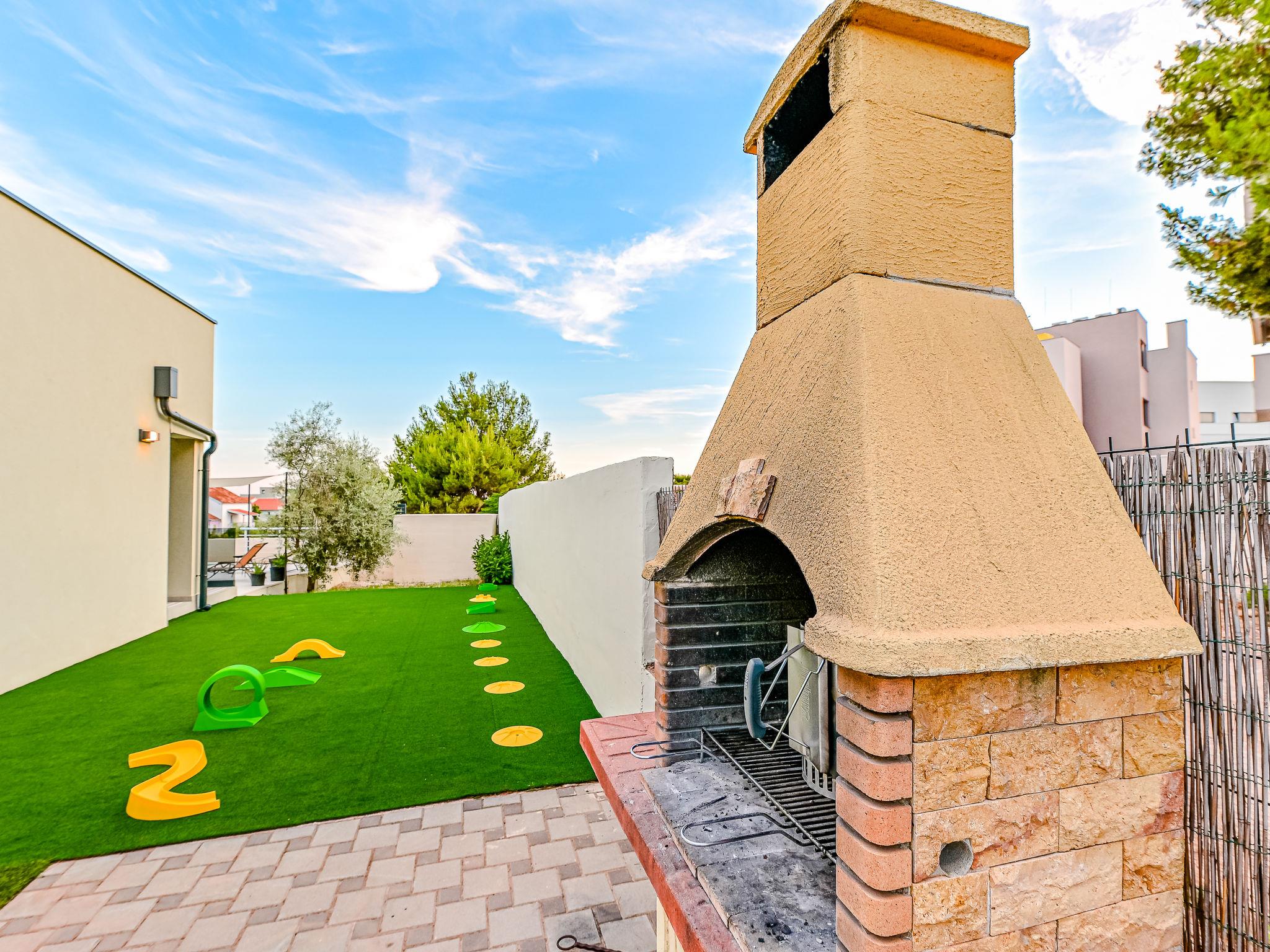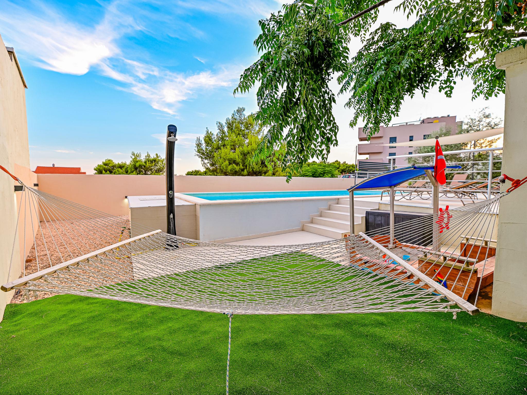 Single-family house "Sportiva". In the district of Bokanjac, 4.8 km from the centre, in a quiet, sunny, elevated position, 2.2 km from the sea, 2.2 km from the beach. Private: property 400 m2 (fenced), swimming pool angular (8 x 4 m, depth 150 cm, seasonal availability: 01.May. - 01.Oct.). Outdoor shower, garden furniture, barbecue. In the house: internet access, fitness room, trampoline, washing machine. Parking (for 2 cars) at the house on the premises. Shop 600 m, restaurant 1 km, bus stop 300 m, pebble beach 2.2 km. Tennis 4.5 km.