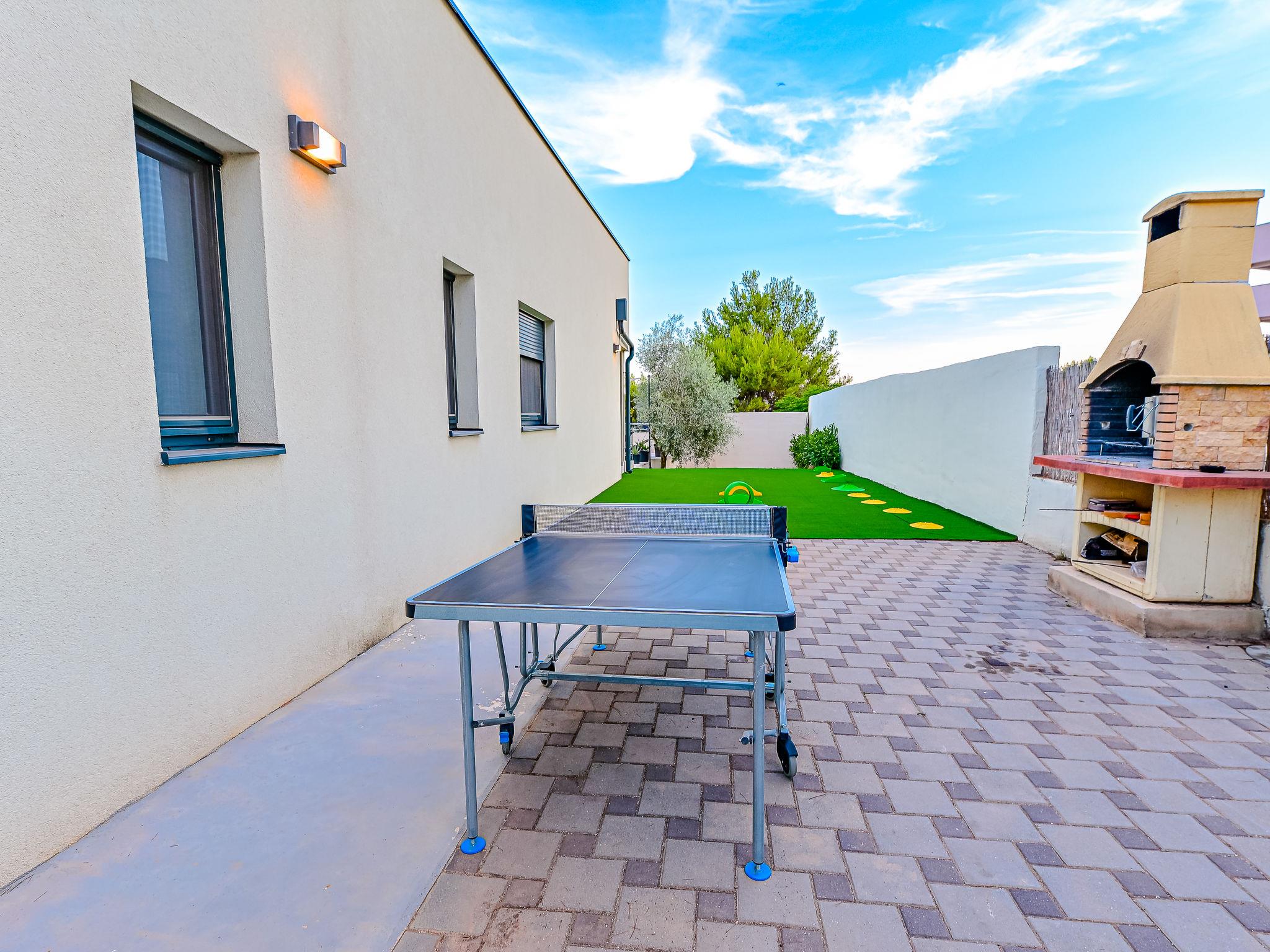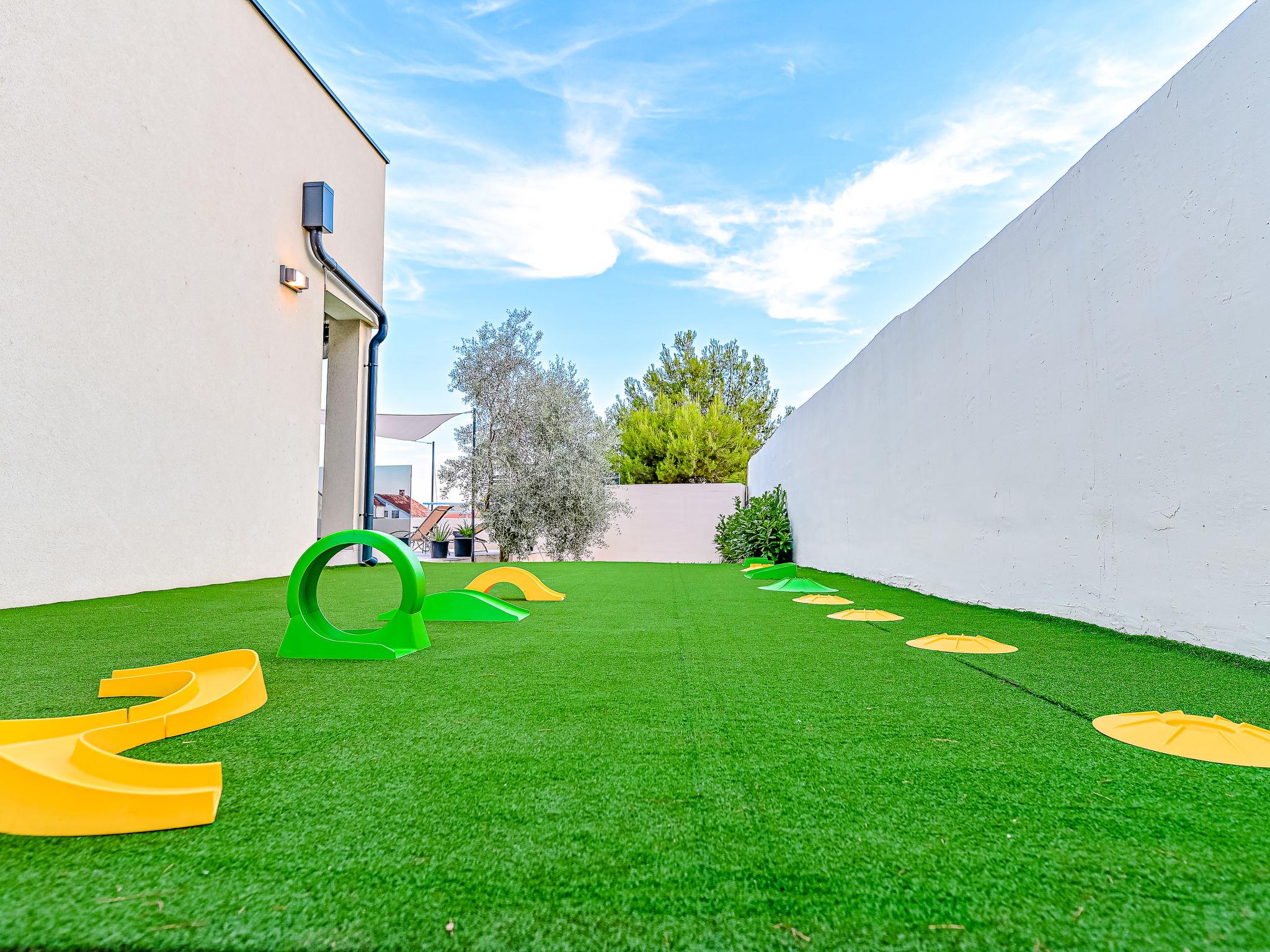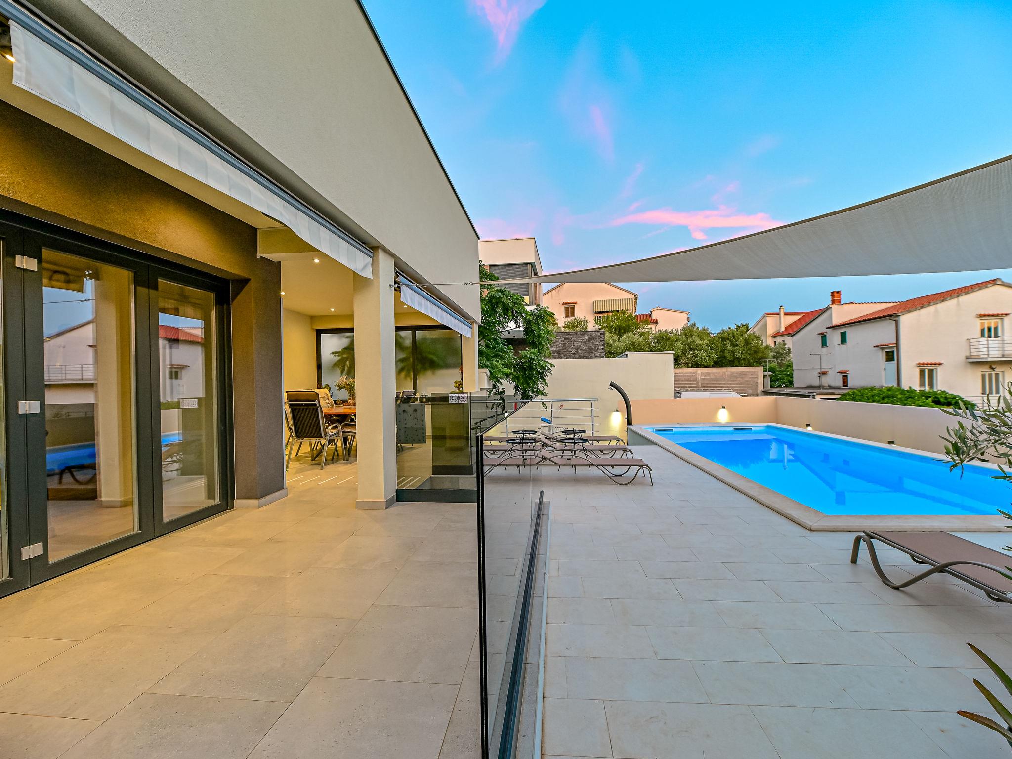 Single-family house "Sportiva". In the district of Bokanjac, 4.8 km from the centre, in a quiet, sunny, elevated position, 2.2 km from the sea, 2.2 km from the beach. Private: property 400 m2 (fenced), swimming pool angular (8 x 4 m, depth 150 cm, seasonal availability: 01.May. - 01.Oct.). Outdoor shower, garden furniture, barbecue. In the house: internet access, fitness room, trampoline, washing machine. Parking (for 2 cars) at the house on the premises. Shop 600 m, restaurant 1 km, bus stop 300 m, pebble beach 2.2 km. Tennis 4.5 km.