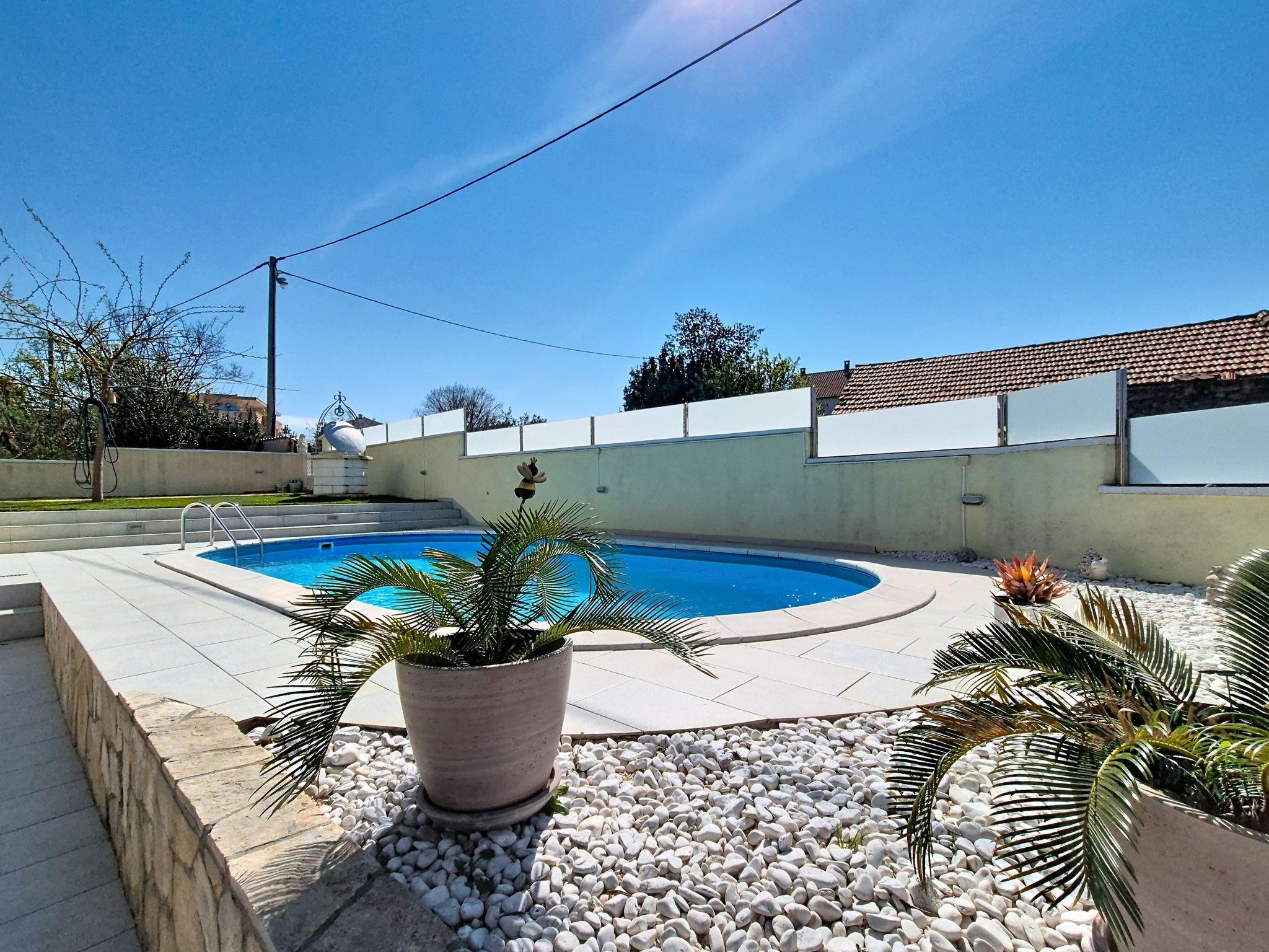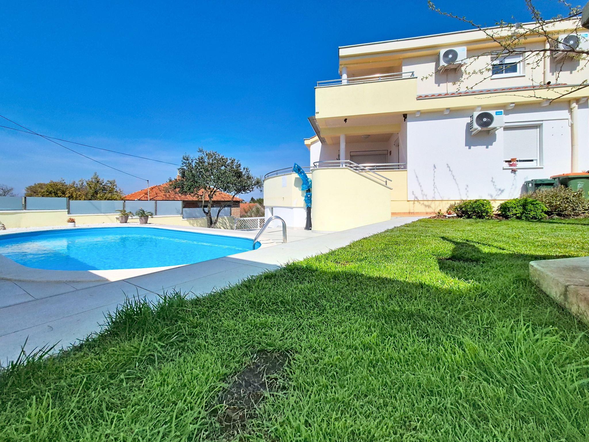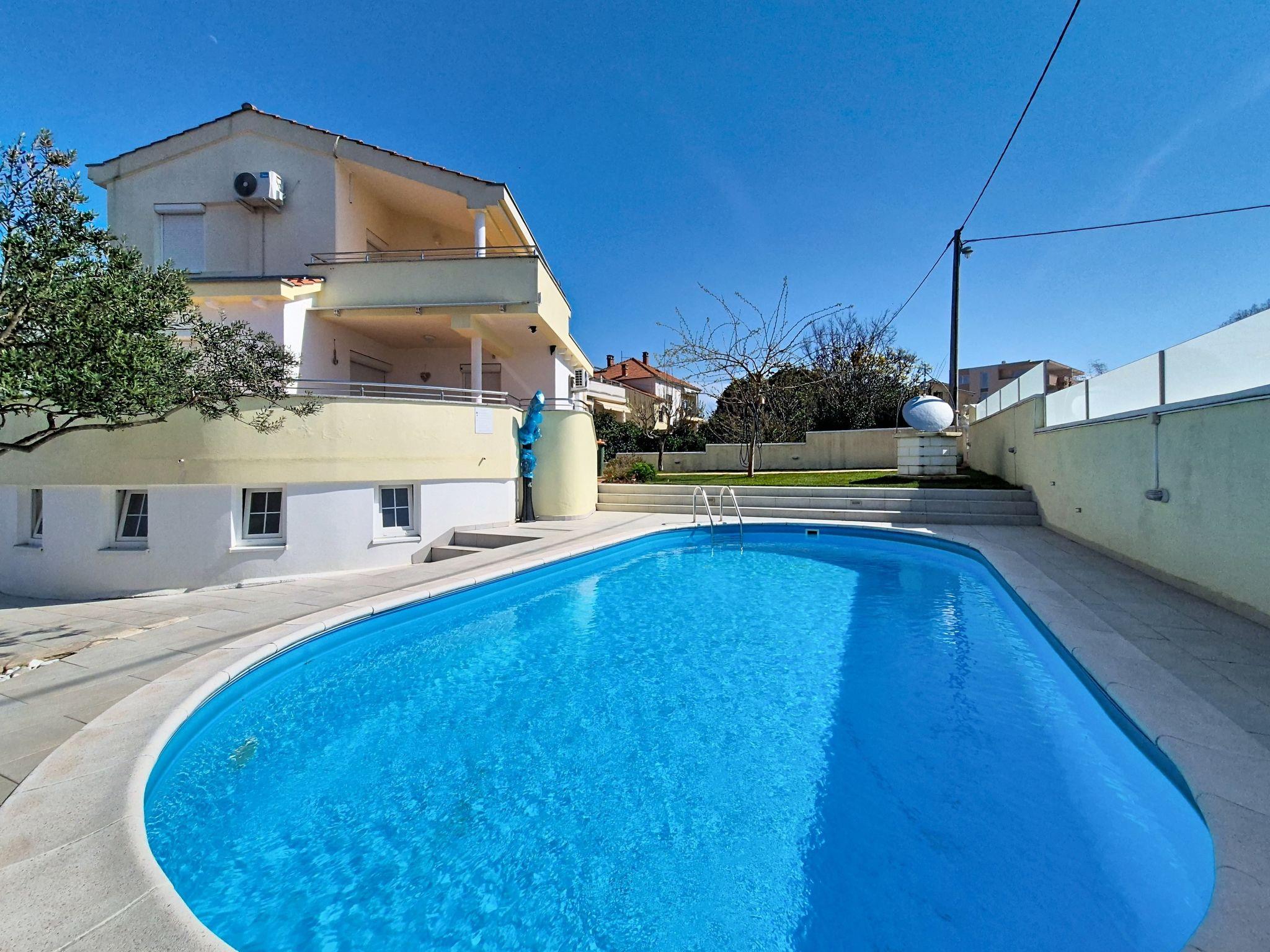 Single-family house "Ivanka", 2 storeys. In the district of Bokanjac, 5 km from the centre, in a sunny, elevated position, 4 km from the sea. Private: property 600 m2 (fenced), swimming pool (33 m2, depth 150 cm, seasonal availability: 27.Apr. - 28.Sep.). Garden furniture, barbecue. In the house: internet access, washing machine, tumble dryer. Parking (for 2 cars) at the house on the premises. Shop 300 m, restaurant 3.5 km, pebble beach 4 km. Tennis 4.5 km. Groups of teenagers on request only.