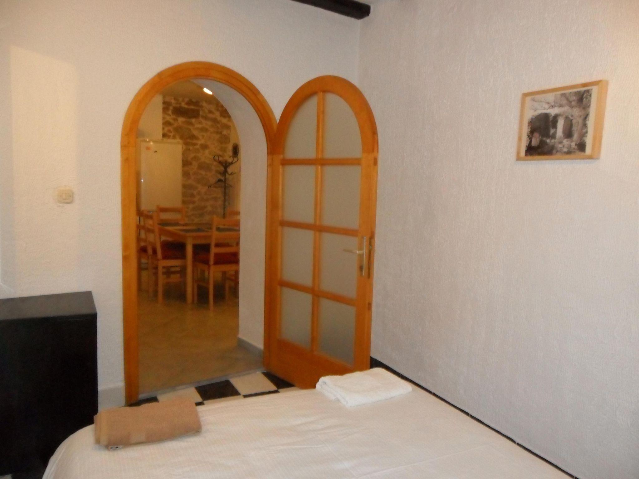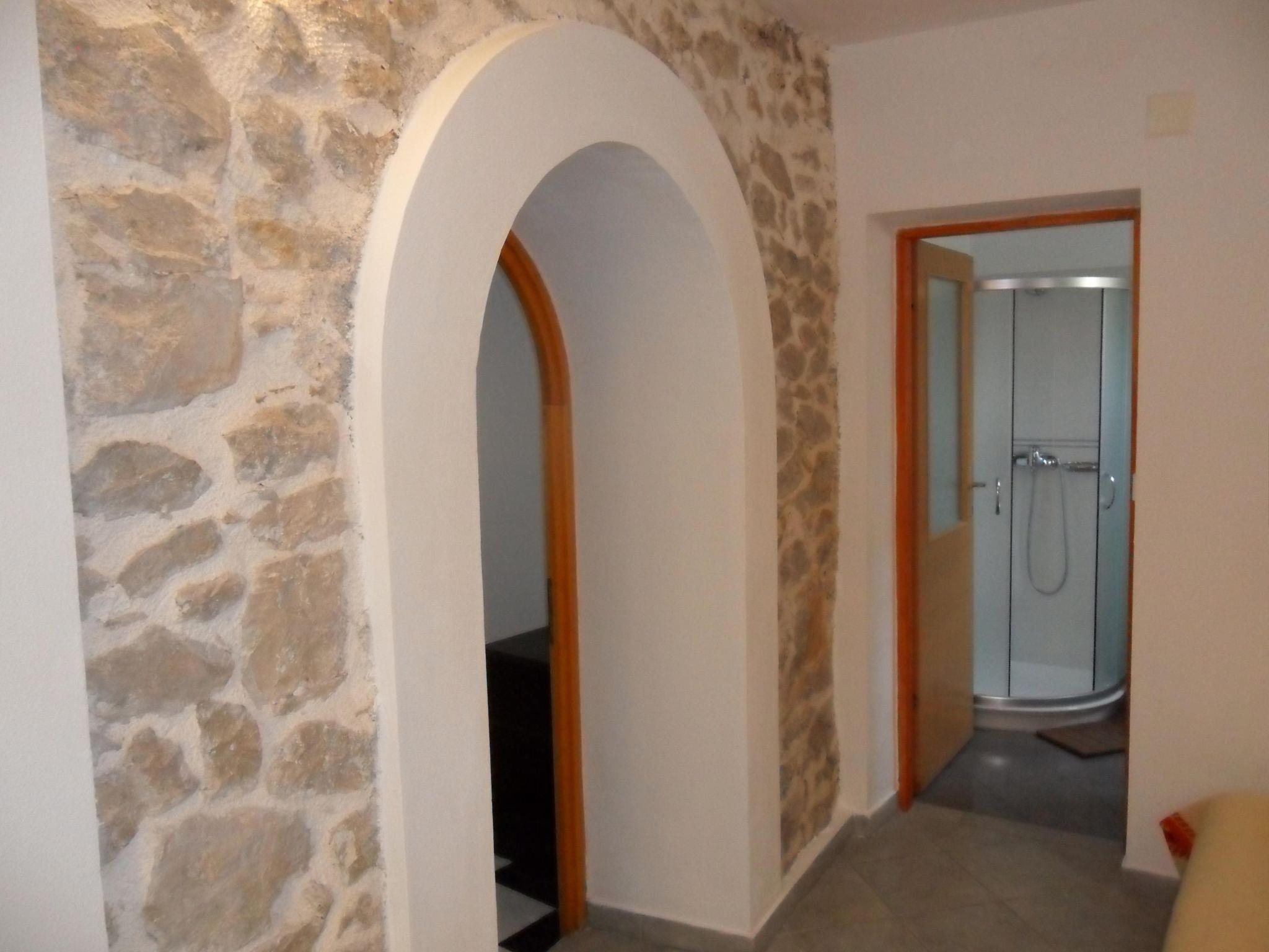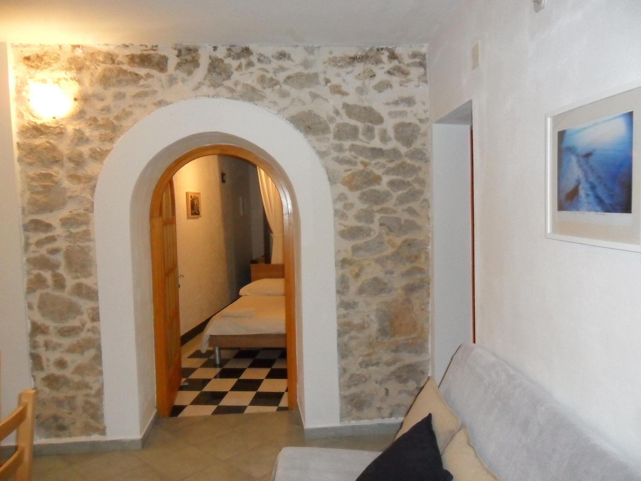 The 45m² apartment on the ground floor of the three-storey residential house consists of a light living and sleeping room with an integrated, open kitchen, a bedroom, and a daylight bathroom. The living room has a comfortable sofa, a digital TV with cable and satellite channels and a dining table with four chairs. The double bed in the living room measures 140 x 190cm. The open kitchen is equipped with a four-zone gas stove with an elegant stainless steel extractor fan, an electric oven, a fridge with a freezer compartment, a kettle, a toaster and a coffee machine. You go through a round archway into the separate bedroom with a double bed (140 x 200cm) and a single bed (90 x 200cm). The daylight bathroom has a very modern shower cubicle, a washbasin with a wall mirror, a hairdryer, a bidet and a toilet. Plenty of bed linen and towels are provided, with a free weekly change, and the reliable wireless Internet connection can be used free of charge. Holiday apartment with modern furnishing, on the ground floor, with a panoramic view over the bay and the boat jetty from the terrace