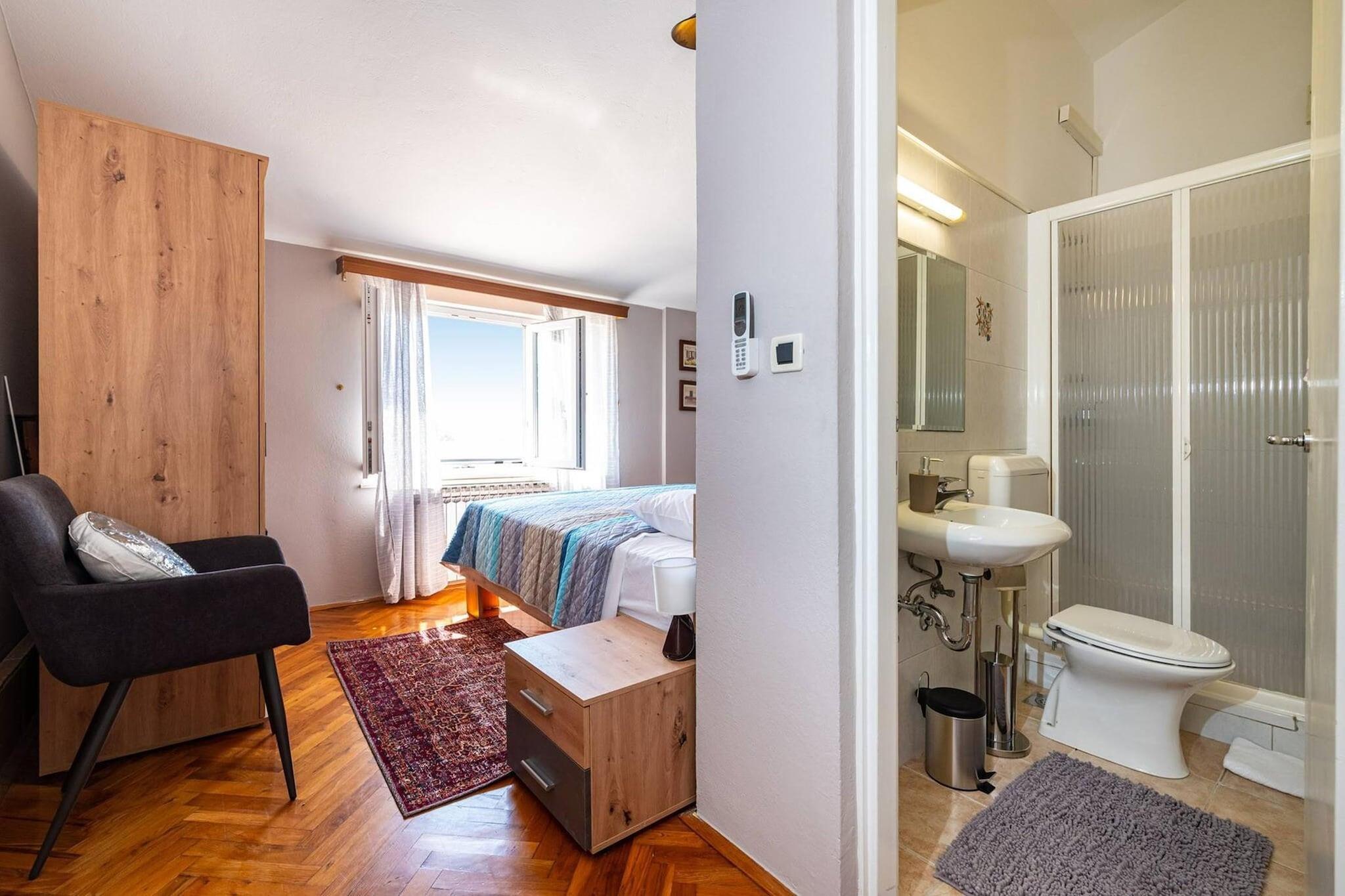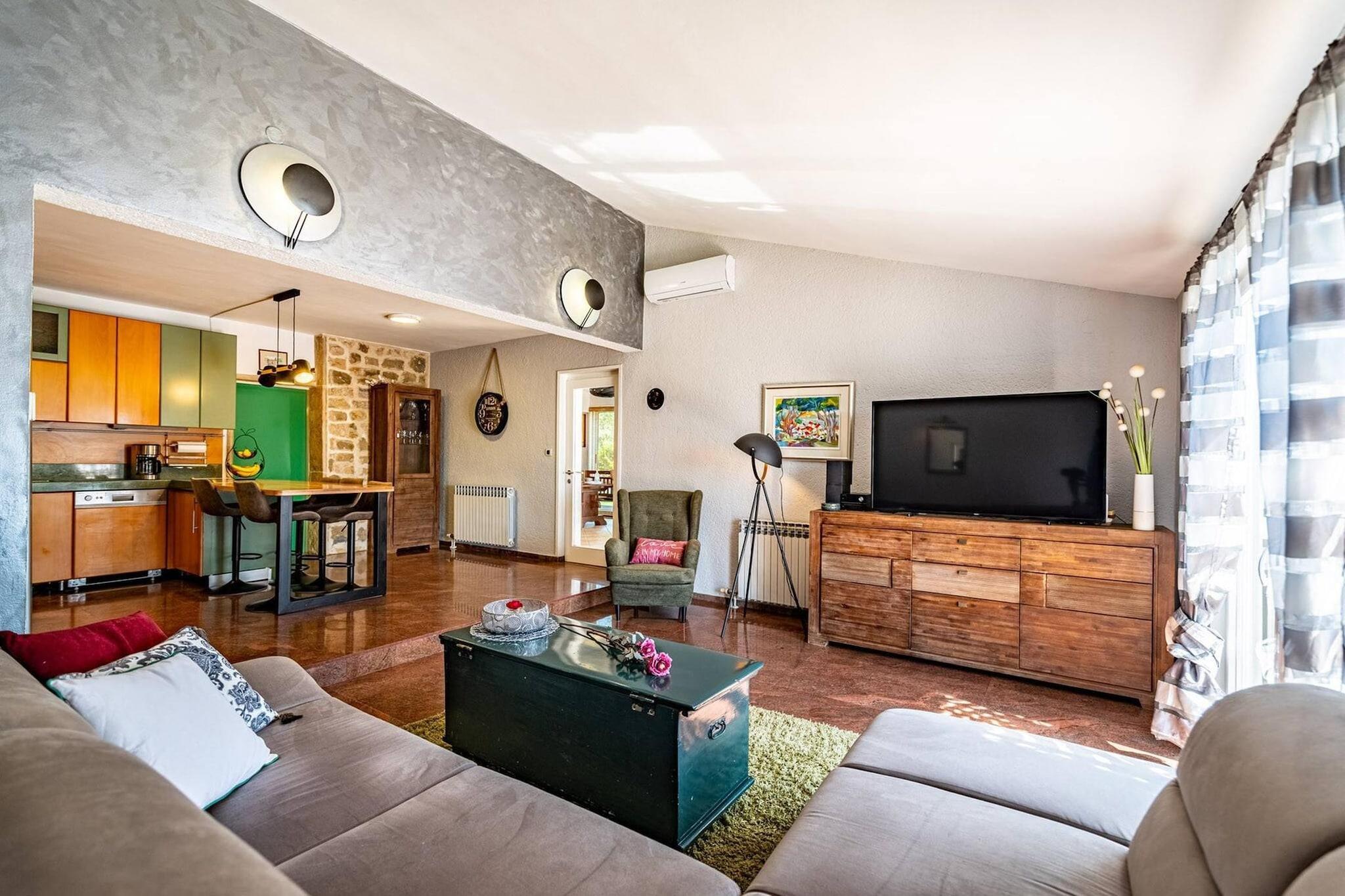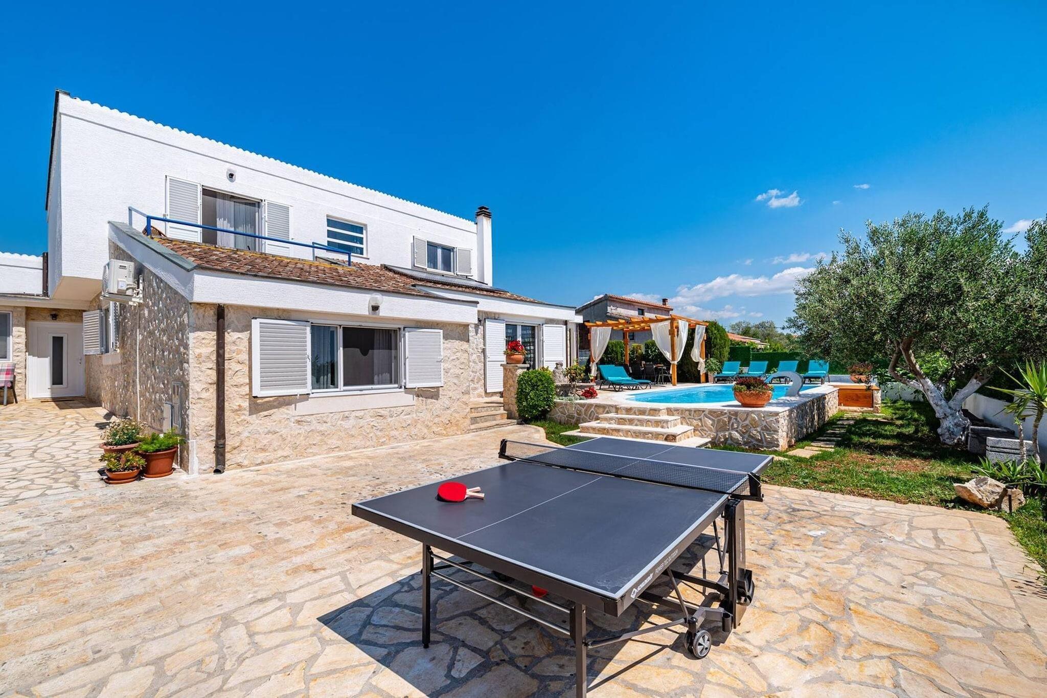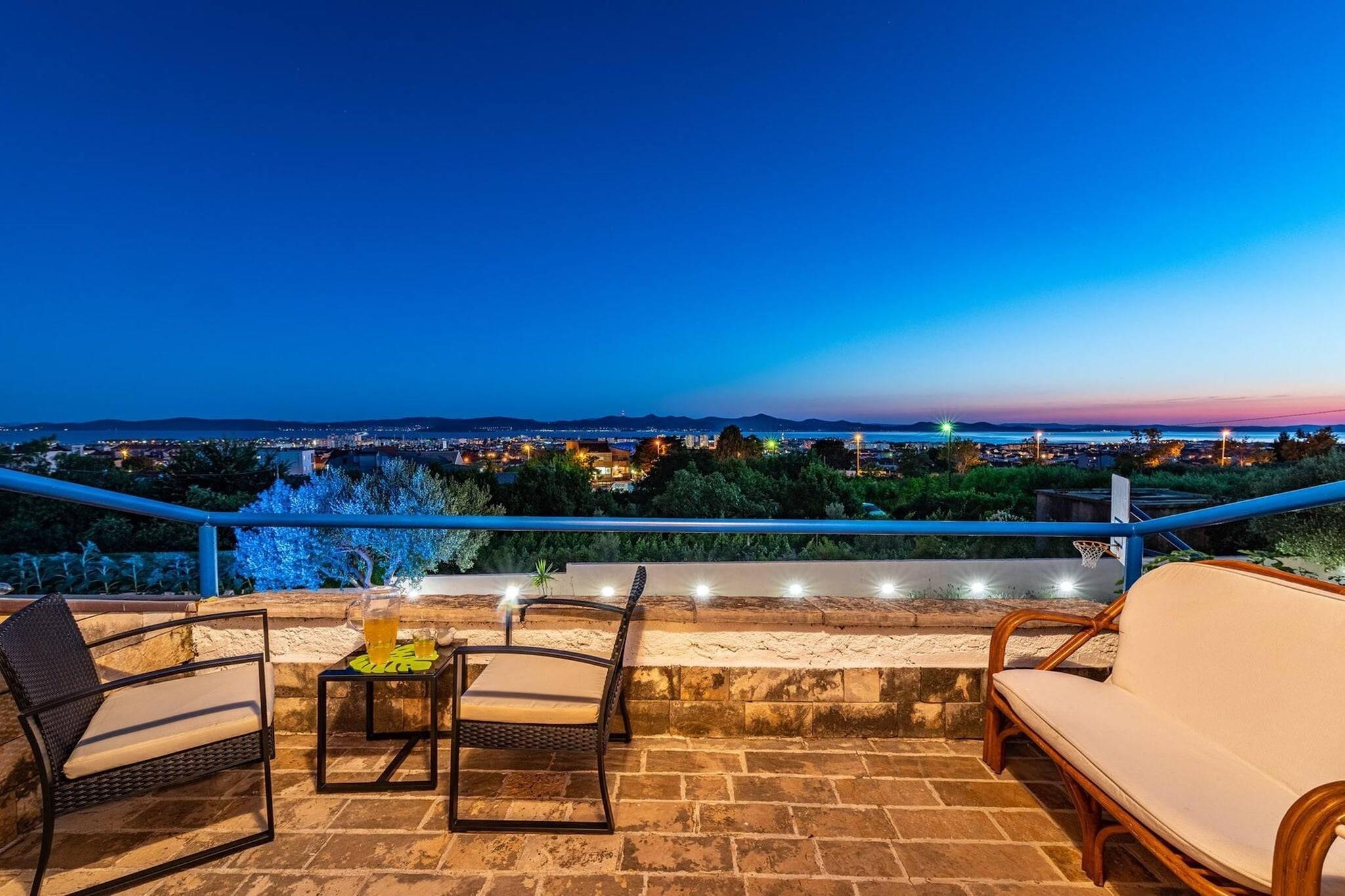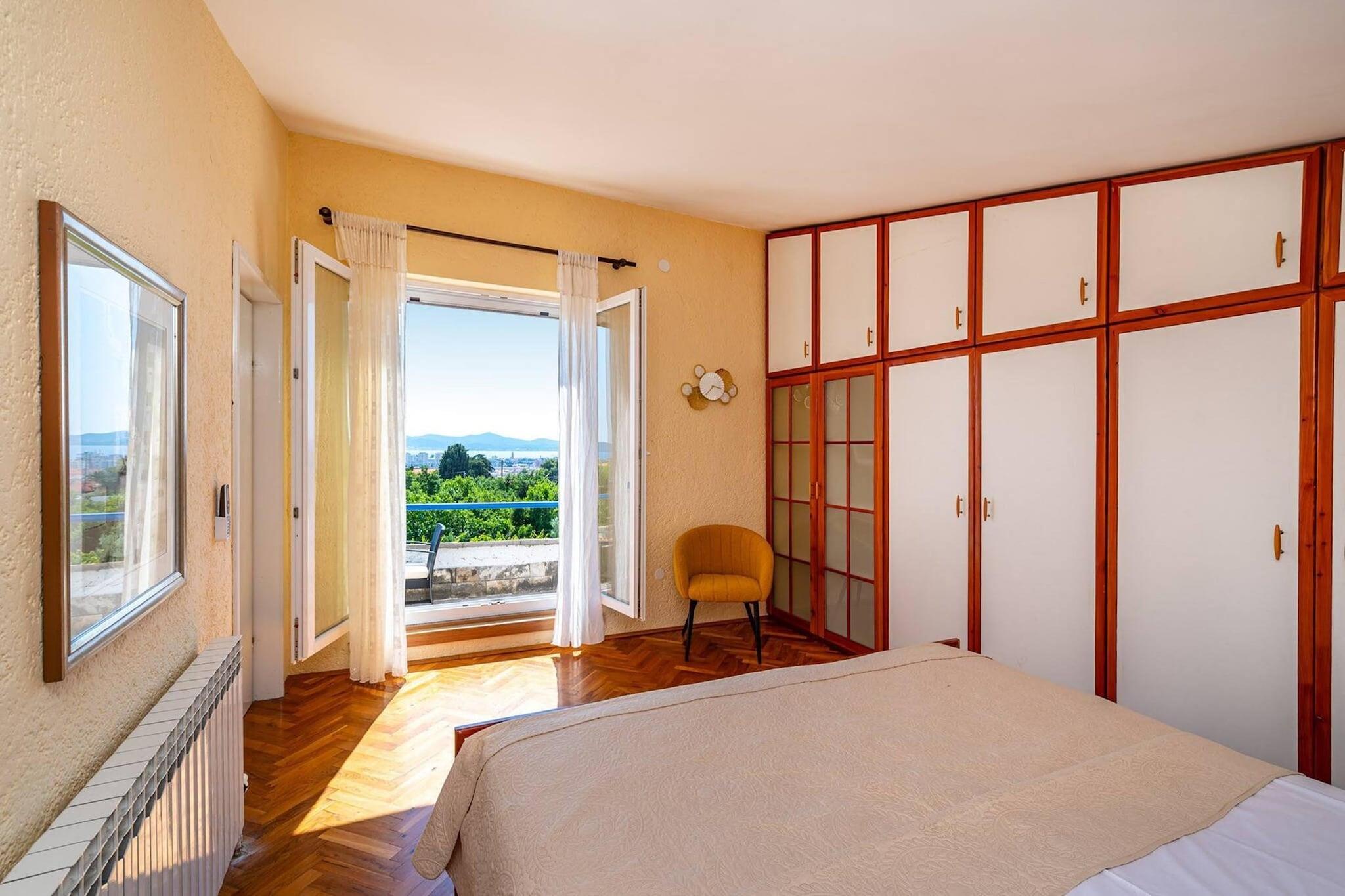 Beliggende højt på en grøn bakke i et roligt boligområde tilbyder denne villa et virkelig spektakulært udsigtspunkt med udsigt over byen Zadar, det glitrende Adriaterhav og de fjerne øer. Dette rummelige feriehus er et ideelt tilflugtssted for op til ni gæster og er perfekt til to familier, der søger komfort og natur. Fra det øjeblik du ankommer, vil du føle dig velkommen af panoramaudsigten og løftet om et fredeligt ophold. Interiøret er både praktisk og charmerende. Ud over den rummelige stue og spisestue og det fuldt udstyrede køkken vil du opdage en dejlig taverna med en stenpejs - det perfekte sted til hyggelige aftener. Med fem varierede soveværelser og to komplette badeværelser plus et ekstra toilet er der masser af plads til alle. Direkte adgang til en balkon sikrer, at du kan nyde den spektakulære udsigt indefra. Udenfor er din private pool midtpunktet, komplet med hydromassage og et modstrømssystem til aktive svømmere. Den store, indhegnede have tilbyder en overdækket terrasse til udendørs spisning og masser af sjove aktiviteter såsom trampolin, bordtennis og basketballbane. Alt hvad du behøver er i nærheden: en restaurant og et købmandsforretning ligger kun fem minutters gang ned ad bakken. Du er også kun 4 km fra Zadars gamle bydel, hvor du kan udforske Havorglet og Hilsen til Solen. Denne villa er et røgfrit miljø, og selvom rygning ikke er tilladt inde i ejendommen, byder vi dine velopdragne kæledyr varmt velkommen.