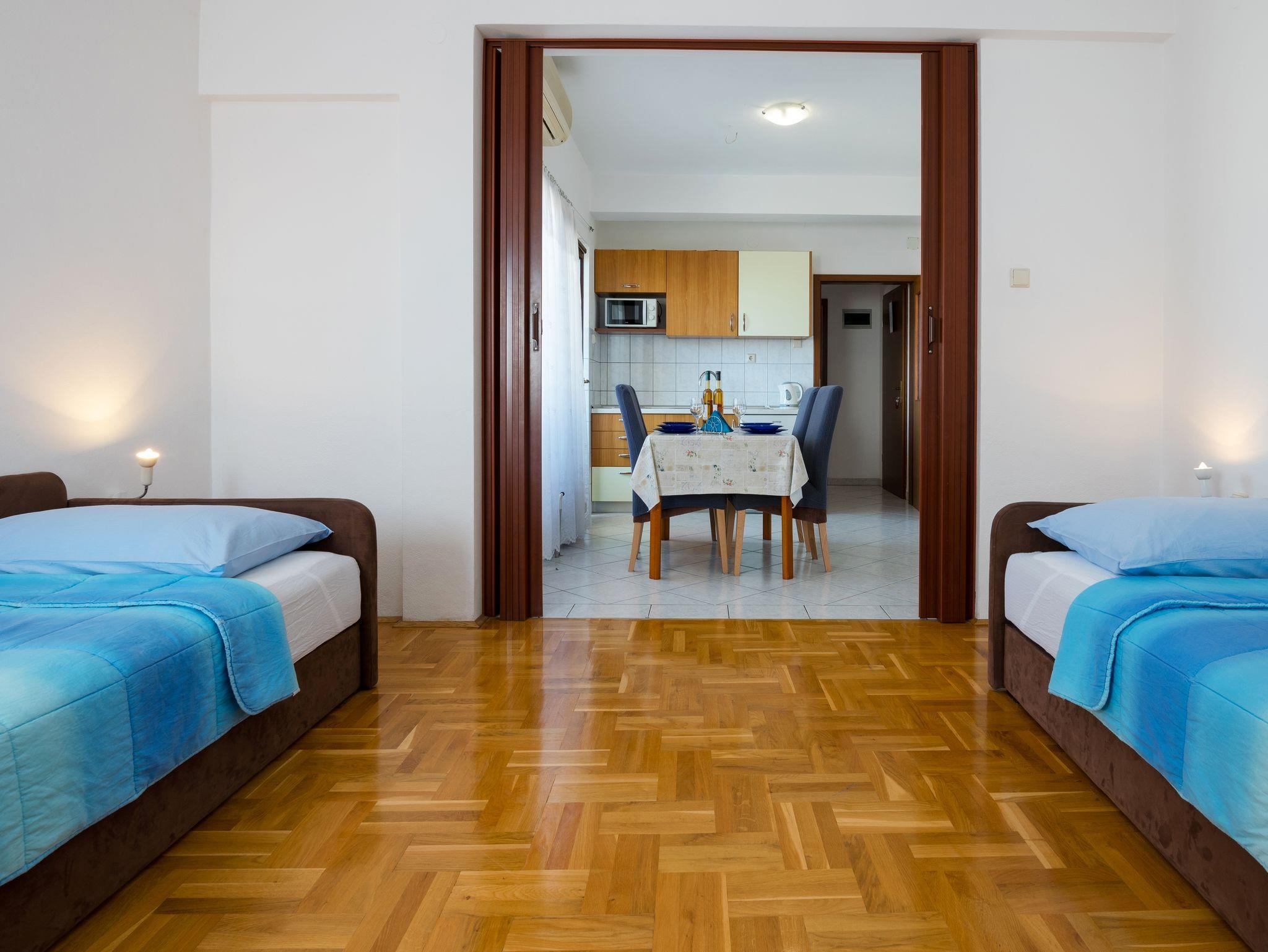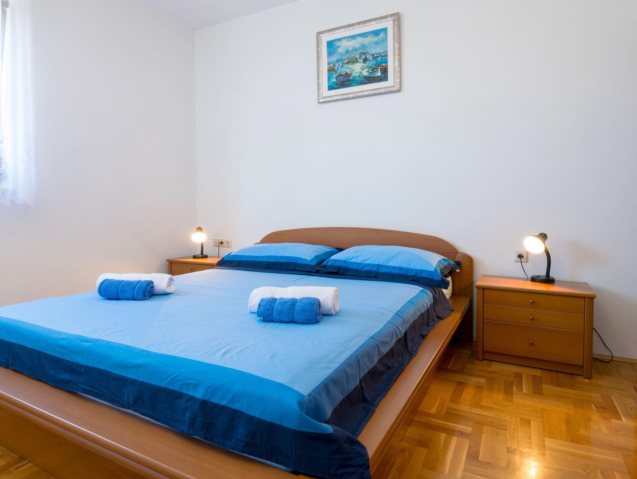 Ferienwohnung bietet Platz für 4 Gäste. Die Betten sind in Schlafzimmern, die es 1 gibt, und in Wohnzimmer, innerhalb einer Gesamtfläche von 40m2, angeordnet. Die Gäste haben eine eigene Terrasse zur Verfügung, auf der sie in warmen Sommernächten genießen können. Das Apartment bietet Meerblick. Es ist erlaubt, Speisen auf dem Gemeinschafts-Grill vorzubereiten. IM PREIS INBEGRIFFEN: Kurtaxe, Endreinigung, Klimatisierung, Parkplatz, Internet, Zusatzbett, Bügeleisen, Bügelbrett, Föhn. VERBINDLICHE ZUSÄTZLICHE KOSTEN: Aufzahlung für Kurzaufenthalte (prozentualer Zuschlag pro Nächtigungsanzahl: 30% - 1, 20% - 2, 10% - 3). UNVERBINDLICHE ZUSÄTZLICHE KOSTEN: Wäschewaschen (5,00 € Waschen). Die Verfügbarkeit zusätzlicher Dienstleistungen in Ihrem reservierten Termin und die Preise derselben (falls nicht aufgeführt) müssen im Voraus überprüft werden. Zusätzliche Dienstleistungen die in der Zahlungsaufforderung nicht aufgeführt sind werden direkt beim Vermieter bezahlt, angenommen der Gast nutzt auch diese.