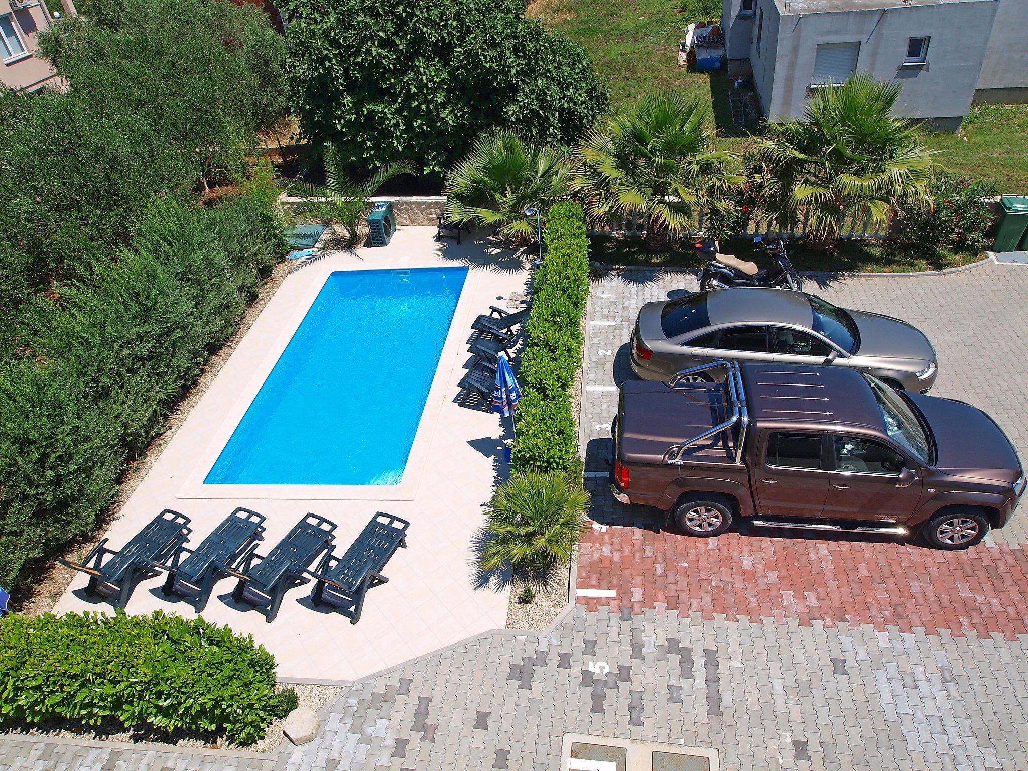 Bibinje 10 km from Zadar: Apartment house "Marko". 2 km from the centre of Bibinje, in a sunny position, 70 m from the sea, 70 m from the beach. For shared use: property 700 m2 (fenced), well-kept garden with lawn and trees, swimming pool angular heated (7 x 3 m, 24 m2, depth 150 cm, seasonal availability: 15.May. - 19.Oct.) with internal staircase. Outdoor shower, poolhouse with fridge, WC and cooking stove, terrace (32 m2), garden furniture, barbecue, children's playground (swing). In the house: internet access. Parking at the house on the premises. Shop, restaurant 650 m, café 100 m, bus stop 2.9 km, pebble beach 70 m, diving center 100 m, public bathing area 70 m. Marina 50 m, children's playground 100 m. Please note: private mooring (extra) on request. For shared use:terrace (20 m2). Possibility of renting house owner's car and trips by owner's boat (on request, extra).