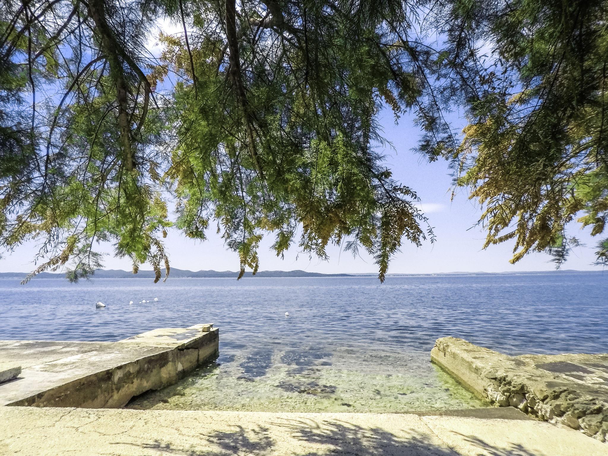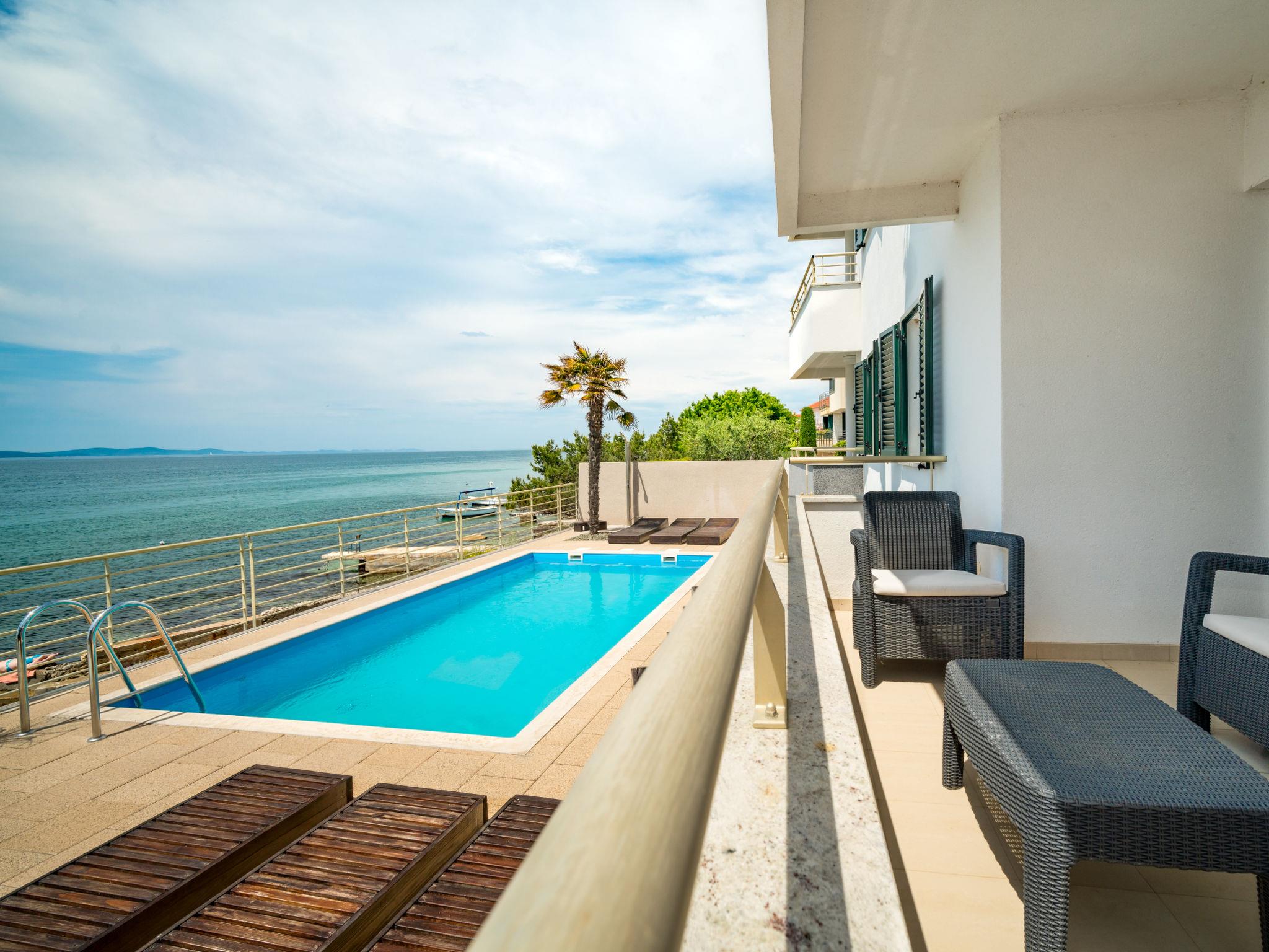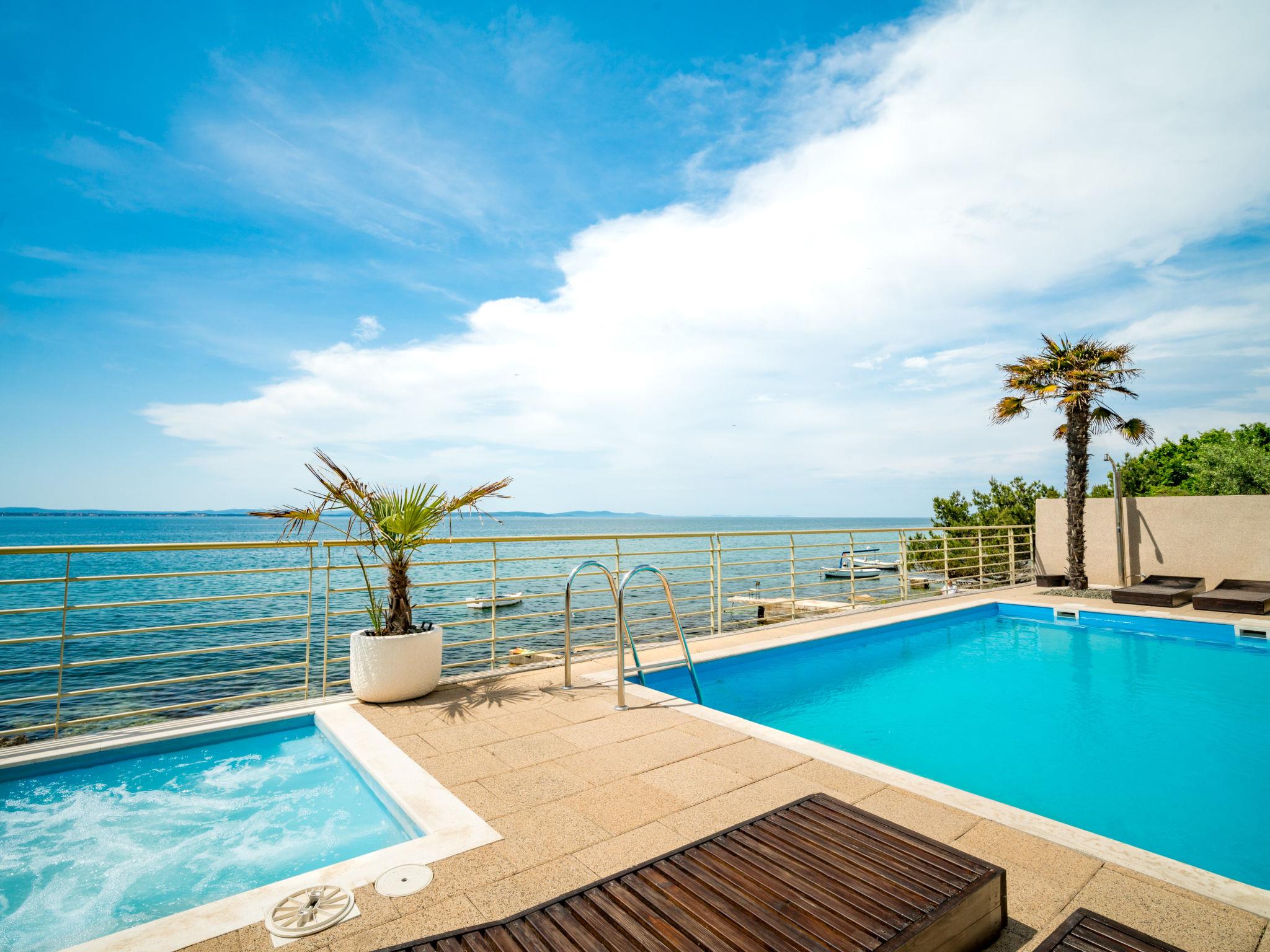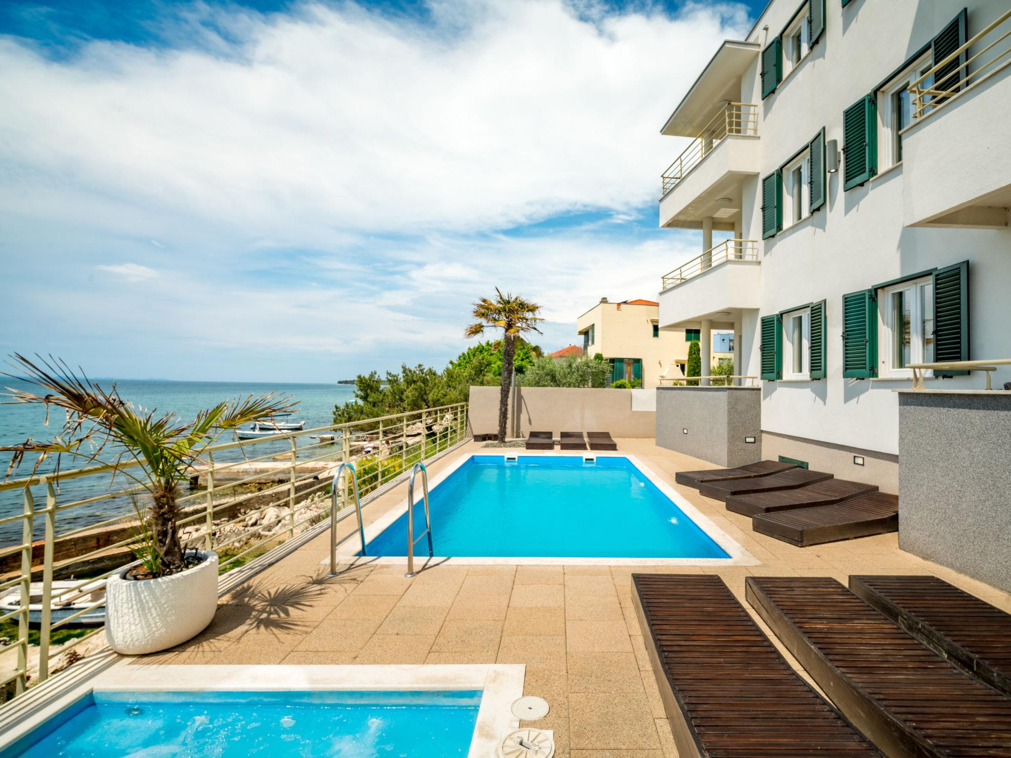 Kožino 8 km from Zadar: Single-family house "Villa Kožino", 3 storeys. In a quiet, sunny position, at the seaside, on the beach. Private: property 355 m2 (fenced), swimming pool angular, heated (8 x 3 m, 28 m2, depth 150 cm, seasonal availability: 30.Mar. - 26.Oct.). Outdoor shower, hot tub, pergola (15 m2), garden furniture, barbecue. In the house: internet access, washing machine. Parking (for 5 cars) at the house on the premises. Shop 200 m, restaurant 1.5 km, rocky beach, concrete beach 10 m. Tennis 8 km. Nearby attractions: Aquapark 8 km. The house consists of 6 apartments rented as one unit.