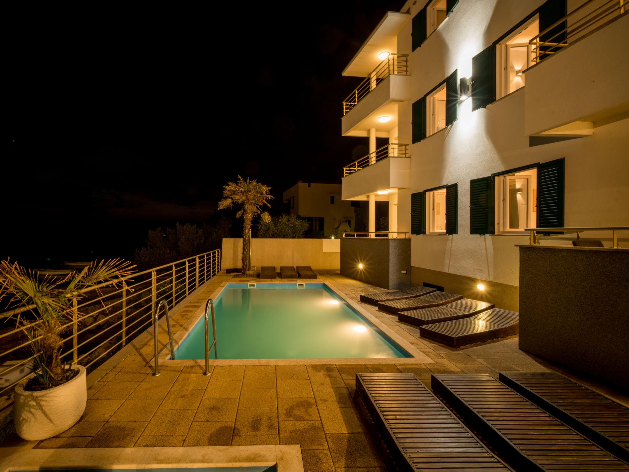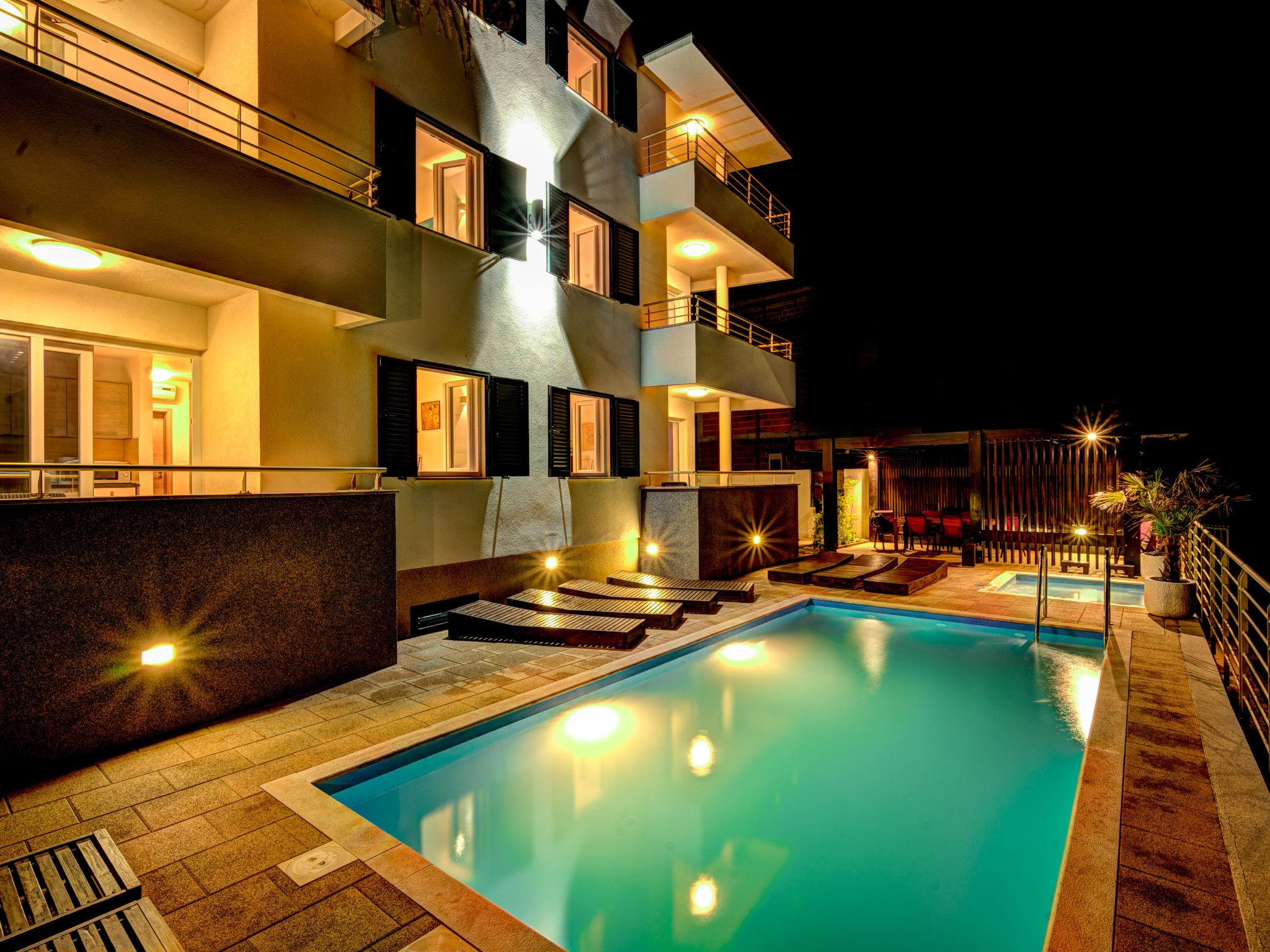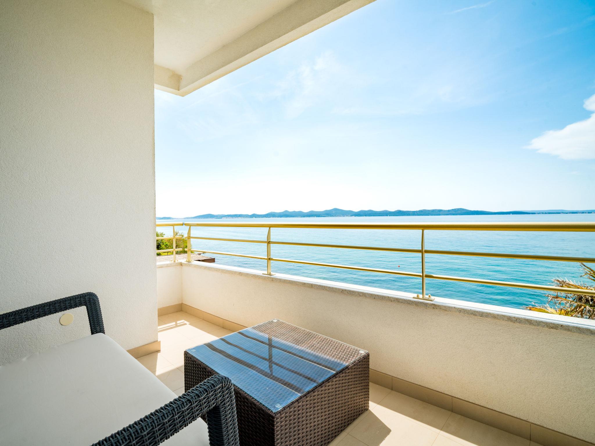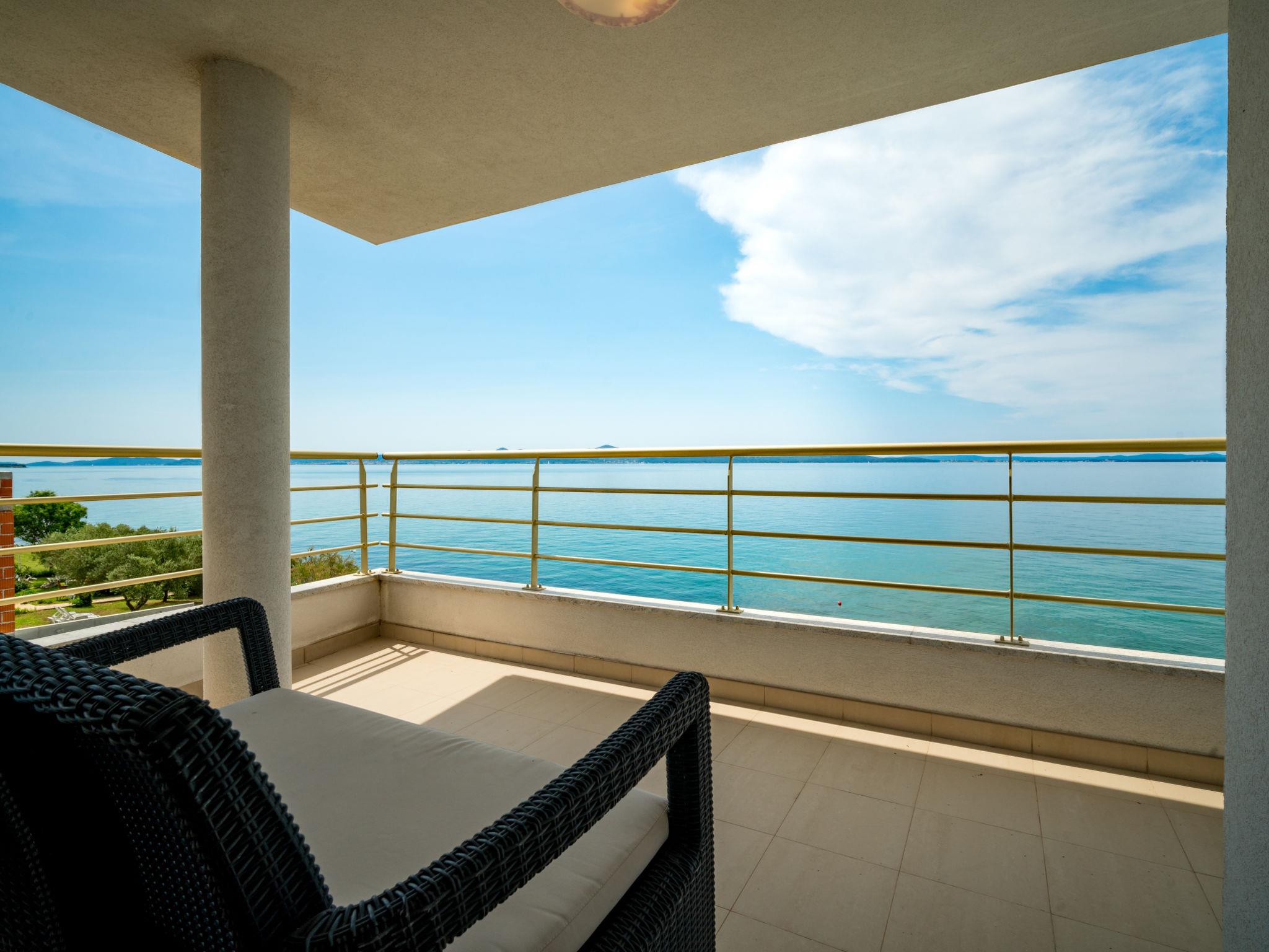 Kožino 8 km from Zadar: Single-family house "Villa Kožino", 3 storeys. In a quiet, sunny position, at the seaside, on the beach. Private: property 355 m2 (fenced), swimming pool angular, heated (8 x 3 m, 28 m2, depth 150 cm, seasonal availability: 30.Mar. - 26.Oct.). Outdoor shower, hot tub, pergola (15 m2), garden furniture, barbecue. In the house: internet access, washing machine. Parking (for 5 cars) at the house on the premises. Shop 200 m, restaurant 1.5 km, rocky beach, concrete beach 10 m. Tennis 8 km. Nearby attractions: Aquapark 8 km. The house consists of 6 apartments rented as one unit.