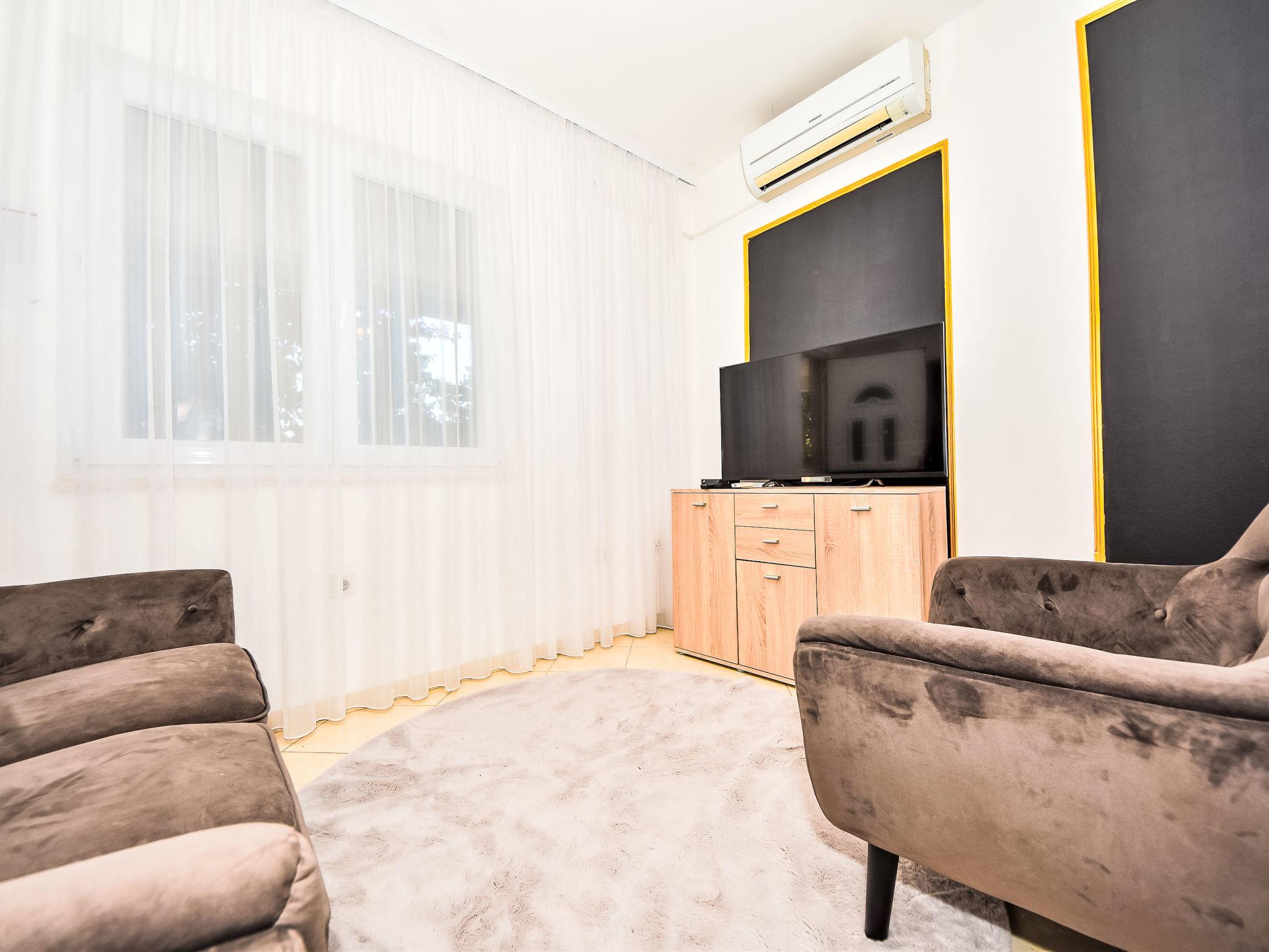 3-room apartment 50 m2, on the ground floor, north-east facing position. Living/dining room 25 m2 with satellite TV and air conditioning. 1 room with 1 french bed (160 cm, length 200 cm). 1 room with 1 french bed (160 cm, length 200 cm). Exit to the terrace. Open kitchen (4 hot plates, oven, freezer, electric coffee machine). Shower/WC. Terrace 8 m2, roofed. Terrace furniture. Facilities: Internet (WiFi, free).
