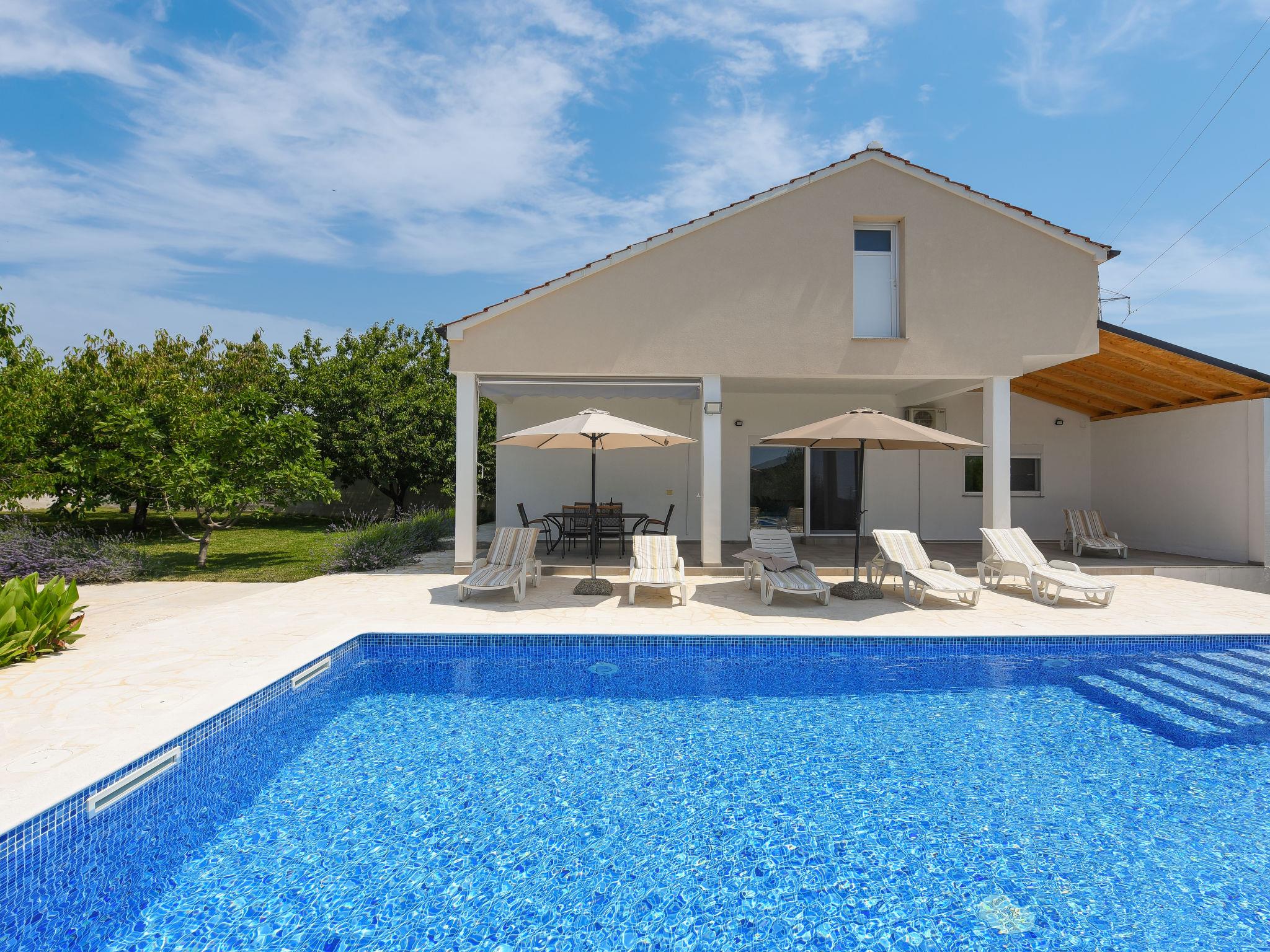 Galovac 10 km from Sukošan: Single-family house "Anima". In a quiet, sunny position, 10 km from the sea. Private: property 1'000 m2 (fenced), wildlife garden and flowers, natural garden 1'200 m2 (fenced), swimming pool (9 x 5 m, 45 m2, depth 150 cm, seasonal availability: 01.May. - 26.Sep.) with internal staircase. Outdoor shower, garden furniture, barbecue. In the house: internet access, washing machine. Parking (for 3 cars) at the house on the premises. Shop 1 km, restaurant 11 km, bus stop 10.1 km, pebble beach 11 km. Groups of teenagers on request only.