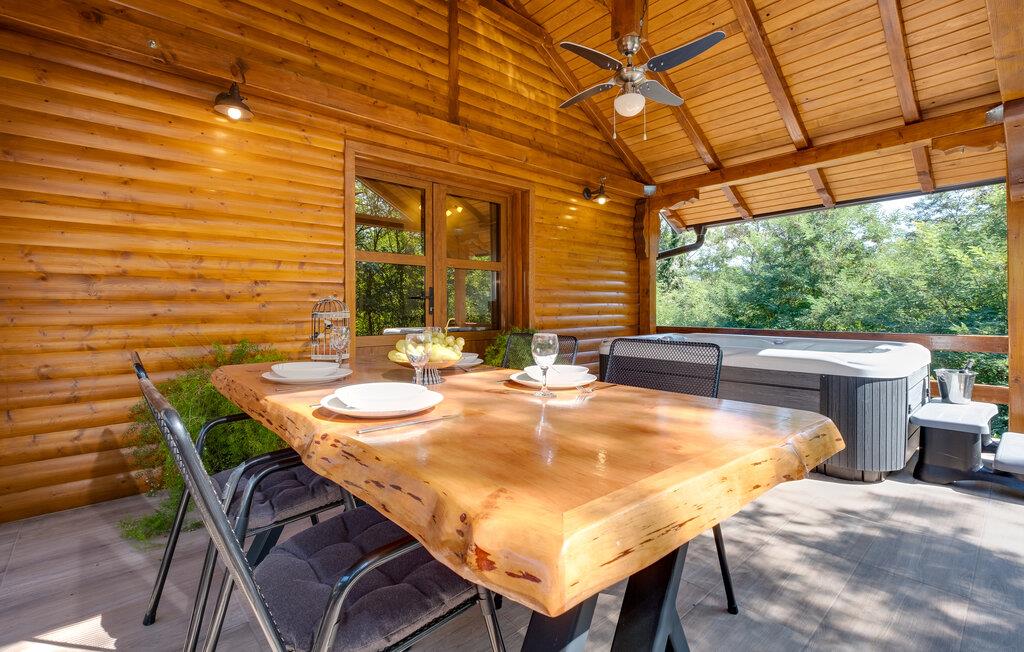 Omgivet af masser af grønt og uberørt natur er det hyggelige træhus det perfekte tilflugtssted for par eller små familier. Start dagen med morgenmad ved det smukke træbord på den overdækkede terrasse, mens I nyder den friske morgenluft. Senere kan I slappe af i spabadet og lade roen i omgivelserne påvirke jer.