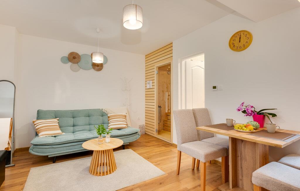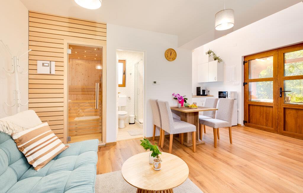 Indretningen af huset er indbydende og moderne. I opholdsstuen venter der jer en komfortabel sofa, hvor I kan slappe af. Køkkenet giver mulighed for at tilberede mindre retter eller snacks til jeres udflugter. Gå heller ikke glip af den beroligende varme i jeres egen sauna.