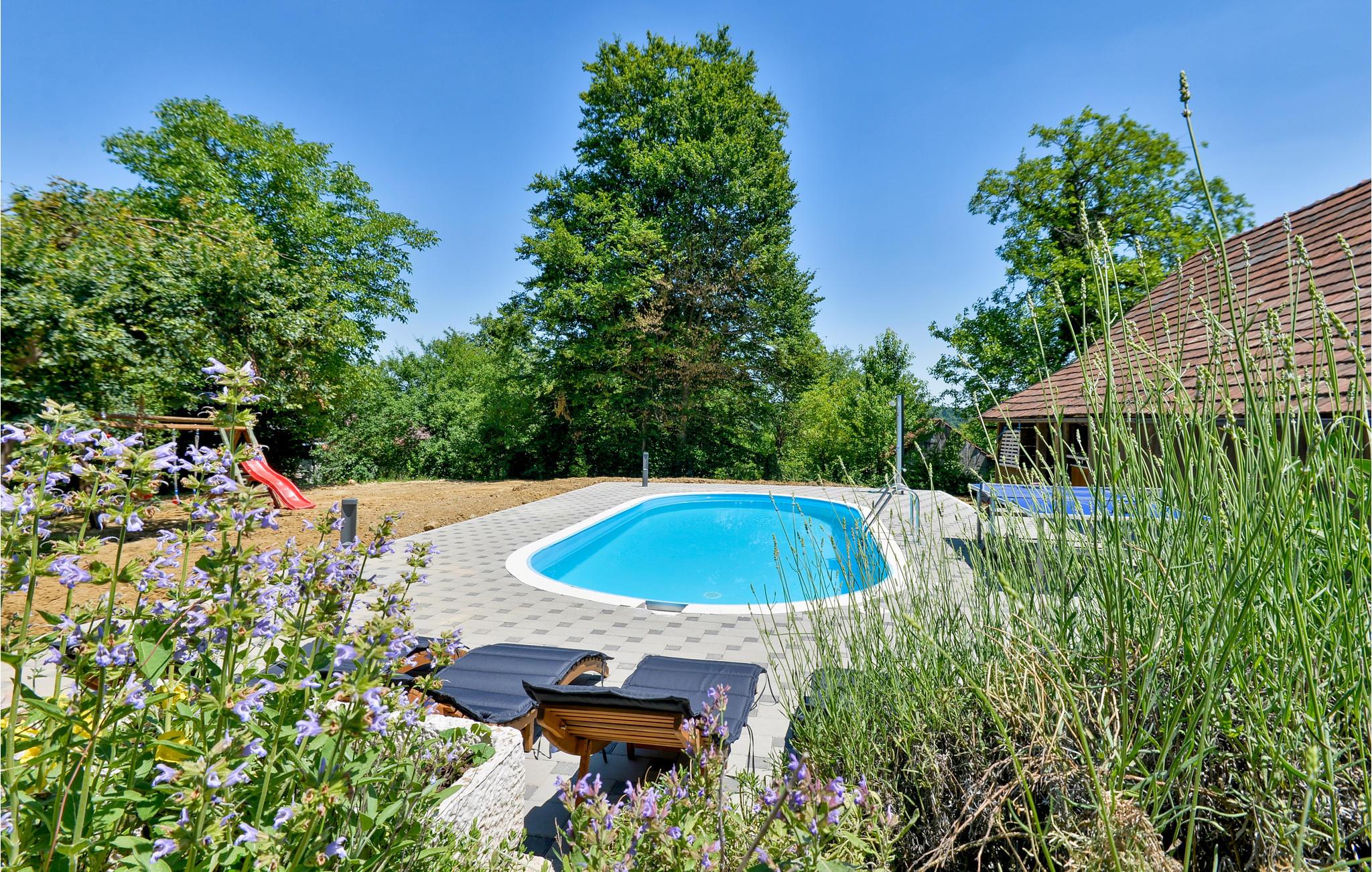 Udenfor tilbyder poolen vidunderlig forfriskning på varme dage, og solen kan nydes fuldt ud i de medfølgende liggestole.