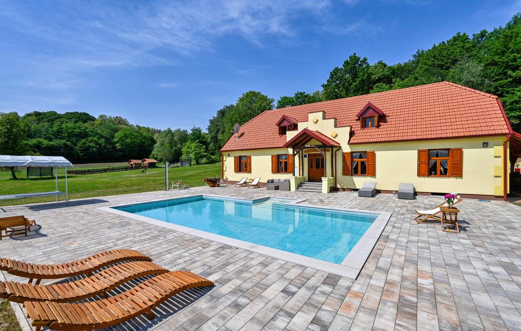 Feriehuset med opvarmet pool ligger i uspolerede, grønne omgivelser på en stor ejendom med mange faciliteter til både børn og voksne. Huset har plads til op til 15 personer.