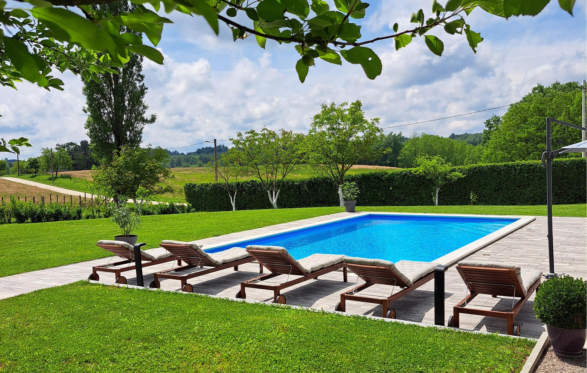 Tilbring en ubekymret og afslappende ferie i dette smukt møblerede sommerhus med udendørs pool.