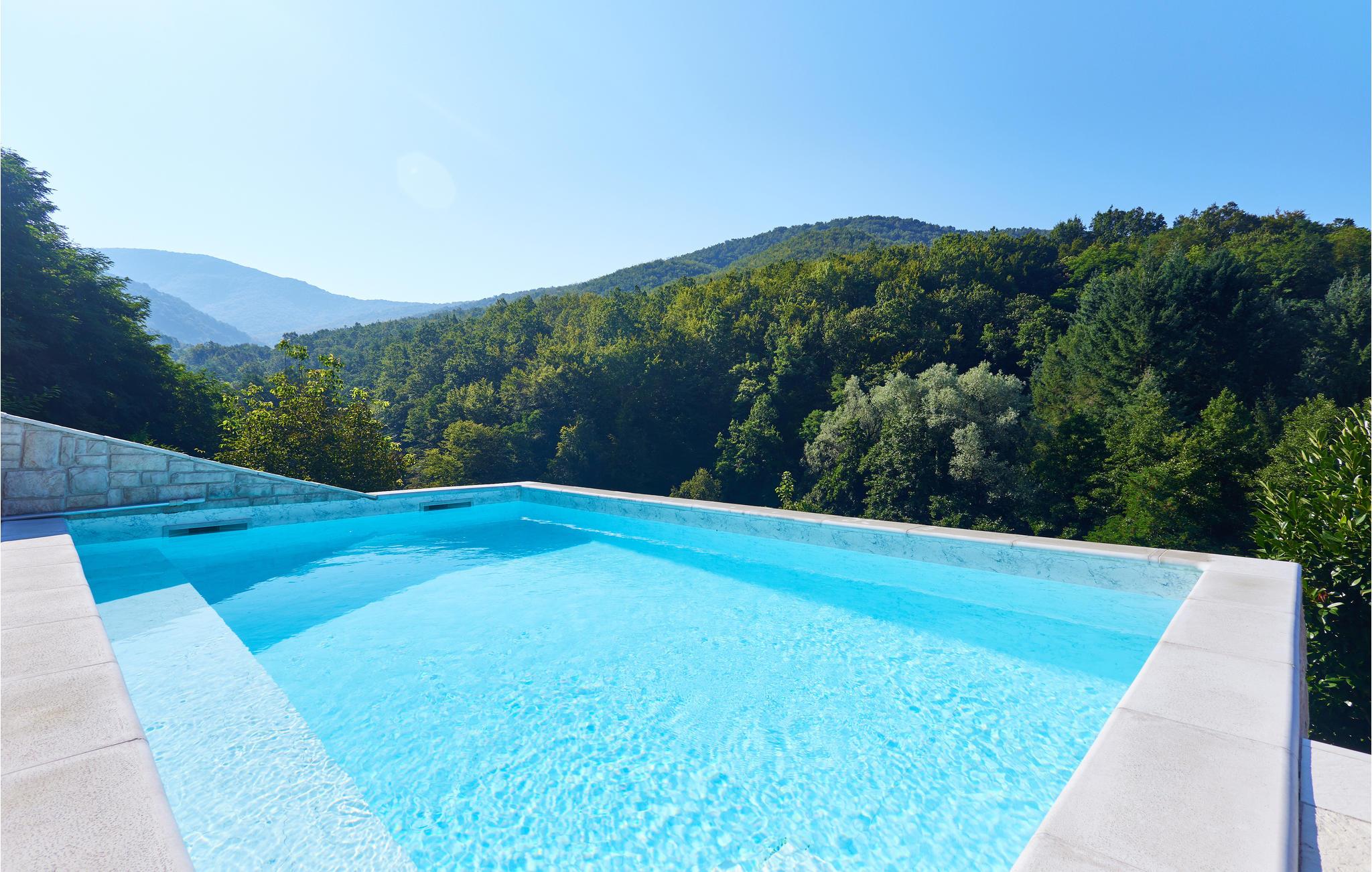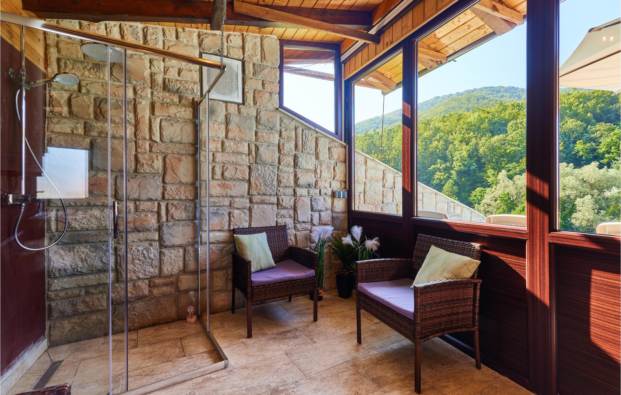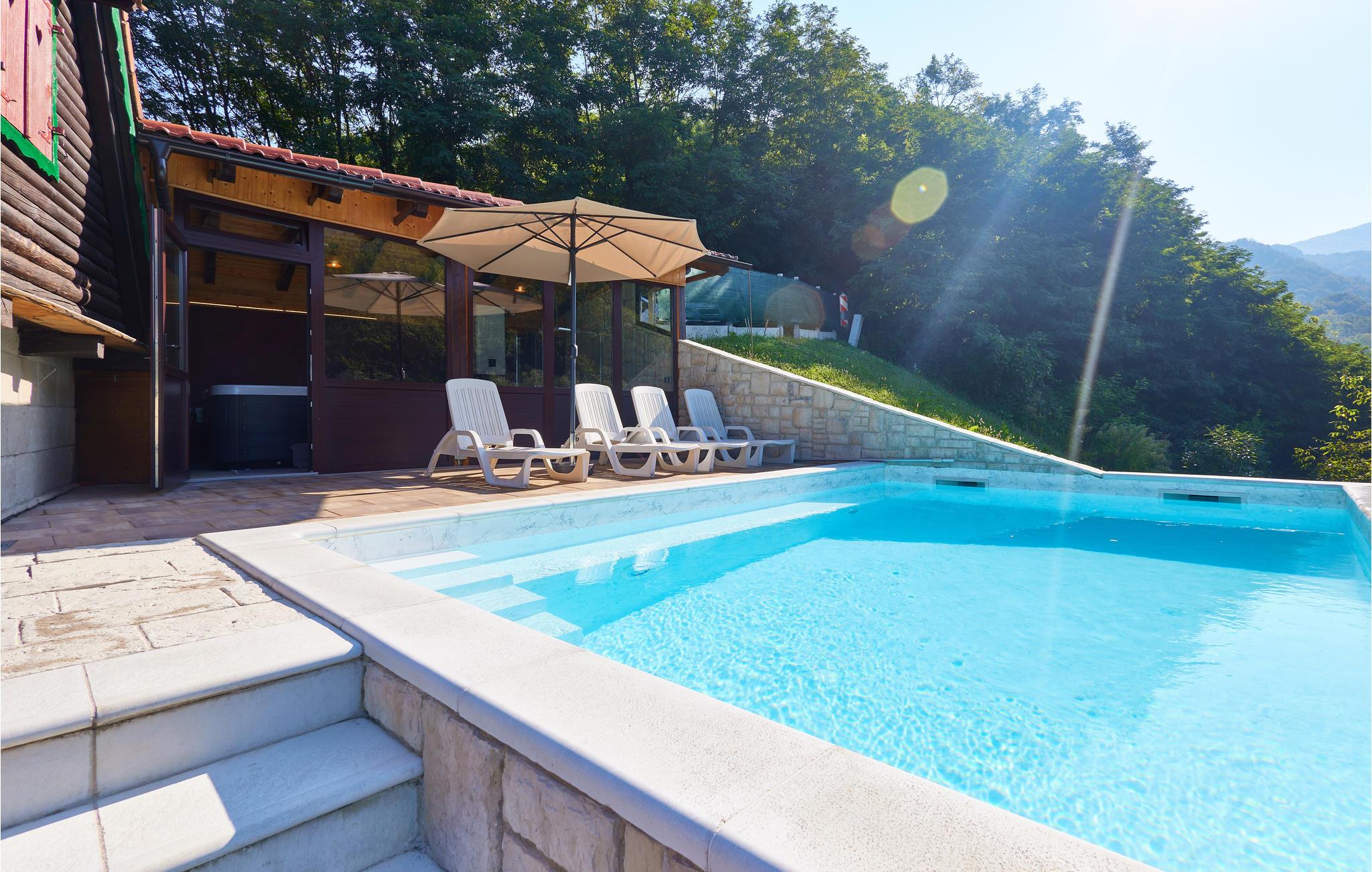 Alle husets rum har trægulve, vægge- og lofter i ægte bjerghyttestil, hvilket skaber en helt særlig og rustik feriestemning. Her kan I slappe af foran pejsen i stuen og nyde udsigten gennem de store vinduer ved spisepladsen under måltiderne. Et kæmpe højdepunkt ved huset er den store udendørspool med masser af liggestole, hvor I kan bade og sole jer i timevis i de idylliske, grønne omgivelser.