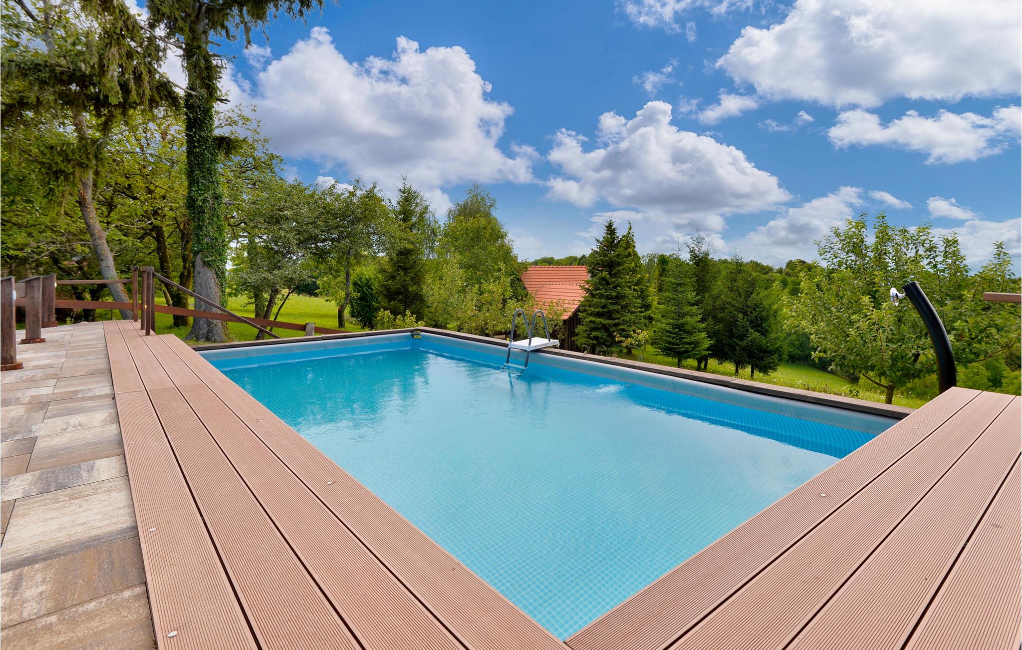Poolen med solterrasse ligger i den store have, midt mellem ??de 2 huse. Smukke, gamle træer vokser på ejendommen, og du har en fantastisk udsigt over landskabet - unge som gamle vil elske en ferie her! I og omkring huset finder du en række aktiviteter: bordtennis, gynger, Playstation4, dart og meget mere.