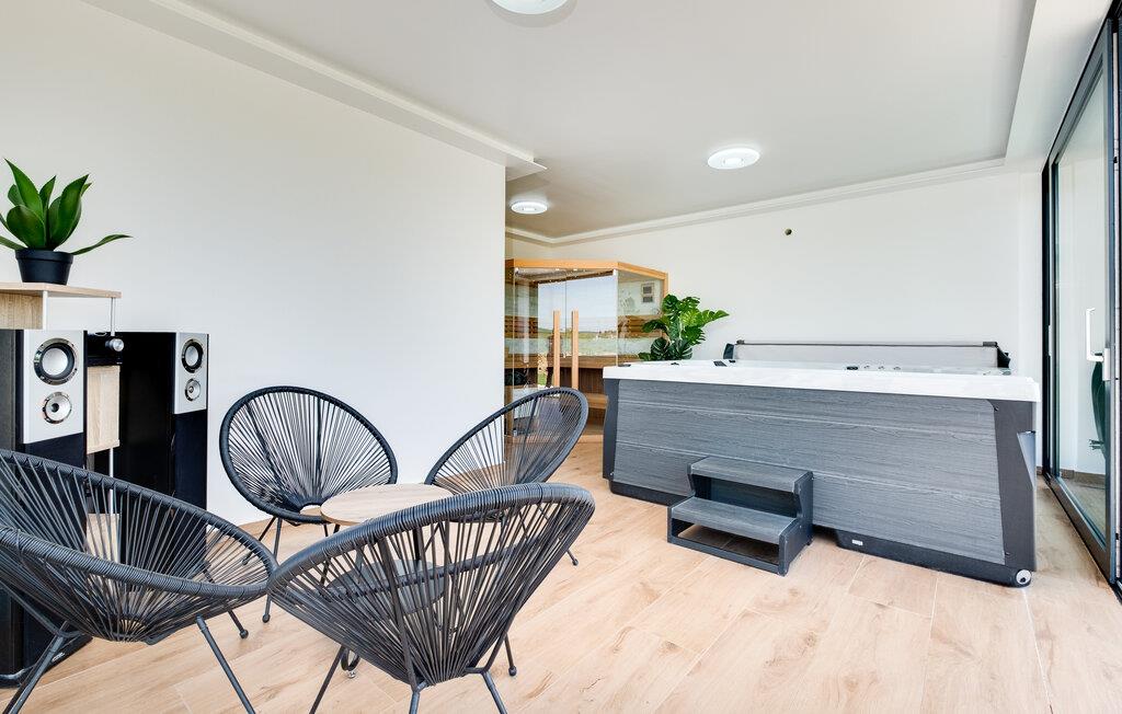 Dette eksklusive feriehus giver jer en ideel kombination af afslapning, privatliv og nem adgang til byens centrum. Oplev moderne livskvalitet på to niveauer. Den åbne opholdsstue er lys, stilfuldt møbleret og tilbyder masser af plads til at slappe af. Brug køkkenet med dets rustikke stenvæg og tilstødende spiseplads til at tilberede jeres feriemåltider. Gør det behageligt i sofaen, eller forkæl jer selv med en pause i jeres egen spa med spabad, sauna og udsigt over de grønne områder.
