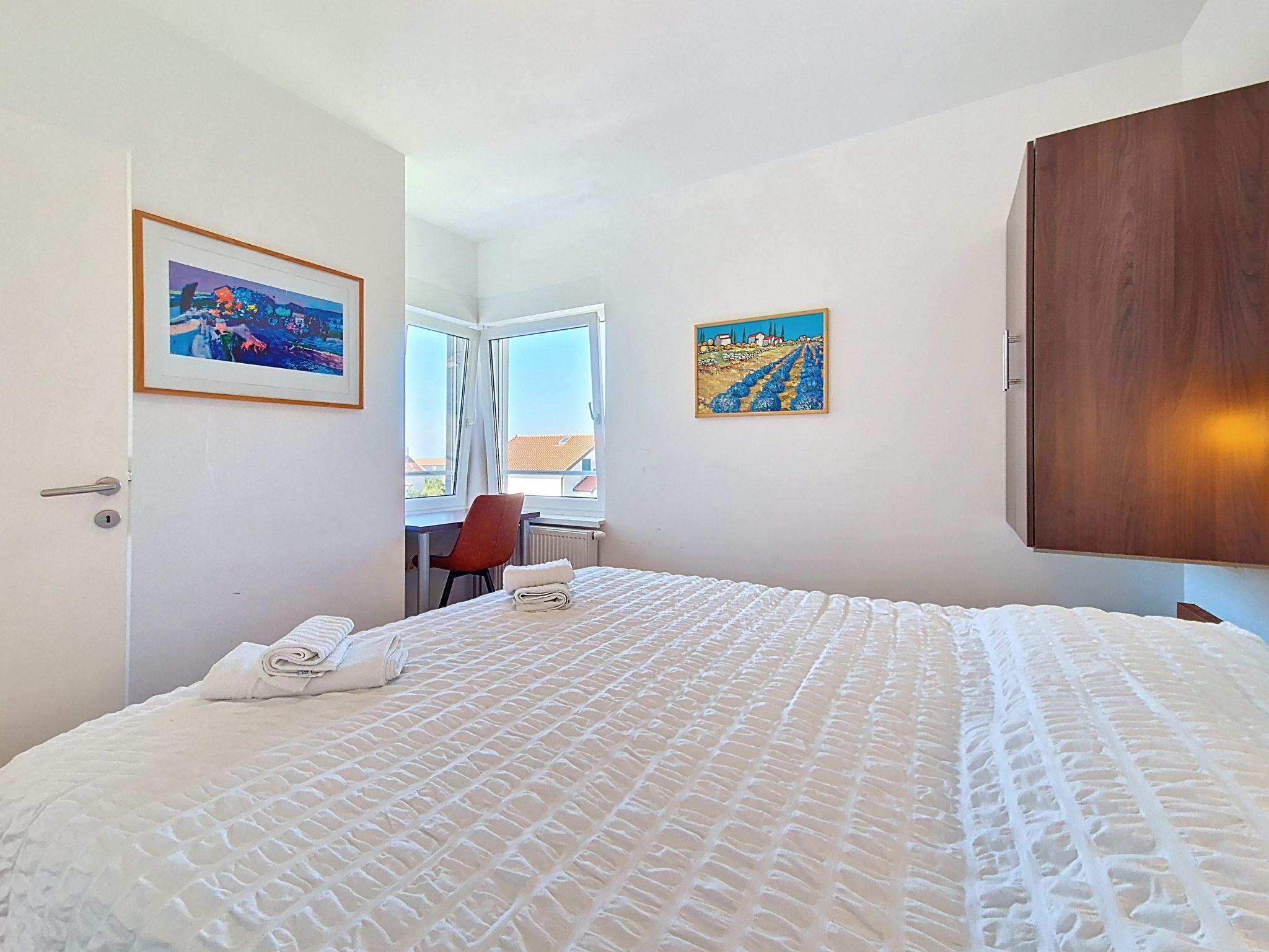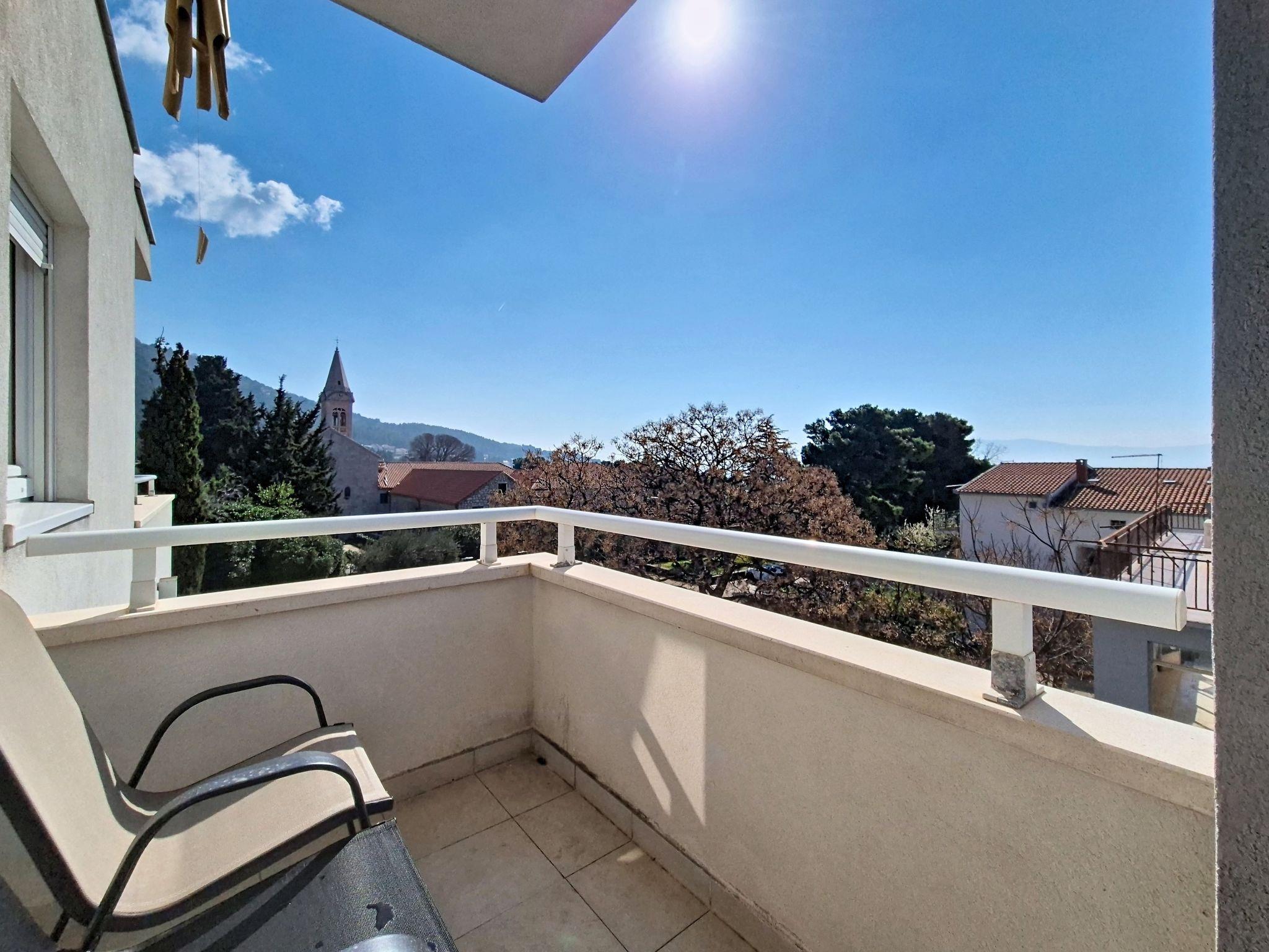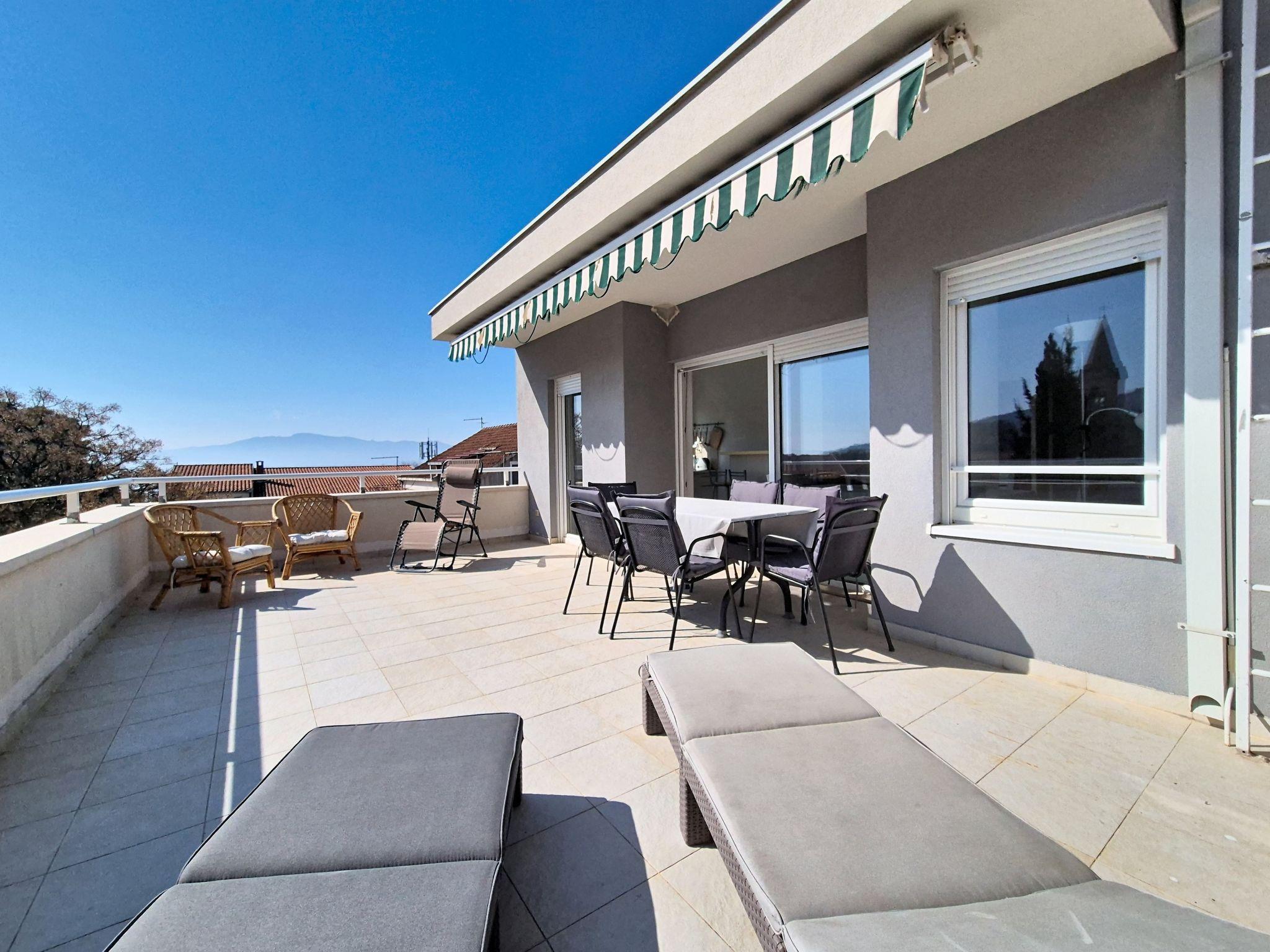 3-room apartment 80 m2 on 2nd floor. Living/dining room with 1 sofabed (140 cm, length 200 cm), satellite TV and air conditioning. Exit to the terrace. 1 room with 2 beds (90 cm, length 200 cm), satellite TV. Exit to the balcony. 1 room with 1 french bed (180 cm, length 200 cm). Open kitchen (oven, dishwasher, 2 ceramic glass hob hotplates, 2 gas rings, toaster, kettle, microwave, freezer). Shower/WC, hip bath/WC. Small balcony 4 m2, large terrace 25 m2. Terrace furniture, balcony furniture. Beautiful panoramic view of the sea. Facilities: washing machine, children's high chair, baby cot. Internet (WiFi, free). Maximum 1 small pet/ dog allowed.
