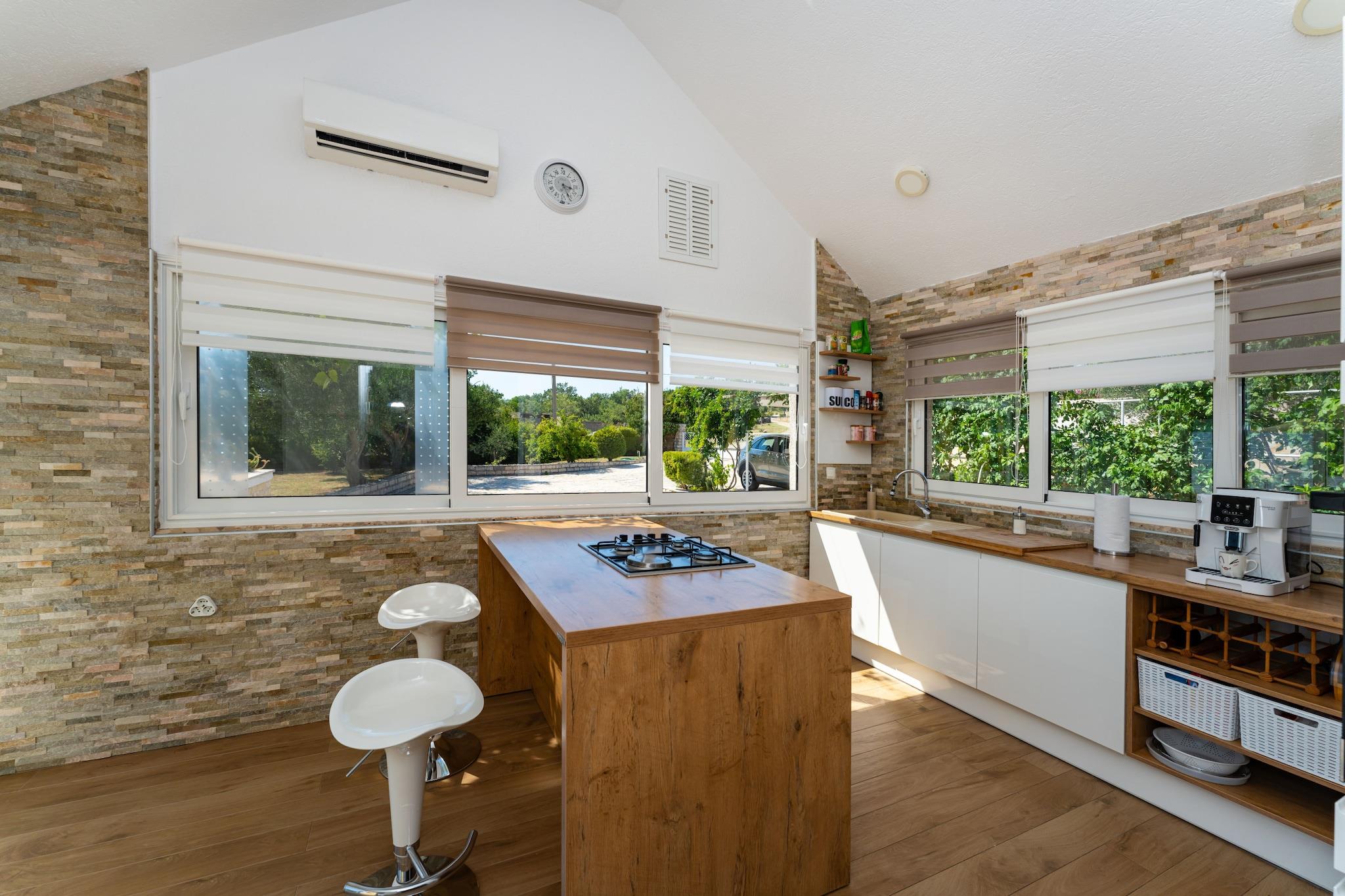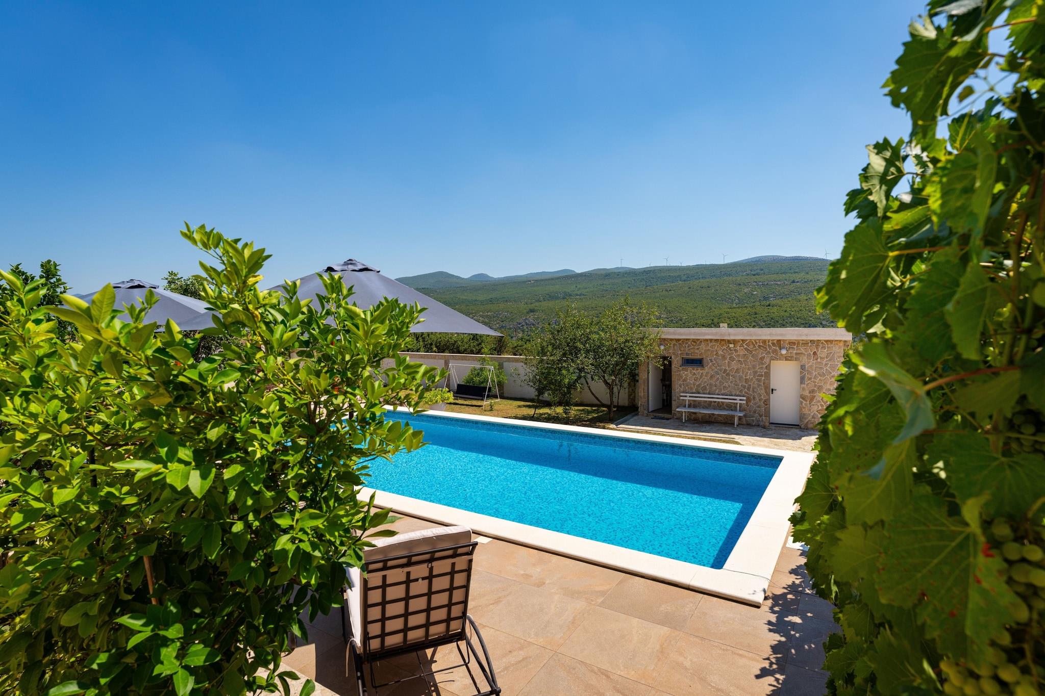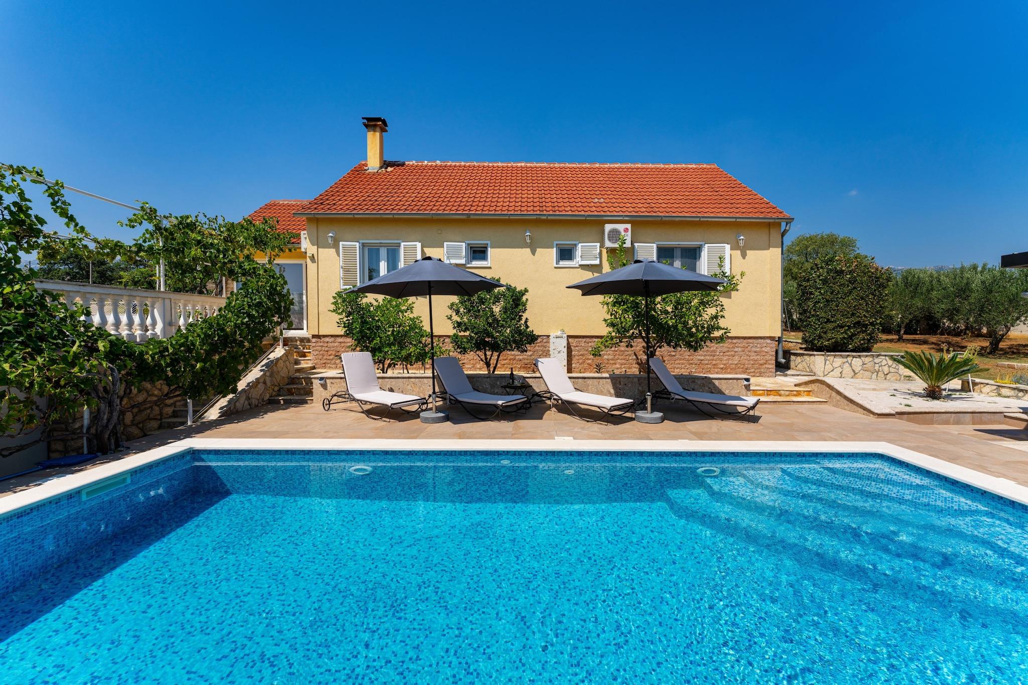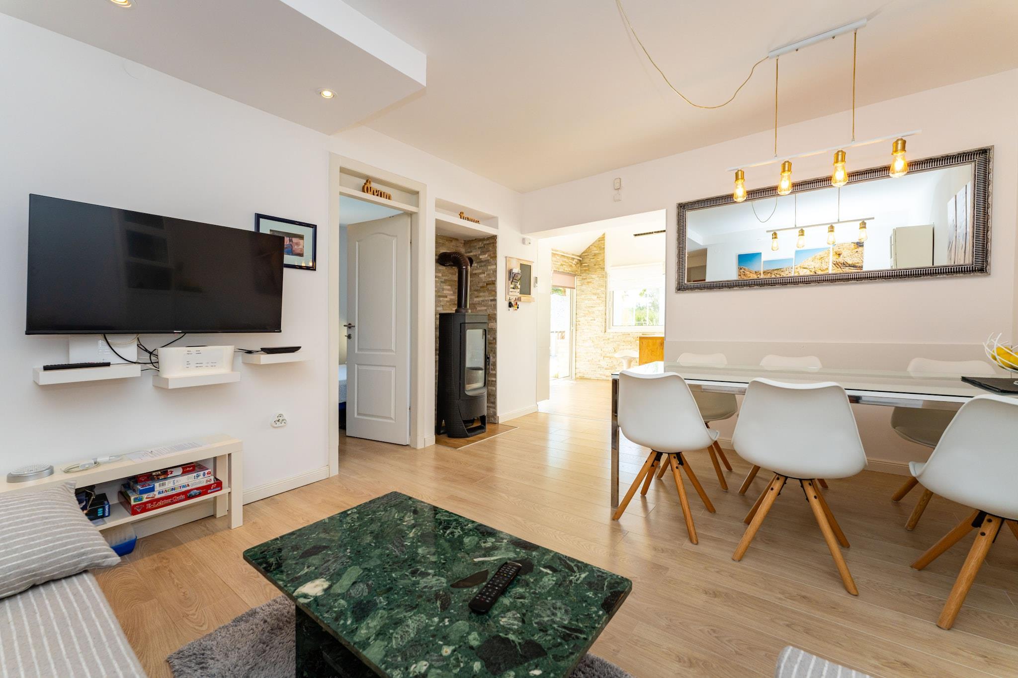 Tag til det fredelige landskab i Zaton Obrovacki og nyd et afslappende ophold i denne charmerende villa med privat pool og fantastisk udsigt over bjergene. Omgivet af en rummelig grund på 2000 m² tilbyder denne fritliggende feriebolig fuldstændig privatliv, hvilket er ideelt for familier eller venner, der søger en fredelig ferie, men samtidig tæt på kysten, der kun ligger 12 km væk. Det smukt indrettede interiør omfatter en lys stue med spiseplads, der åbner direkte ud til terrassen, et fuldt udstyret køkken, tre komfortable soveværelser og to moderne badeværelser. Udenfor er der en privat pool med hydromassage, liggestole og udendørs bruser. Den store overdækkede terrasse har et hyggeligt opholdsområde og spiseplads med grill og pejs, der er perfekt til lange sommeraftener under stjernerne. Kun 2,5 km væk ligger byen Obrovac, der byder på butikker, restauranter og nødvendige tjenester. Området byder på mange muligheder for udendørsaktiviteter, fra rafting og cykling til udflugter til nærliggende nationalparker som Paklenica, Krka og Plitvicka Jezera. Uanset om du ønsker at slappe af ved poolen eller udforske Kroatiens naturlige skønhed, tilbyder denne villa det bedste fra begge verdener.