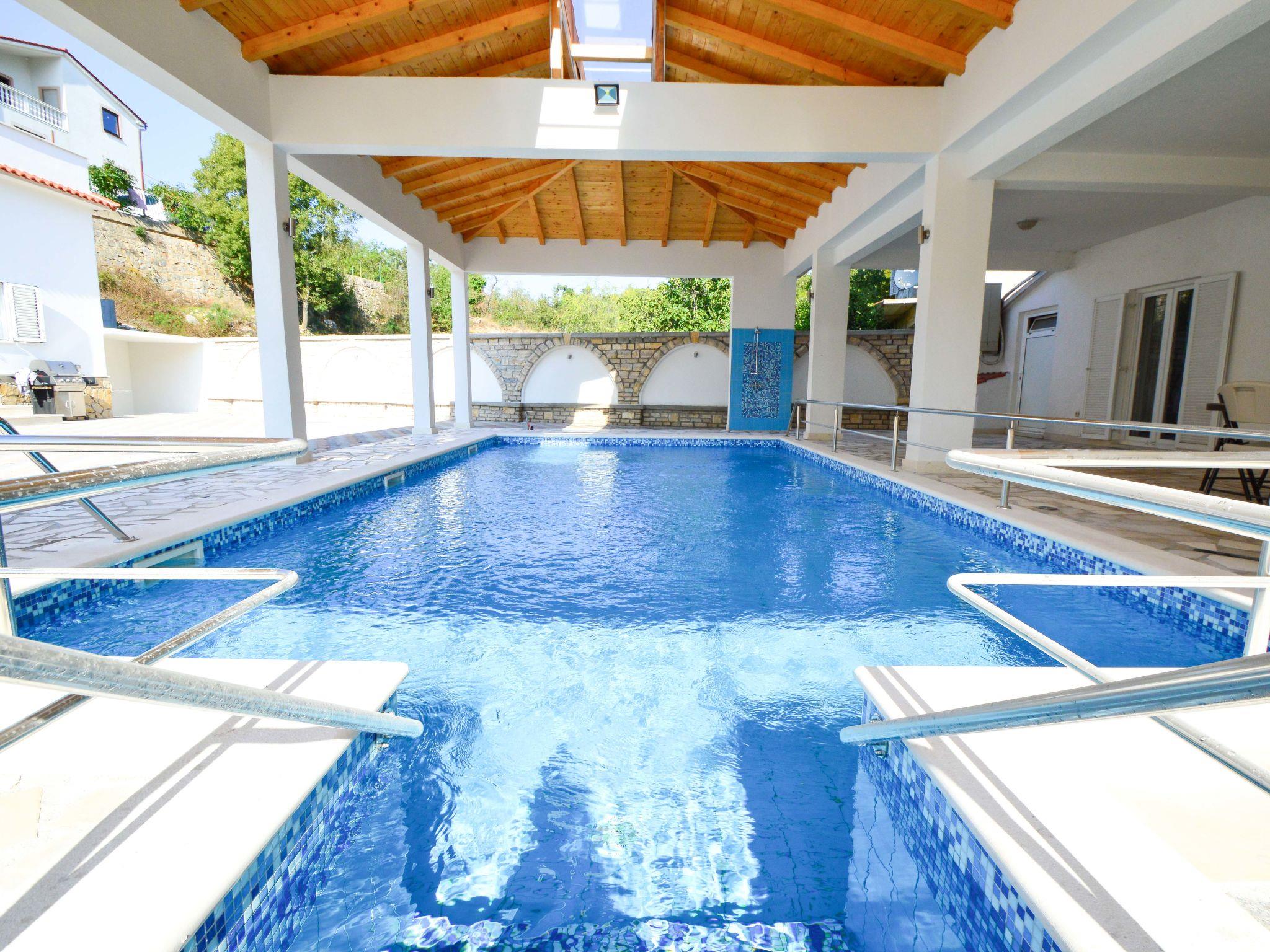 Beautiful single-family house "Villa Kursar", 3 storeys. 700 m from the centre of Zaton, in a sunny position, 780 m from the sea, 2 km from the beach. For shared use: tennis, basketball. Private: property 450 m2, swimming pool angular, heated (9 x 4 m, 38 m2, depth 150 cm, seasonal availability: 01.Jan. - 31.Dec.) with internal staircase. WC in the pool area, outdoor shower, hot tub, terrace (80 m2), garden furniture, barbecue, pool maintenance by the owner/gardener. In the house: internet access, washing machine, tumble dryer. Parking (for 6 cars) at the house on the premises. Shop 750 m, restaurant 800 m, bus stop 600 m, pebble beach 2.5 km, concrete beach 2 km. Nearby attractions: NP Krka 20 km. The house consists of 3 apartments rented as one unit. Each apartment with external and separate entrance. It is necessary to announce 7 days in advance if the pool heating is required. Available for shared use with apartments ref. HR4410.109, at 60 m from the house: table tennis, table football, billiard table, fitness, sep. WC, air conditioning (included).