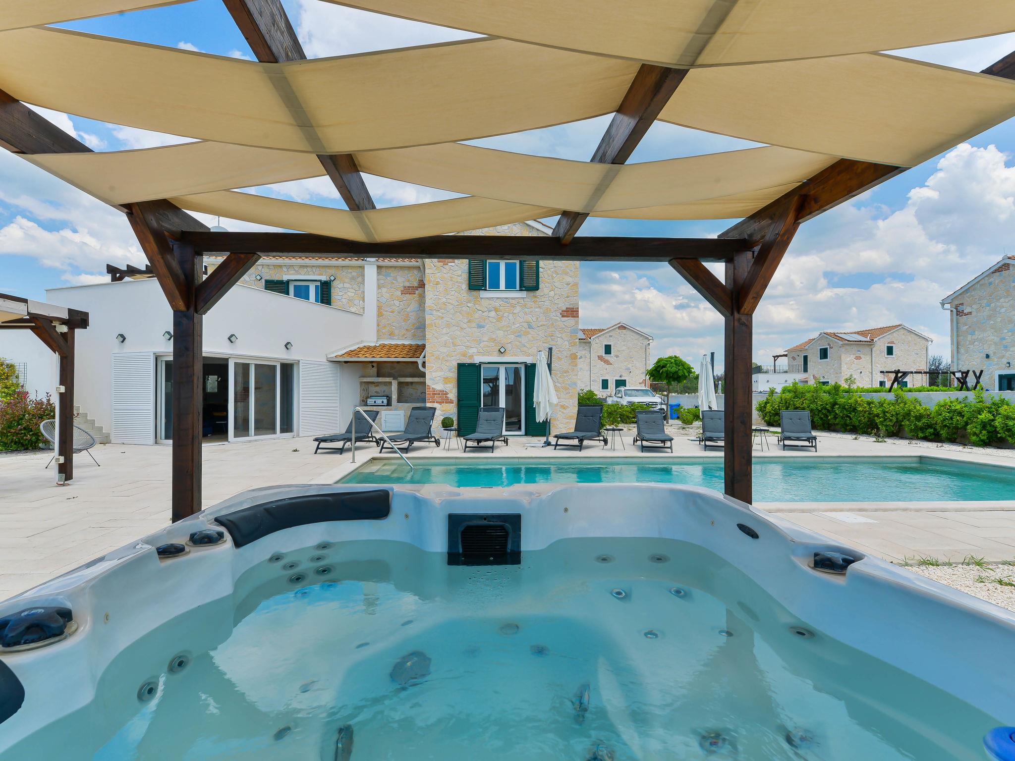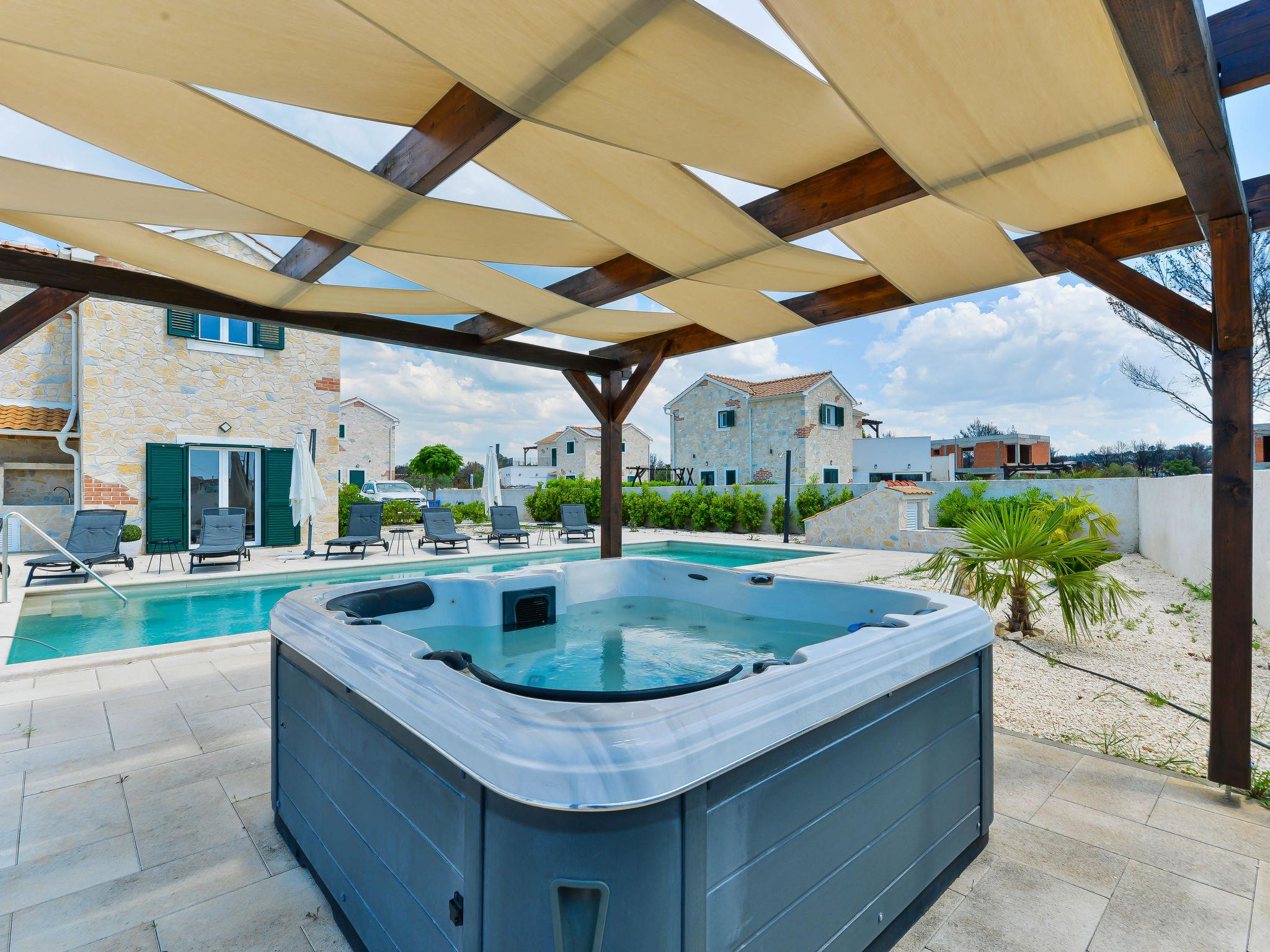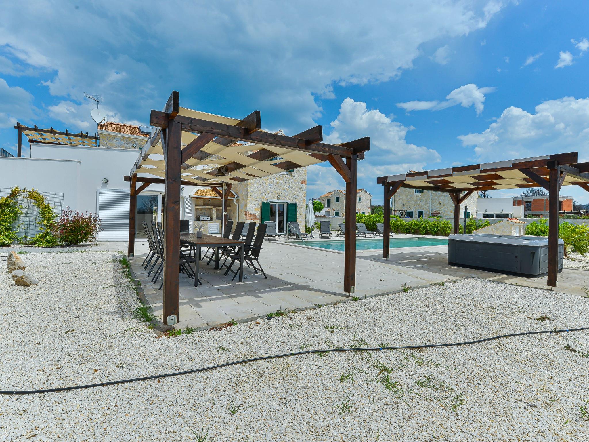 Villa "Violet", 2 storeys, built in 2018. 1.5 km from the centre of Zaton, in a quiet, sunny position, 1.5 km from the sea, 2.5 km from the beach. Private: swimming pool angular (10 x 4 m, depth 150 cm, seasonal availability: 01.May. - 30.Sep.) with internal staircase. Outdoor shower, hot tub, pergola, garden furniture, barbecue. In the house: internet access, sauna, washing machine, tumble dryer. Parking (for 3 cars) at the house on the premises. Shop 1.5 km, restaurant 1.5 km, bus stop 450 m, pebble beach 3 km, concrete beach 2.5 km. Nearby attractions: NP Krka 20 km. Please note: suitable for families.