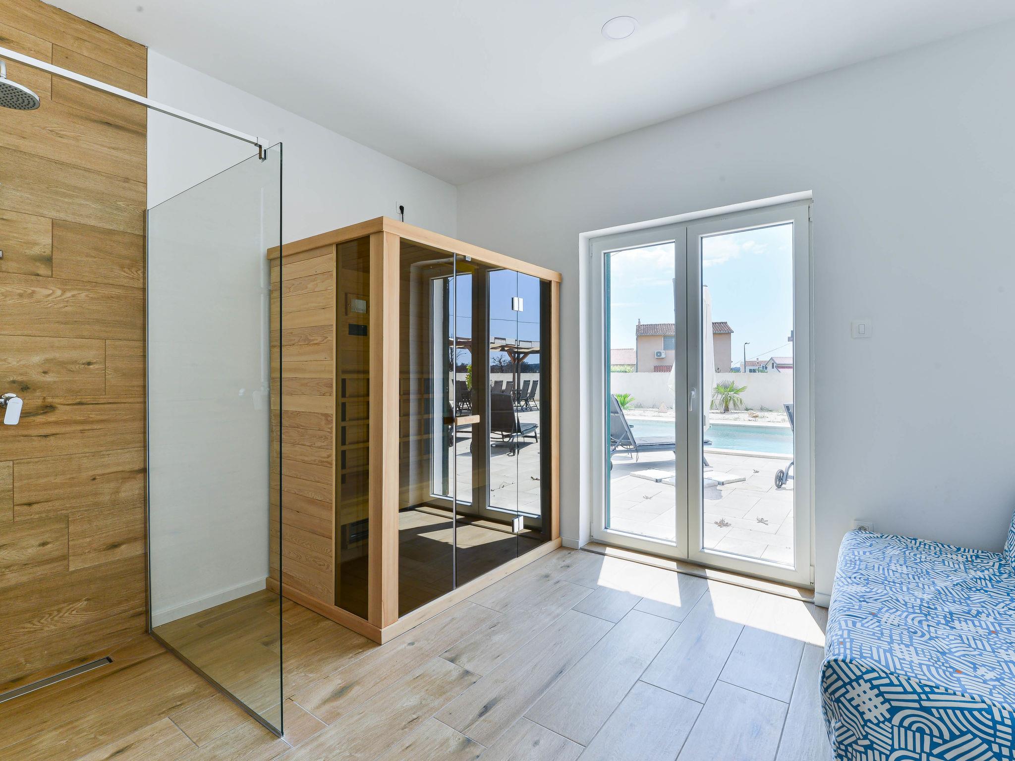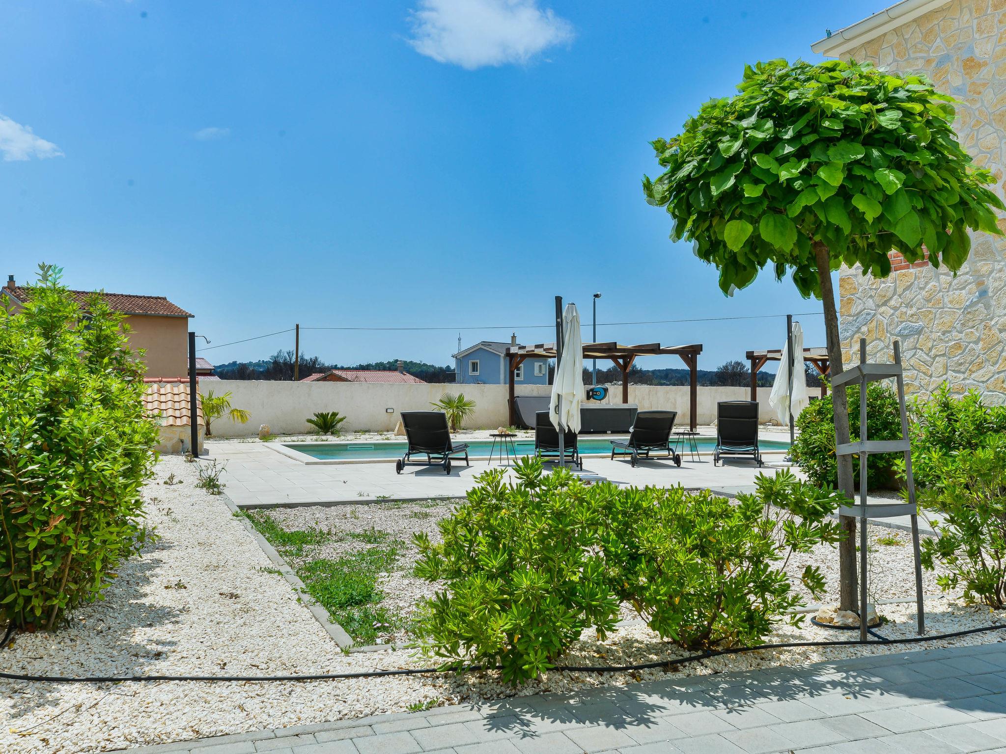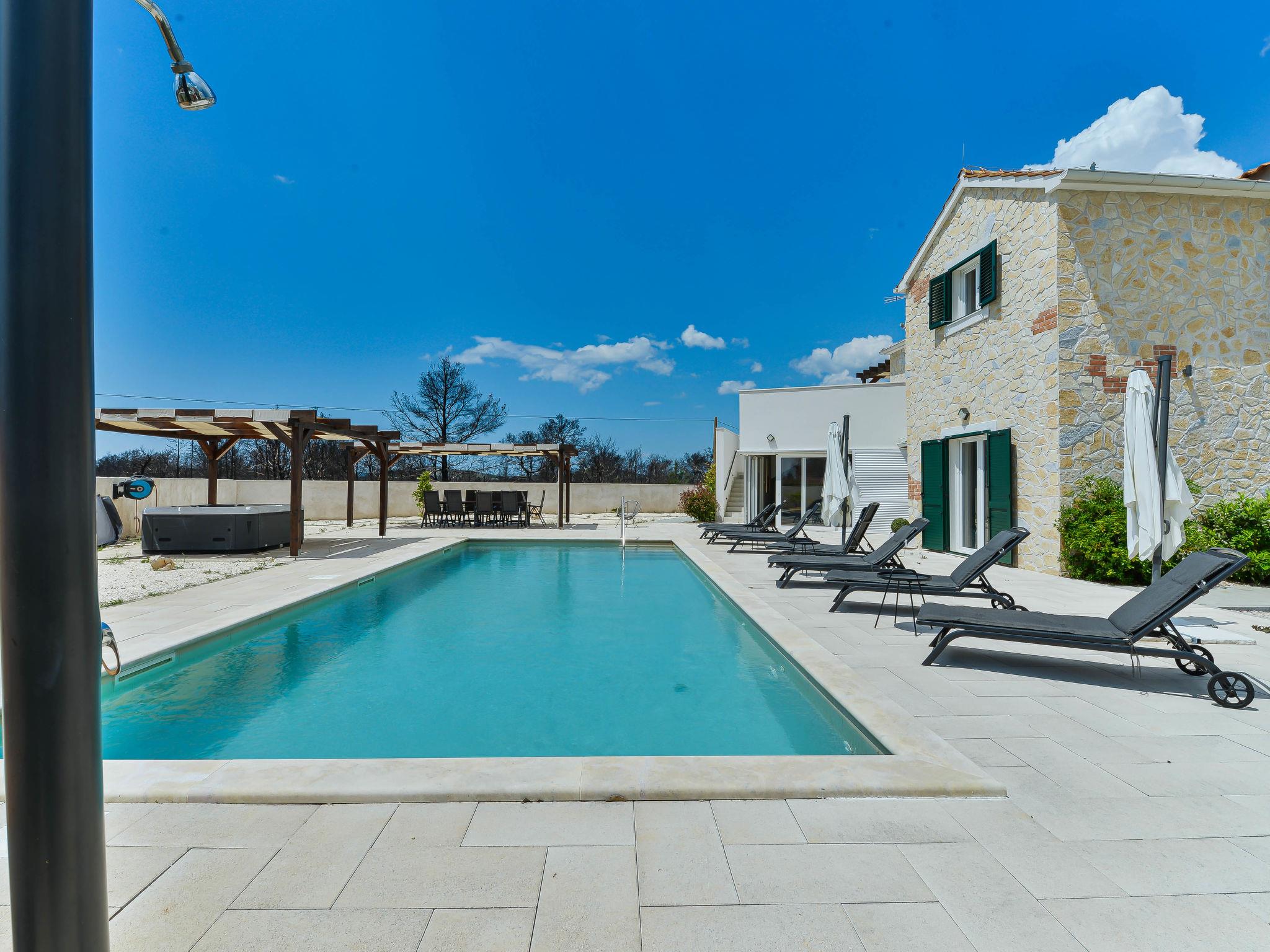 Villa "Violet", 2 storeys, built in 2018. 1.5 km from the centre of Zaton, in a quiet, sunny position, 1.5 km from the sea, 2.5 km from the beach. Private: swimming pool angular (10 x 4 m, depth 150 cm, seasonal availability: 01.May. - 30.Sep.) with internal staircase. Outdoor shower, hot tub, pergola, garden furniture, barbecue. In the house: internet access, sauna, washing machine, tumble dryer. Parking (for 3 cars) at the house on the premises. Shop 1.5 km, restaurant 1.5 km, bus stop 450 m, pebble beach 3 km, concrete beach 2.5 km. Nearby attractions: NP Krka 20 km. Please note: suitable for families.