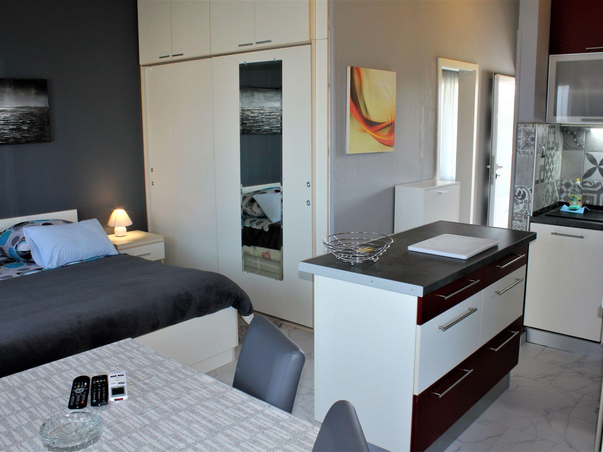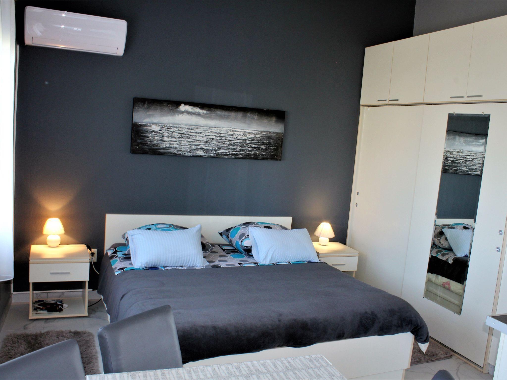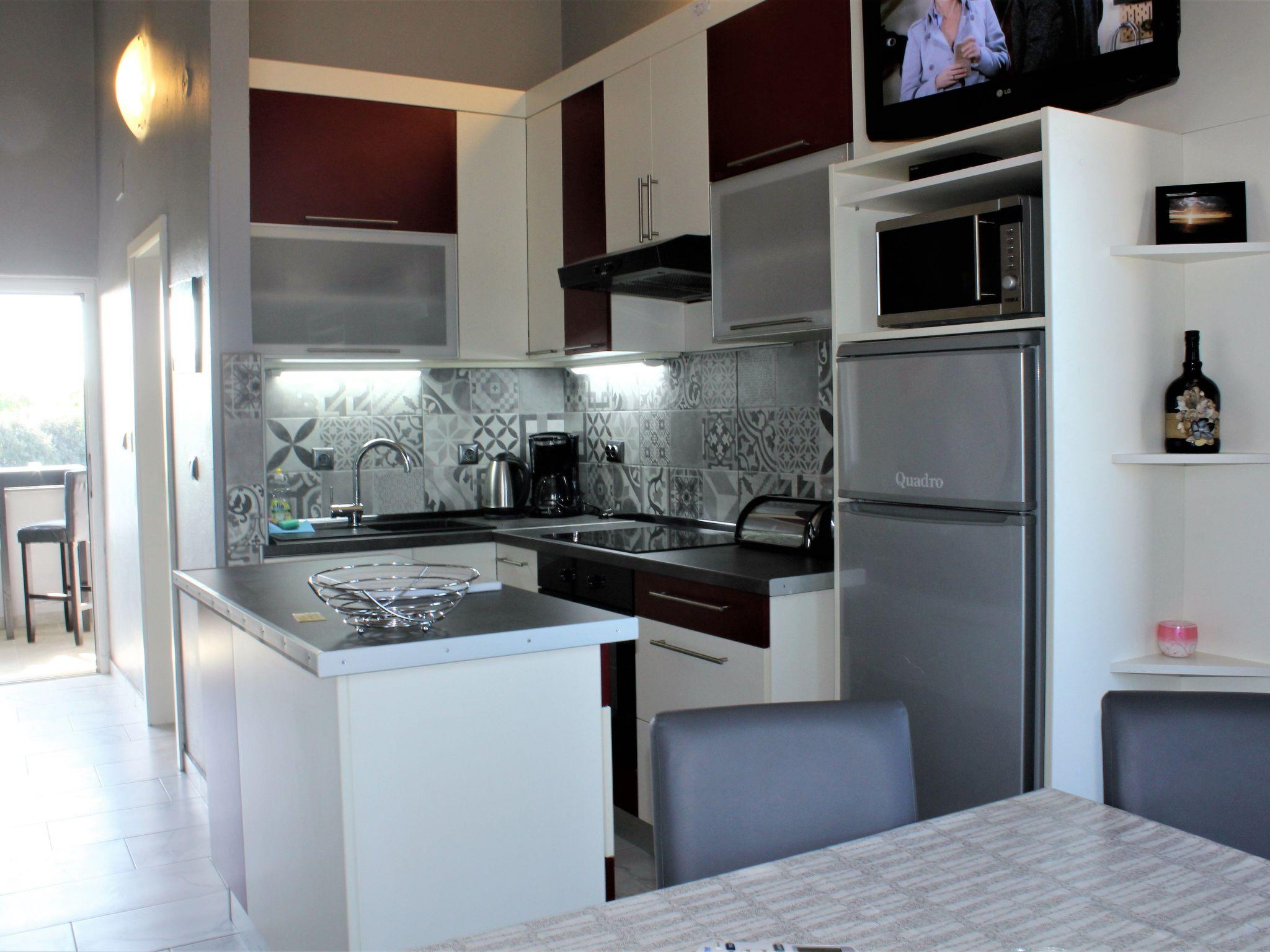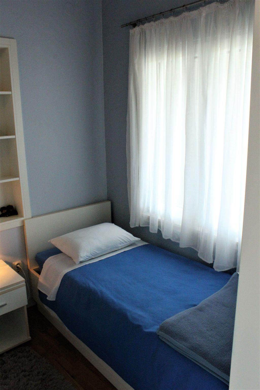 The apartment is located on the first floor and its overall size is 44 m2 (including the balcony). It has one bedroom and can accommodate four persons. There is a double bed in the living area and the bedroom is furnished with two single beds. The kitchen is fully equipped, complete kitchen utensils, microwave and electric oven, gas cooking plate, electric kettle, toaster, fridge with freezer, refrigerator water. The apartment is air conditioned, equipped with digital satellite system (approximately 2000 free channels), DVD player and 26 “LED TV. Internet access via WLAN. In the bathroom there is a washing machine which is used exclusively by guests of the apartments.