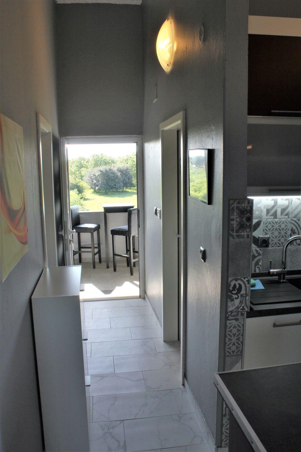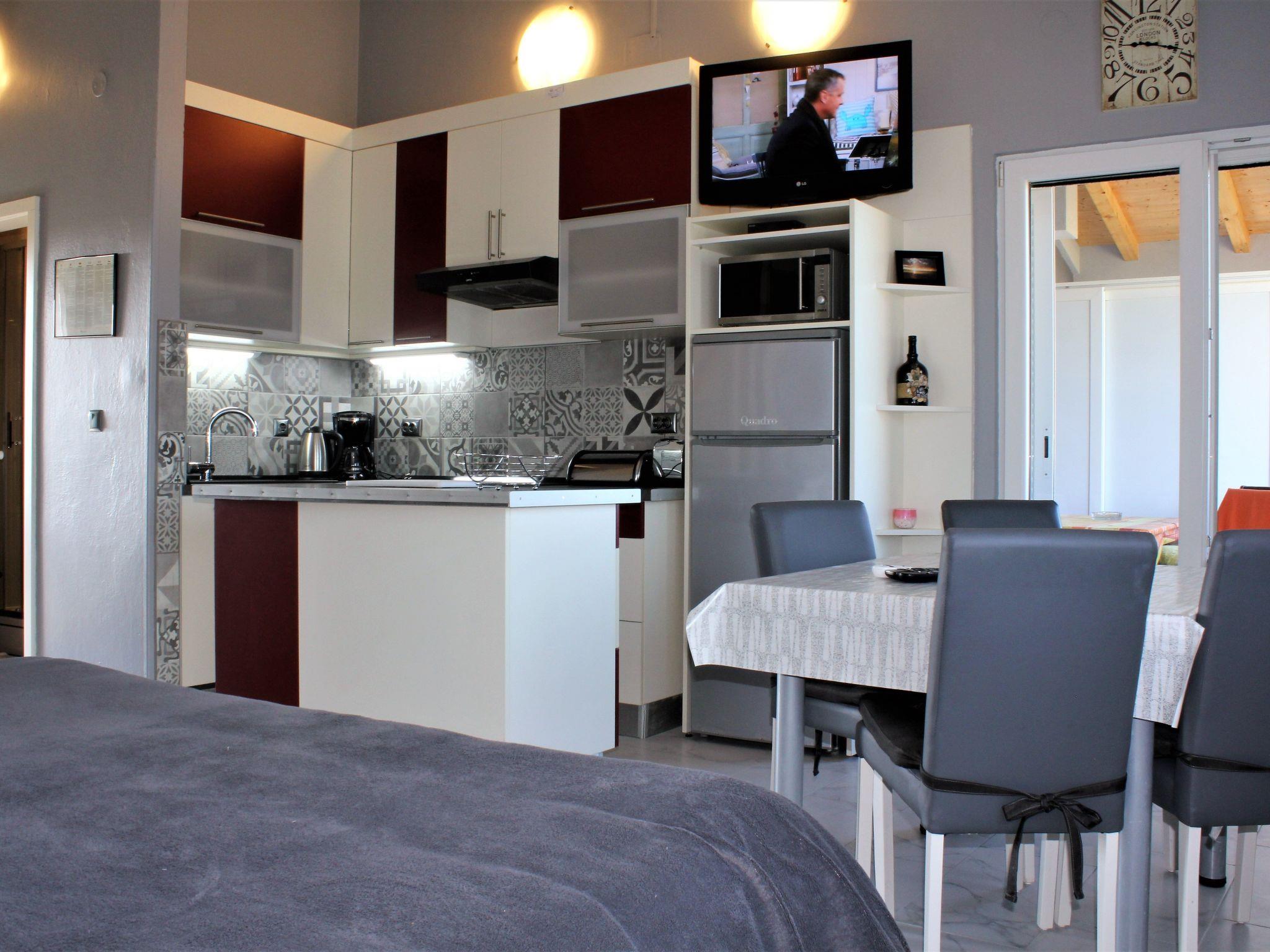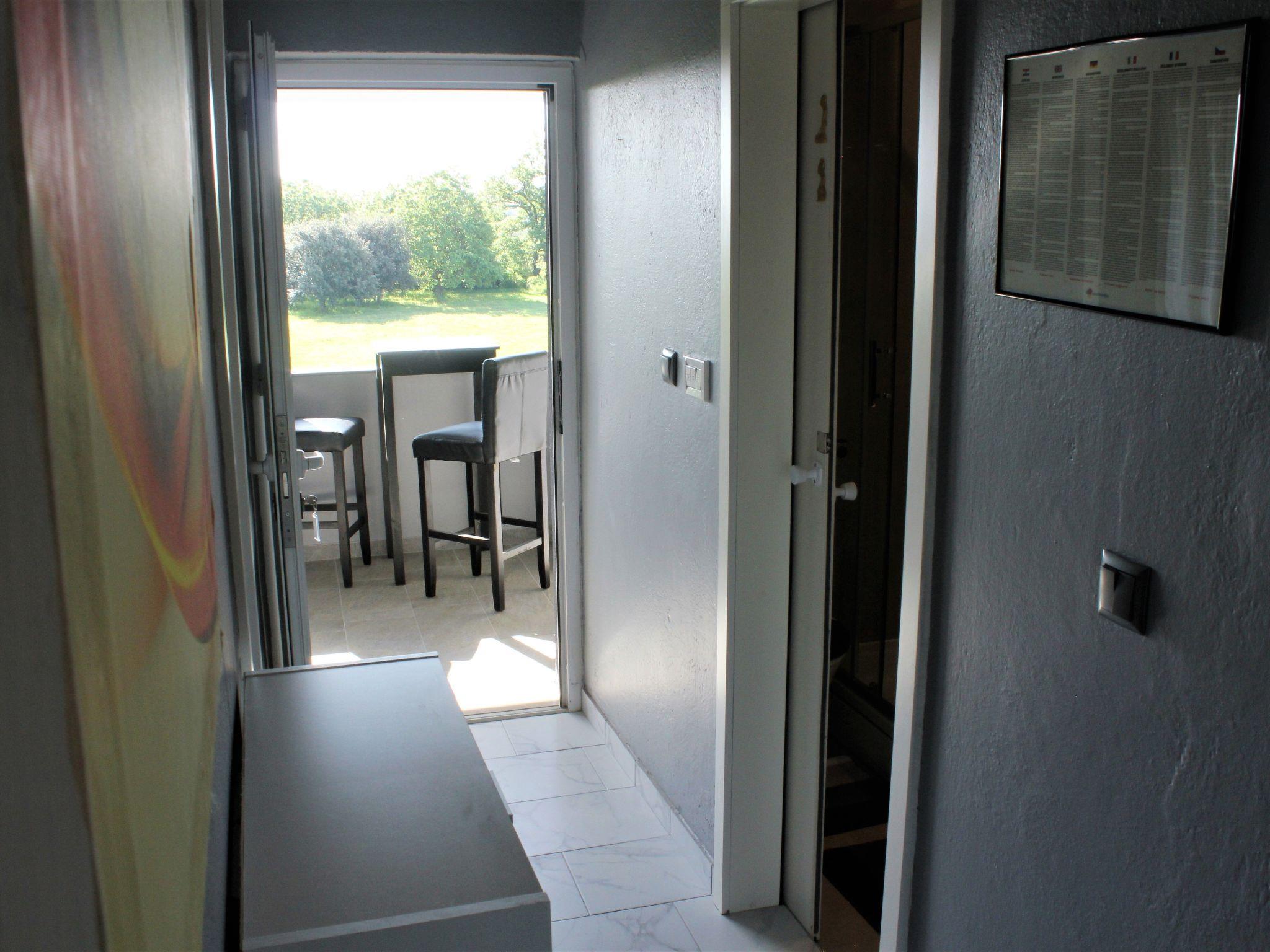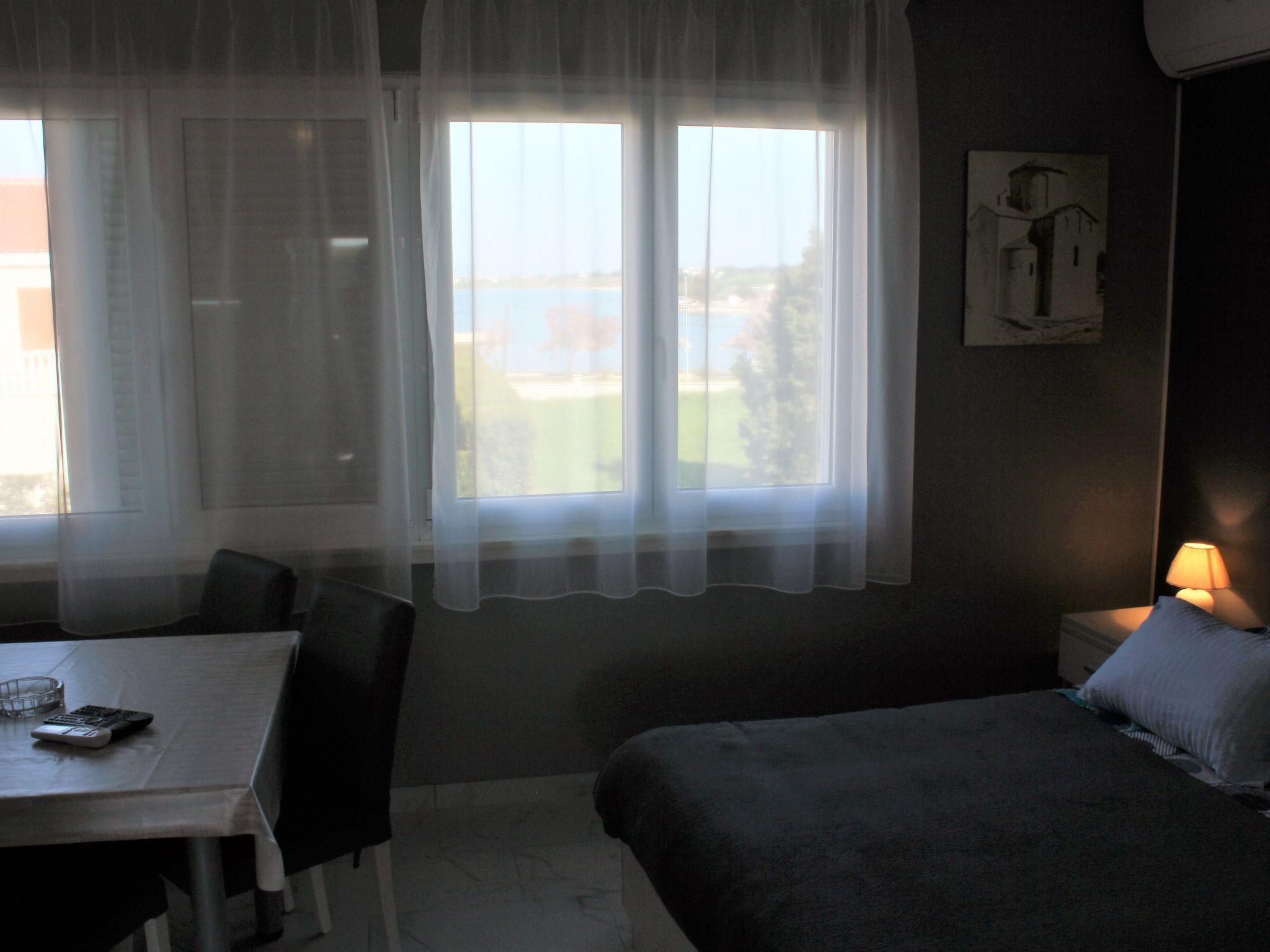 The apartment is located on the first floor and its overall size is 44 m2 (including the balcony). It has one bedroom and can accommodate four persons. There is a double bed in the living area and the bedroom is furnished with two single beds. The kitchen is fully equipped, complete kitchen utensils, microwave and electric oven, gas cooking plate, electric kettle, toaster, fridge with freezer, refrigerator water. The apartment is air conditioned, equipped with digital satellite system (approximately 2000 free channels), DVD player and 26 “LED TV. Internet access via WLAN. In the bathroom there is a washing machine which is used exclusively by guests of the apartments.
