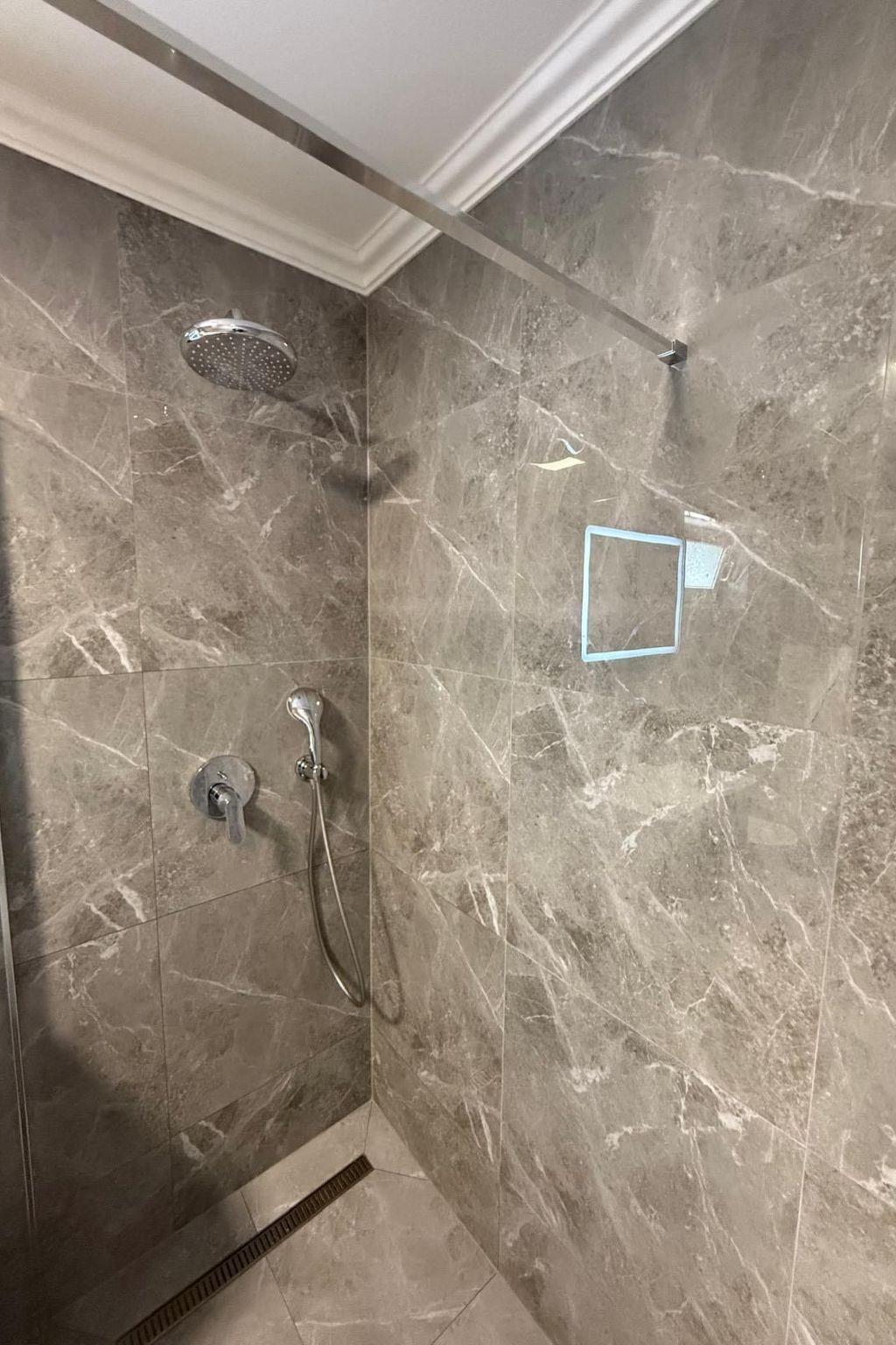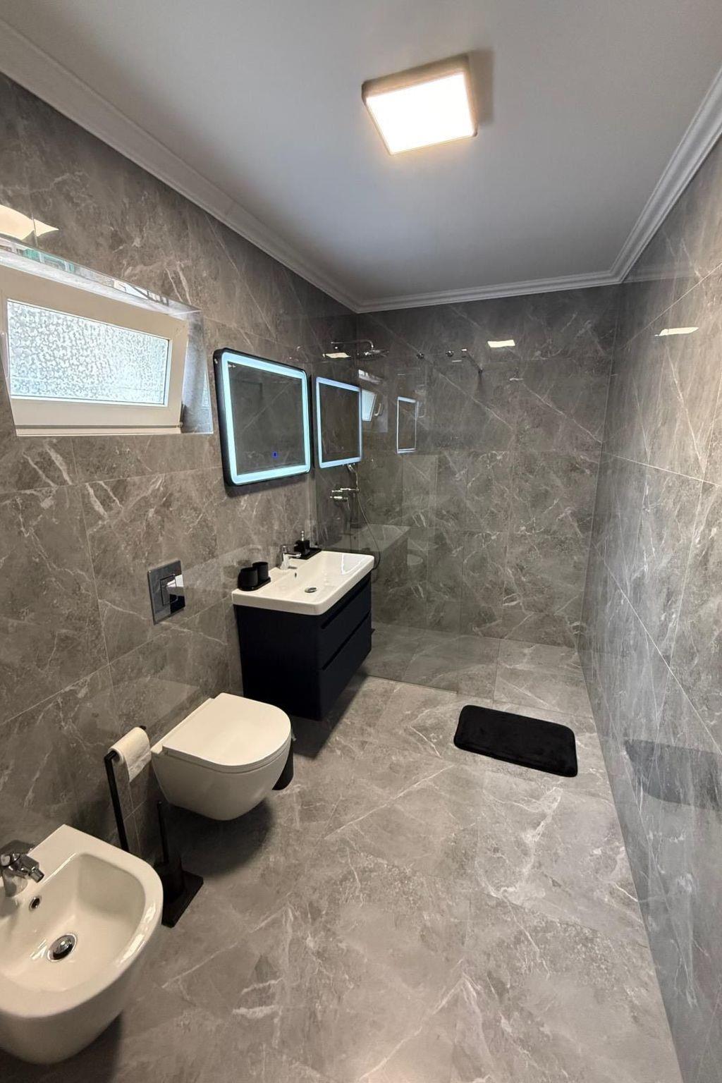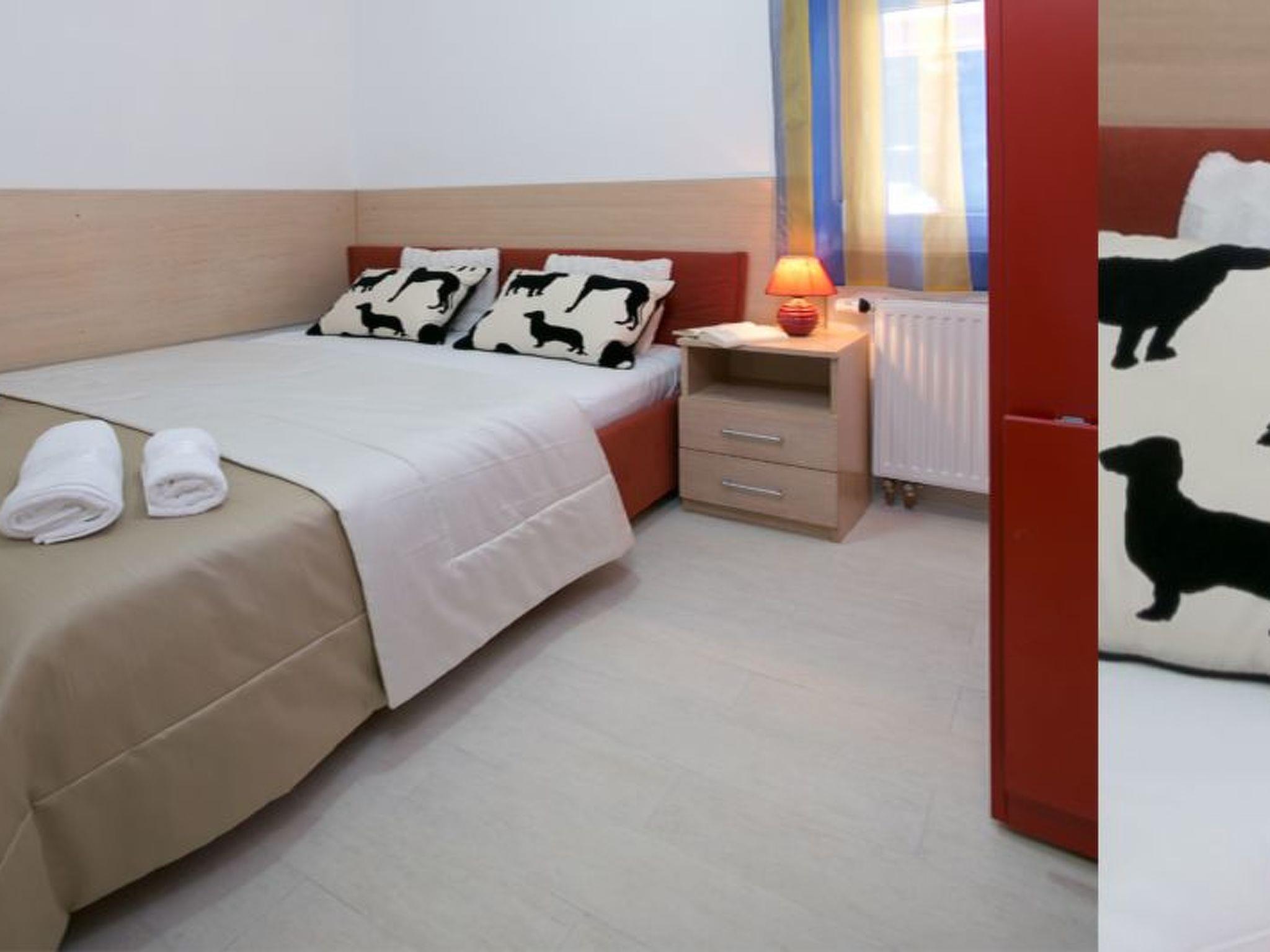 The apartment has 100m2 Is intended for 4 people ( + 2 child possible under 14 years ) and consist of 3 bed rooms with double bed, 2 bathrooms ( on with shower other only toilet ) , open space living room and kitchen ( dish washer, Owen, hob, coffee-machine, microwave, large fridge ) large balcony with table and chairs and sea view, air-condition, washing machine, SAT TV. outside grill.